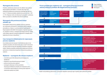 Wymagania dla surowca Produkty rybołówstwa dostarczane do zakładu mają spełniać Etapy produkcji Punkty kontrolne Wymagania Proces produkcyjny wędzenia ryb – wymagania dotyczące kontroli własnej istotnych punktów dla bezpieczeństwa żywności Rozporządzenie 853/2004 m. in świeże ryby mają mieć temperaturę zbliżoną do temperatury topniejącego lodu lub max 2 °C. Mrożone produkty rybołówstwa powinny mieć -18ºC (+/-3ºC). Mają być wolne od widocznych pasożytów i substancji, które są uważane za szkodliwe dla zdrowia ludzkiego. Wymagania dla pomieszczeń/miejsc obróbki ryb Dostawa i magazynowanie świeżej ryby w skrzynkach z jednej firmy Czystość Kryteria świeżości Temperatura Max. 3 dni magazynowania Max. 2 °C lub w lodzie Patroszenie Wizualna kontrola pasożytów Usunięcie części zawierające pasożyty Dostawa i magazynowanie mrożonej ryby Temperatura Max. -18 °C Poszczególne etapy procesu obróbki surowca tj. patroszenie, czyszczenie, porcjowanie i ewentualne solenie mają być Krojenie Wizualna kontrola pasożytów Usunięcie części zawierające pasożyty Solenie Zawartość soli Solenie na sucho: 2 godziny Solenie na mokro: 8-12 godzin, 6-8 % Wędzenie Temperatura Czas Wędzenie na gorąco: 70 – 85 °C CCP – temperatura w centrum 60 °C lub temperatura procesu >70 °C Wędzenie na zimno między: 20 – 30 °C, 18– 48 godzin (w zależności od grubości elementów) Magazynowanie/schładzanie Temperatura Czas Bez schładzania: max. do 4 h potem < 7°C Ryby wędzone na gorąco: max. 7 dni Ryby wędzone na zimno: do 14 dni Badania potwierdzające czystość powierzchni roboczych, produktów Raz na rok badania mikrobiologiczne: - ogólna liczba drobnoustrojów - Enterobacteriaceae - Salmonella - Listeria Badanie wody Spełnienie wymagań dla wody pitnej prowadzone w miejscu/ w pomieszczeniach spełniających Rozporządzenie 852/2004: Pomieszczenia mają być wyznaczone, zamykane na klucz i z dostępem do bieżącej zimnej i ciepłej wody. Należy zapewnić zamykane pojemniki na odpady, które będą łatwe do mycia i dezynfekcji. Czas transportu/składowania do rozpoczęcia procesu wędzenia Czas składowania lub transport nieschłodzonej ryby to max 1godzina.od połowu do dostarczenia ryby na ląd. Po dostarczeniu ryby na ląd musi być jak najszybciej schłodzona (zasypana lodem). Mrożone produkty rybołówstwa składowane lub transportowane w temperaturze zgodnej z temperaturą podaną na etykiecie. Wędzenie – wymagania dla obszaru/wędzarni Pakowanie/sprzedaż • utwardzony grunt dla dłuższej lub powtarzającej się działalności • bezpyłowe masy dla jednorazowych działań Weryfikacja • pokrycie dachowe przy wędzarni • wymagania dotyczące ochrony produktu: ekspozycja/schładzanie produktu do temperatury zew. w warunkach zapewniających ochronę przed wpływem środowiska (opady, kurz, ptaki). Nadzór nad produkcją, pakowaniem, usuwaniem odpadów sprawuje organ inspekcji (plan pobierania próbek). Wymagania dla oznakowania Cel tego projektu Focus on Food Etykietowanie musi być zgodne z odpowiednimi wymogami UE lub Food Hygiene and Food Safety in the Baltic Region równoważnymi przepisami. Oprócz wszystkich niezbędnych infor- (Bezpieczeństwo i Higiena Żywności w Regionie Morza macji na produkcie (nazwa produktu, nazwa i adres producenta, Bałtyckiego - jest wspólnym projektem unijnym niemieck- cena), muszą być także podane informacje dotyczące oznakowania ich, polskich i szwedzkich Organów kontrolnych w sektorze ryb (łacińska nazwa, data produkcji/mrożenia, metoda produkcji, spożywczym. Projekt został zatwierdzony w ramach Programu połowu “złowione w Północnym Atlantyku” lub odłowu “akwakul- South Baltic Cross-border Co-operation Programme 2007- tura”). 2013. SWEDEN Małe wędzarnie ryb działające na poziomie detalicznym W projekcie Focus on Food bierze udział 14 uczestników. Weryfikacja kontroli własnych Głównym celem projektu jest osiągnięcie szerokiego poro- Podmioty działające na rynku spożywczym powinny ustanowić, zumienia i jednolitej interpretacji wspólnotowego prawa wdrożyć i utrzymywać stałą procedurę lub procedury oparte na żywnościowego, wymiana doświadczeń pracowników zasadach HACCP. Prowadzenie dziennych zapisów temperatur m. związanych z nadzorem nad bezpieczeństwem żywności oraz in. dostarczonego surowca na wejściu, produktu, temperatury mier- zwiększenie zainteresowania kwestiami dotyczącymi higieny zonej w centrum produktu oraz temperatury procesu wędzenia. żywności wśród przedsiębiorców i konsumentów. Mikrobiologiczne badania właścicielskie prowadzone minimum raz w roku w akredytowanym laboratorium. Contact Lead partner Wymagania dotyczące pracowników Environment Department Tel. +46 40 34 20 83 Szkolenia pracowników w zakresie higieny należy wykazywać City of Malmö stad Fax. +46 40 30 41 05 zgodnie z rozporządzeniem 852/2004. Pracownik musi posiadać SE-205 80 Malmö E-mail: [email protected] zaświadczenie lekarskie dopuszczające do kontaktu z żywnością. Sweden zakaźne, infekcje skórne lub zapalenie wątroby nie może pracować Visit http://focus-on-food.eu for further information about przy produkcji żywności.Wszystkie osoby pracujące w przemyśle the project and each project partner. spożywczym powinny przestrzegać dobrej czystości osobistej i nosić odpowiednie, czyste ubrania. Photos: Rafal Targosz Pracownik cierpiący między innymi na infekcje żołądka, choroby Higiena I bezpieczeństwo żywności w rejonie Morza Bałtyckiego - Focus on Food ANY Part-financed by the European Union P O L ARegional N D Development Fund) (European