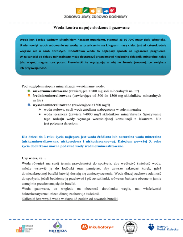 Woda kontra napoje słodzone i gazowane Woda jest bardzo ważnym składnikiem naszego organizmu, stanowi aż 60-70% masy ciała człowieka. U niemowląt zapotrzebowanie na wodę, w przeliczeniu na kilogram masy ciała, jest aż czterokrotnie większe niż u osób dorosłych. Dodatkowo woda to najlepszy sposób na ugaszenie pragnienia. W zależności od składu mineralnego może dostarczyć organizmowi niezbędne składniki mineralne, takie jak: wapń, magnez czy potas. Pierwiastki te występują w niej w formie jonowej, co zwiększa ich przyswajalność. Pod względem stopnia mineralizacji wyróżniamy wody: niskozmineralizowane (zawierające < 500 mg soli mineralnych na litr) średniozmineralizowane (zawierające od 500 do 1500 mg składników mineralnych na litr) wysokozmineralizowane (zawierające >1500 mg/l) woda stołowa, czyli woda źródlana wzbogacona w sole mineralne woda lecznicza (zawiera >4000 mg/l składników mineralnych). Spożywanie tego rodzaju wody wymaga wcześniejszej konsultacji z lekarzem. Nie jest polecana dzieciom. Dla dzieci do 3 roku życia najlepsza jest woda źródlana lub naturalna woda mineralna (niskozmineralizowana, niskosodowa i niskosiarczanowa). Dzieciom powyżej 3. roku życia dodatkowo można podawać wody średniozmineralizowane. Czy wiesz, że… Woda również ma swój termin przydatności do spożycia, aby wydłużyć świeżość wody, należy wstawić ją do lodówki oraz pamiętać, aby zawsze zakręcać korek, gdyż do niezakręconej butelki łatwiej dostają się zanieczyszczenia. Woda dłużej zachowa zdatność do spożycia, jeżeli będziemy ją przelewać i pić ze szklanki, wówczas bakterie obecne w jamie ustnej nie przedostaną się do butelki. Woda gazowana, ze względu na obecność dwutlenku bakteriostatyczne i nieco dłużej zachowuje świeżość. Najlepiej jest wypić wodę w ciągu 48 godzin od otwarcia butelki. węgla, ma właściwości Słodzone napoje kuszą intensywnością smaków oraz fantazyjnymi kolorami. Jednak warto przyjrzeć się bliżej składom takich napojów. Wówczas można zauważyć, że są pozbawione składników odżywczych, także witamin i minerałów. Zawierają natomiast bardzo duże ilości cukru. Niestety coraz częściej zauważalne jest dosładzanie napojów tańszym zamiennikiem cukru, czyli syropem glukozowo-fruktozowym. Spożywany w nadmiernych ilościach sprzyja rozwojowi tzw. zespołu metabolicznego, objawiającego się otyłością brzuszną, nadciśnieniem, nieprawidłowym poziomem lipidów oraz podwyższonym stężeniem glukozy we krwi. Zbyt duża ilość cukru w diecie dzieci powoduje u nich nadmierne pobudzenie i problemy z koncentracją. Ponadto zwiększa ryzyko zachorowania na cukrzycę, próchnicę, otyłość oraz choroby układu sercowo-naczyniowego w przyszłości. Ponadto dzieci, które piją nadmierne ilości słodzonych napojów lub soków owocowych, odmawiają spożywania głównych posiłków, gdyż nie odczuwają już głodu. Także dlatego najlepszym sposobem nawadniania organizmu w ciągu dnia jest picie wody. Słodzone i gazowane napoje oprócz cukru zawierają wiele innych, niekorzystnych dla naszego organizm substancji, m.in. sztuczne barwniki, konserwanty. Należy unikać połączenia benzoesanu sodu oraz witaminy C, określanej również jako kwas askorbinowy. Zestawienie obu tych substancji w jednym napoju może powodować wytrącenie się rakotwórczej substancji - benzenu. Niektóre napoje w swoim składzie zamiast cukru zawierają słodzik, np. acesulfam K (E950) czy aspartam (E951), cyklaminian sodu (E952), izomaltoza (E953), sacharyna (E954), które podejrzewane są o powodowanie zaburzeń koncentracji, bezsenności, a także bólów brzucha oraz bólów i zawrotów głowy. Ze względu na wątpliwości w zakresie bezpieczeństwa takich produktów, lepiej nie podawać tych substancji dzieciom. Woda gazowana vs. woda niegazowana Nie ulega wątpliwości, iż najlepszym sposobem gaszenia pragnienia i nawodnienia organizmu jest spożywanie wody źródlanej lub naturalnej wody mineralnej. Głównym jej walorem jest brak konserwantów, barwników, aromatów i innych dodatków. Zarówno woda gazowana jak i niegazowana nie zawierają kalorii. Wody nasycone CO2 mogą podrażniać śluzówkę przewodu pokarmowego, powodować uczucie rozpierania oraz utrudnione wchłanianie niektórych składników odżywczych. Jednak woda gazowana ma swoje zalety: nasycenie CO2 powoduje, że woda dłużej zachowuje czystość mikrobiologiczną, gdyż dwutlenek węgla w połączeniu z wodorem tworzy kwas węglowy, który działa bakteriostatycznie i bakteriobójczo. Dodawany do napojów gazowanych dwutlenek węgla ma działanie przede wszystkim orzeźwiające i ochładzające. Dwutlenek węgla wzmaga trawienie oraz poprawia apetyt. Jednak nie każdy może spożywać napoje gazowane. Szczególnie muszą uważać osoby z chorobą wrzodową żołądka, refluksem żołądkowo- przełykowym, a także osoby z innymi problemami gastrycznymi, w stanach pooperacyjnych i osoby z zespołem jelita drażliwego lub mające wzdęcia. Nie są także zalecane małym dzieciom, gdyż pęcherzyki gazu mogą wywołać bóle brzucha. Kobietom w ciąży i karmiącym zaleca się picie wody niegazowanej. U zdrowych osób, nie odczuwających dyskomfortu po spożyciu wody gazowanej, nie ma przeciwwskazań do jej stosowania. Dbajmy o nawodnienie organizmu! Niemowlę karmione wyłącznie piersią nie potrzebuje dopajania dodatkowymi płynami, jednak gdy dieta malucha jest rozszerzana to jednocześnie zwiększa się zapotrzebowanie na płyny. Dzieci w wieku 1-3 lat powinny wypijać ok. 1000 ml w ciągu dnia. Dzieci w wieku 4-6 lat powinny wypijać ok. 1300 ml w ciągu dnia. W niektórych przypadkach należy zwiększyć podaż przyjmowanych płynów, aby zapobiec odwodnieniu. Dodatkową ilość płynu należy dostarczyć dzieciom w przebiegu choroby, podczas biegunki lub wymiotów, a także w czasie upalnych dni. Objawy św