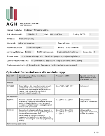 Nazwa modułu: Podstawy filmoznawstwa Rok akademicki: 2016/2017 Wydział: Humanistyczny Kierunek: Kulturoznawstwo Poziom studiów: Kod: HKL-1-406-s Specjalność: Studia I stopnia Język wykładowy: Polski Profil kształcenia: Punkty ECTS: 2 - Forma i tryb studiów: - Ogólnoakademicki (A) Semestr: 4 Strona www: http://www.wh.agh.edu.pl/main/pl/programy-zajec-i-sylabusy Osoba odpowiedzialna: dr Zmudziński Bogusław ([email protected]) Osoby prowadzące: dr Zmudziński Bogusław ([email protected]) Opis efektów kształcenia dla modułu zajęć Kod EKM Student, który zaliczył moduł zajęć wie/umie/potrafi Powiązania z EKK Sposób weryfikacji efektów kształcenia (forma zaliczeń) Zna właściwe dla nauk humanistycznych i społecznych teorie i koncepcje zmian zachodzących we współczesnej kulturze zwłaszcza w odniesieniu do filmu i wytworów audiowizualnych. KL1A_W04, KL1A_W07 Kolokwium M_U001 Rozumie i potrafi scharakteryzować przemiany zachodzące we współczesnym społeczeństwie i kulturze pod wpływem nowoczesnej technologii i szczególnej roli filmu w tych procesach. KL1A_U04, KL1A_U23 Aktywność na zajęciach, Kolokwium M_U003 Student potrafi zabierać głos w dyskusji w oparciu o poznane koncepcje teoretyczne z zakresu filmoznawstwa oraz prezentowanych dzieł filmowych, muzycznych, teatralnych i plastycznych, stosując właściwą im terminologię i metody analizy. KL1A_U05, KL1A_U08, KL1A_U09, KL1A_U10, KL1A_U12 Aktywność na zajęciach, Kolokwium, Udział w dyskusji Wiedza M_W004 Umiejętności Kompetencje społeczne 1/5 Karta modułu - Podstawy filmoznawstwa M_K001 Samodzielnie rozwiązuje zadania teoretyczne i praktyczne związane z krytyczną analizą współczesną kulturą i jej audiowizualnych artefaktów. KL1A_K09 Aktywność na zajęciach, Kolokwium M_K002 Zabiera głos w dyskusji, jest gotowy do zmiany swoich opinii pod jej wpływem i w świetle nowych pojawiających się idei wykazuje otwartość i chęć ich poznania i zrozumienia. KL1A_K02, KL1A_K04 Aktywność na zajęciach, Kolokwium, Udział w dyskusji Matryca efektów kształcenia w odniesieniu do form zajęć Konwersatori um Zajęcia seminaryjne Zajęcia praktyczne Zajęcia terenowe Zajęcia warsztatowe - - - - + - - - - - - M_U001 Rozumie i potrafi scharakteryzować przemiany zachodzące we współczesnym społeczeństwie i kulturze pod wpływem nowoczesnej technologii i szczególnej roli filmu w tych procesach. - - - - + - - - - - - M_U003 Student potrafi zabierać głos w dyskusji w oparciu o poznane koncepcje teoretyczne z zakresu filmoznawstwa oraz prezentowanych dzieł filmowych, muzycznych, teatralnych i plastycznych, stosując właściwą im terminologię i metody analizy. - - - - + - - - - - - - - - - + - - - - - - E-learning Ćwiczenia projektowe Zna właściwe dla nauk humanistycznych i społecznych teorie i koncepcje zmian zachodzących we współczesnej kulturze zwłaszcza w odniesieniu do filmu i wytworów audiowizualnych. Inne Ćwiczenia laboratoryjne Forma zajęć Ćwiczenia audytoryjne Student, który zaliczył moduł zajęć wie/umie/potrafi Wykład Kod EKM Wiedza M_W004 Umiejętności Kompetencje społeczne M_K001 Samodzielnie rozwiązuje zadania teoretyczne i praktyczne związane z krytyczną analizą współczesną kulturą i jej audiowizualnych artefaktów. 2/5 Karta modułu - Podstawy filmoznawstwa M_K002 Zabiera głos w dyskusji, jest gotowy do zmiany swoich opinii pod jej wpływem i w świetle nowych pojawiających się idei wykazuje otwartość i chęć ich poznania i zrozumienia. - - - - + - - - - - - Treść modułu zajęć (program wykładów i pozostałych zajęć) Konwersatorium Celem modułu jest wprowadzenie do wiedzy o filmie jako sztuce oraz dziedzinie kultury popularnej i masowej, z jednej strony szukającej artystycznej i kulturowej tożsamości w stuleciu technicyzacji mediów i jednocześnie syntetyzującej tradycje dawnej kultury, z drugiej zapowiadającej epokę szerokiego spektrum przekazów audiowizualnych, decydujących o obliczu zdemokratyzowanej (i skomercjalizowanej) kultury przełomu wieków. Zajęcia obejmują zagadnienia historii i teorii filmu w szerokim kontekście kultury i estetyki ostatniego stulecia, a także wieków poprzednich. Ich przedmiotem są główne etapy historii kina oraz refleksji nad filmem, wybrane ujęcia problemowe wynikające m.in. z podziałów na wykształcone odmiany filmowych przekazów: pełnometrażowy spektakl filmowy i filmy krótkometrażowe, a także pokrywający się z nimi w znacznym stopniu podział na film fabularny oraz dokumentalny i animowany. Konwersatoryjny charakter zajęć stworzy możliwość szerokiej wymiany myśli na bazie lektury obowiązkowych tekstów, referatów oraz emisji dobranych przez prowadzącego i przez samych uczestników krótkich cytatów filmowych. 1. Film w podwójnej perspektywie badawczej: dzieło sztuki i towar – podstawowe kategorie analizy filmoznawczej; kino autorów i kino gatunków; 2. Prehistoria filmu, narodziny kinematografu w kontekście innych prób rejestracji i odtwarzania ruchomych obrazów, ewolucja przekazu filmowego w okresie kina niemego – fenomen kulturowy „wielkiego niemowy”; 3. Pierwszy triumf filmu jako sztuki: S. Eisenstein, ekspresjonizm filmowy, burleska filmowa (aspekty teoretyczne: R. Arnheim, B. Balázs, L. Kulszow); 4. Rozwój filmu komercyjnego oraz kina gatunków – kino stylu zerowego epoki klasycznej (model hollywoodzki); 5. Włoski neorealizm i okres narodzin oraz triumfu kinematografii i szkół narodowych; 6. Lata 50. – 70. – okres świetności kina autorskiego i wielkich indywidualności artystycznych światowej kinematografii (I. Bergman, M. Antonioni, L. Buñuel, A. Kurosawa i inni); 7. Od „Gwiezdnych wojen” i „Szczęk” do „Avatara” – współczesny etap rozwoju kina gatunków i miejsce filmu we współczesnej kulturze popularnej; 8. Film w pejzażu współczesnej komunikacji audiowizualnej, nowe media oraz nowe obszary 