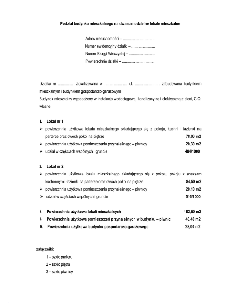 Podział budynku mieszkalnego na dwa samodzielne lokale mieszkalne Adres nieruchomości – ................................ Numer ewidencyjny działki – ........................ Numer Księgi Wieczystej – .......................... Powierzchnia działki – ................................. Działka nr ................ zlokalizowana w ....................... ul. ......................... zabudowana budynkiem mieszkalnym i budynkiem gospodarczo-garażowym Budynek mieszkalny wyposażony w instalacje wodociągową, kanalizacyjną i elektryczną z sieci, C.O. własne 1. Lokal nr 1 Ø powierzchnia użytkowa lokalu mieszkalnego składającego się z pokoju, kuchni i łazienki na parterze oraz dwóch pokoi na piętrze 78,00 m2 Ø powierzchnia użytkowa pomieszczenia przynależnego – piwnicy 20,30 m2 Ø udział w częściach wspólnych i gruncie 484/1000 2. Lokal nr 2 Ø powierzchnia użytkowa lokalu mieszkalnego składającego się z pokoju, pokoju z aneksem kuchennym i łazienki na parterze oraz dwóch pokoi na piętrze 84,50 m2 Ø powierzchnia użytkowa pomieszczenia przynależnego – piwnicy 20,10 m2 Ø udział w częściach wspólnych i gruncie 516/1000 3. Powierzchnia użytkowa lokali mieszkalnych 4. Powierzchnia użytkowa pomieszczeń przynależnych w budynku – piwnic 5. Powierzchnia użytkowa budynku gospodarczo-garażowego załączniki: 1 – szkic parteru 2 – szkic piętra 3 – szkic piwnicy 162,50 m2 40,40 m2 28,00 m2