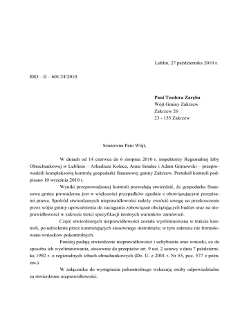 Lublin, 27 października 2010 r. RIO – II – 601/34/2010 Pani Teodora Zaręba Wójt Gminy Zakrzew Zakrzew 26 23 - 155 Zakrzew Szanowna Pani Wójt, W dniach od 14 czerwca do 6 sierpnia 2010 r. inspektorzy Regionalnej Izby Obrachunkowej w Lublinie – Arkadiusz Kołacz, Anna Smalec i Adam Granowski – przeprowadzili kompleksową kontrolę gospodarki finansowej gminy Zakrzew. Protokół kontroli podpisano 10 września 2010 r. Wyniki przeprowadzonej kontroli pozwalają stwierdzić, że gospodarka finansowa gminy prowadzona jest w większości przypadków zgodnie z obowiązującymi przepisami prawa. Spośród stwierdzonych nieprawidłowości należy zwrócić uwagę na przekroczenie przez wójta gminy upoważnienia do zaciągania zobowiązań obciążających budżet oraz na nieprawidłowości w zakresie treści specyfikacji istotnych warunków zamówień. Część stwierdzonych nieprawidłowości została wyeliminowana w trakcie kontroli, po udzieleniu przez kontrolujących stosownego instruktażu; w tym zakresie nie formułowano wniosków pokontrolnych. Poniżej podaję stwierdzone nieprawidłowości i uchybienia oraz wnioski, co do sposobu ich wyeliminowania, stosownie do przepisów art. 9 ust. 2 ustawy z dnia 7 października 1992 r. o regionalnych izbach obrachunkowych (Dz. U. z 2001 r. Nr 55, poz. 577 z późn. zm.). W załączniku do wystąpienia pokontrolnego wskazuję osoby odpowiedzialne za stwierdzone nieprawidłowości. 2 1. W zakresie rachunkowości i sprawozdawczości: 1.1. Dokonywanie zapisów w ewidencji analitycznej należności z tytułu czynszu najmu (prowadzonej ręcznie) bez wskazania rodzaju i numeru identyfikacyjnego dowodu księgowego, będącego podstawą zapisu. Zapisów w księgach rachunkowych dokonywać ze wskazaniem m.in. rodzaju i numeru identyfikacyjnego dowodu księgowego, stanowiącego podstawę zapisu, stosownie do przepisów art. 23 ust. 2 pkt 2 ustawy z dnia 29 września 1994 r. o rachunkowości (Dz. U. z 2009 r. Nr 152, poz. 1223 z późn. zm.) – str. 5 protokołu. 1.2. Nieprawidłowe prowadzenie ewidencji na koncie 980 „Plan finansowy wydatków budżetowych”. Ewidencję na koncie 80 „Plan finansowy wydatków budżetowych” prowadzić na bieżąco, ujmując na stronie Wn plan finansowy wydatków budżetowych oraz jego zmiany, zaś na stronie Ma – równowartość zrealizowanych wydatków budżetu, wartość planu niewygasających wydatków budżetu do realizacji w roku następnym, wartość planu niezrealizowanego i wygasłego, zgodnie z zasadami ich funkcjonowania określonymi w załączniku Nr 2 do rozporządzenia Ministra Finansów z 28 lipca 2006 r. w sprawie szczególnych zasad rachunkowości oraz planów kont dla budżetu państwa, budżetów jednostek samorządu terytorialnego oraz niektórych jednostek sektora finansów publicznych (Dz. U. Nr 142, poz. 1020 z późn. zm.), zwanego w dalszej części tego wystąpienia „rozporządzeniem Ministra Finansów z dnia 28 lipca 2006 r.”, w związku z przepisami § 27 rozporządzenia Ministra Finansów z dnia 5 lipca 2010 r. w sprawie szczególnych zasad rachunkowości oraz planów kont dla budżetu państwa, budżetów jednostek samorządu terytorialnego, jednostek budżetowych, samorządowych zakładów budżetowych, państwowych funduszy celowych oraz państwowych jednostek budżetowych mających siedzibę poza granicami Rzeczypospolitej Polskiej (Dz. U. Nr 128, poz. 861), zwanego w dalszej części tego wystąpienia rozporządzeniem z 5 lipca 2010 r. – str. 6 protokołu. 1.3. Wykazanie w kolumnie 10. jednostkowych sprawozdań Rb-27S: za okres od początku roku do dnia 31 marca, 30 czerwca, 30 września i 31 grudnia 2009 r. kwot należności jako zaległości, skutkujące zawyżeniem zaległości z tytułu opłat za wodę w kwocie odpowiednio o 1.671,36 zł, 3.686,39 zł, 4.223,12 zł i 1.654,86 zł oraz zaległości z tytułu podatku rolnego od osób fizycznych w kwocie zawyżonej o 37 zł (w sprawozdaniu za okres od początku roku do dnia 31 grudnia 2009 r.). 3 Sprawozdania budżetowe sporządzać na podstawie ksiąg rachunkowych, wykazując w nich kwoty zgodne z danymi wynikającymi z prawidłowo prowadzonej ewidencji księgowej, stosownie do przepisów § 6 ust. 1 pkt 1 i § 9 ust. 2 rozporządzenia Ministra Finansów z dnia 3 lutego 2010 r. w sprawie sprawozdawczości budżetowej (Dz. U. Nr 20, poz. 1030). W kolumnie „Saldo końcowe” wykazywać odpowiednio należności pozostałe do zapłaty, w tym (kolumna 10.) zaległości, tj. należności pozostałe do zapłaty, których termin płatności minął, zgodnie z § 3 ust. 1 pkt 7 „Instrukcją sporządzania sprawozdań budżetowych w zakresie budżetów jednostek samorządu terytorialnego”, stanowiącą Załącznik nr 39 do tego rozporządzenia – str. 7, 8 protokołu 2. W zakresie gospodarki pieniężnej i rozrachunków: 2.1. Wykazanie, na koniec roku 2009 na koncie 226 „Długoterminowe należności budżetowe”, nierealnego salda, w wyniku ujęcia na tym koncie należności w kwocie 4.085,90 zł na podstawie złożonych do sądu wniosków o wpis hipoteki, mimo braku dowodów źródłowych potwierdzających ustanowienie hipoteki oraz uznanie salda tego konta za realne w trakcie inwentaryzacji tych należności na dzień 31.12.2009 r. Na kontach rozrachunkowych wykazywać salda realne, tj. odzwierciedlające rzeczywisty stan rozrachunków, stosownie do przepisów art. 24 ust. 2 ustawy o rachunkowości. Inwentaryzację metodą weryfikacji przeprowadzać porównując dane ksiąg rachunkowych z odpowiednimi dokumentami, stosownie do przepisów art. 26 ust. 1 pkt 3 powołanej ustawy. Ujawnione w toku inwentaryzacji różnice między stanem rzeczywistym a stanem wykazanym w księgach rachunkowych należy wyjaśnić i rozliczyć w księgach rachunkowych tego roku obrotowego, na który przypadał termin inwentaryzacji, zgodnie z przepisami art. 27 ust. 2 tej ustawy – str. 14, 15, 16 protokołu. 3. W zakresie wykonania budże