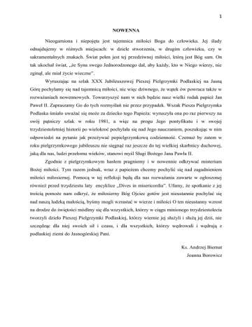 1 NOWENNA Nieogarniona i niepojęta jest tajemnica miłości Boga do człowieka. Jej ślady odnajdujemy w różnych miejscach: w dziele stworzenia, w drugim człowieku, czy w sakramentalnych znakach. Świat pełen jest tej przedziwnej miłości, którą jest Bóg sam. On tak ukochał świat, „że Syna swego Jednorodzonego dał, aby każdy, kto w Niego wierzy, nie zginął, ale miał życie wieczne”. Wyruszając na szlak XXX Jubileuszowej Pieszej Pielgrzymki Podlaskiej na Jasną Górę pochylamy się nad tajemnicą miłości, nic więc dziwnego, że wątek ów powraca także w rozważaniach nowennowych. Towarzyszyć nam w nich będzie nasz wielki rodak papież Jan Paweł II. Zapraszamy Go do tych rozmyślań nie przez przypadek. Wszak Piesza Pielgrzymka Podlaska śmiało uważać się może za dziecko tego Papieża: wyruszyła ona po raz pierwszy na swój pątniczy szlak w roku 1981, a więc na progu Jego pontyfikatu i w swojej trzydziestoletniej historii po wielokroć pochylała się nad Jego nauczaniem, poszukując w nim odpowiedzi na pytanie jak przeżywać popielgrzymkową codzienność. Czemuż by zatem w roku pielgrzymkowego jubileuszu nie sięgnąć raz jeszcze do tej wielkiej skarbnicy duchowej, jaką dla nas, ludzi przełomu wieków, stanowi myśl Sługi Bożego Jana Pawła II. Zgodnie z pielgrzymkowym hasłem pragniemy i w nowennie odkrywać misterium Bożej miłości. Tym razem jednak, wraz z papieżem chcemy pochylić się nad zagadnieniem miłości miłosiernej. Pomocą w tej refleksji będą dla nas rozważania zawarte w ogłoszonej również przed trzydziestu laty encyklice „Dives in misericordia”. Ufamy, że spotkanie z jej treścią pomoże nam odkryć, że miłosierny Bóg Ojciec gotów jest nieustannie pochylać się nad naszą ludzką małością, byśmy mogli wzrastać w wierze i miłości O ten nieustanny wzrost na drodze do świętości módlmy się dla wszystkich, którzy w ciągu minionego trzydziestolecia tworzyli dzieło Pieszej Pielgrzymki Podlaskiej, którzy wiernie jej służyli i służą jej dziś, nie szczędząc dla niej swoich sił i czasu, i dla wszystkich, którzy wędrowali i wędrują z podlaskiej ziemi do Jasnogórskiej Pani. Ks. Andrzej Biernat Joanna Borowicz 2 Dzień I 5 sierpnia 2010 Eucharystia – czwarta góra Miłości Śpiew: Gwiazdo zaranna (Śpiewnik „Czeka was droga” s. 137) „Najświętsza Dziewico, Matko Chrystusa i Matko Kościoła, z radością i podziwem śpiewamy wraz z Tobą „Magnificat”, Twoją pieśń miłości i dziękczynienia. Bogu, którego „miłosierdzie z pokolenia na pokolenie”, wraz z Tobą dziękujemy za wspaniałe powołanie katolików świeckich i za to, że powierzył im tak bogatą w swych różnorodnych formach misję, wzywając każdego z nich po imieniu do życia w komunii miłości i świętości z Nim samym, w braterskiej jedności wielkiej rodziny dzieci Bożych, że posłał ich, aby nieśli światło Chrystusa i by poprzez swoje ewangeliczne życie ogień Ducha Świętego przekazywali całemu światu” 1. Amen. Z encykliki „Dives in misericordia”: „Kościół żyje swoim autentycznym życiem, kiedy wyznaje i głosi miłosierdzie – najwspanialszy przymiot Stwórcy i Odkupiciela – i kiedy ludzi przybliża do Zbawicielowych zdrojów miłosierdzia, których jest dyspozytariuszem i szafarzem. Ogromne znaczenie ma w tej dziedzinie stałe rozważanie Słowa Bożego, a nade wszystko świadome i dojrzałe uczestnictwo w Eucharystii oraz w sakramencie pokuty i pojednania. Eucharystia przybliża nas zawsze do tej miłości, która jest potężniejsza niż śmierć; ilekroć bowiem spożywamy ten chleb albo pijemy kielich, nie tylko głosimy śmierć Odkupiciela, ale także wspominamy Jego zmartwychwstanie i oczekujemy Jego przyjścia w chwale. Sam obrzęd eucharystyczny, sprawowany na pamiątkę Tego, który w swym mesjańskim posłannictwie objawił nam swego Ojca przez słowo i krzyż, świadczy o tej niewyczerpalnej miłości, mocą której pragnie On stale łączyć się z nami i jednoczyć, wychodząc na spotkanie wszystkich ludzkich serc”. (DiM 13) Dziękując Ojcu Niebieskiemu za dar Eucharystii wołajmy z pokorą: W swojej dobroci wysłuchaj nas Panie (lub śpiew: O Pani ufność nasza…) - za Kościół Święty, aby jednocząc się przy stole eucharystycznym niósł Chrystusa tym, którzy go jeszcze nie znają. Ciebie prosimy… - za biskupów i kapłanów, by nie szczędzili sił głosząc współczesnemu światu orędzie o Bogu, który jest Miłością. Ciebie prosimy… - za przygotowujących się do kapłaństwa, by z ufnością, kroczyli drogą swojego powołania. Ciebie prosimy… - za dzieci, które w tym roku po raz pierwszy przyjęły do swego serca Chrystusa Eucharystycznego, by częste korzystanie z sakramentu Eucharystii przemieniało ich życie. Ciebie prosimy… - za nas pielgrzymujących do tronu Jasnogórskiej Pani, byśmy umocnieni Słowem Bożym i posileni Chlebem Eucharystycznym, nieśli z radością prawdę o Bożej Miłości, objawiającej się w Eucharystii, wszystkim wątpiącym. Ciebie prosimy… Pod Twoją obronę… lub Litania do Matki Bożej Nieustającej Pomocy (tekst w aneksie) Módlmy się: Chwalebna Dziewico Maryjo, Matko Dobrej Rady, błagamy Cię, prowadź nas po trudnych drogach życia. Wyjednaj światło naszemu rozumowi, gorącą miłość naszemu 1 Christifides laici. Cyt za: modlitwy Jana Pawła II. Kraków 2003 s. 133. 3 sercu, siłę naszej woli. O Matko Słowa Wcielonego, powtarzaj nam słowa życia wiecznego, które usłyszałaś od Twego Syna i zachowałaś w swoim sercu. Spraw, abyśmy żyli w miłości Bożej i wypełniali zawsze Jego świętą wolę. Uproś nam łaskę wytrwania do końca, abyśmy mogli cieszyć się z Tobą wieczną radością w niebie. Amen Śpiew: Bądź Królową (Śpiewnik „Czeka was droga, s. 129) 4 Dzień II 6 sierpnia 2010 Przykazanie miłości Śpiew: Gwiazdo zaranna (Śpiewnik „Czeka was droga” s