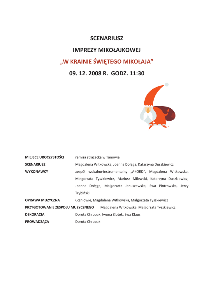 SCENARIUSZ IMPREZY MIKOŁAJKOWEJ „W KRAINIE ŚWIĘTEGO MIKOŁAJA” 09. 12. 2008 R. GODZ. 11:30 MIEJSCE UROCZYSTOŚCI remiza strażacka w Tanowie SCENARIUSZ Magdalena Witkowska, Joanna Dołęga, Katarzyna Duszkiewicz WYKONAWCY zespół wokalno-instrumentalny „AKORD”, Magdalena Witkowska, Małgorzata Tyszkiewicz, Mariusz Milewski, Katarzyna Duszkiewicz, Joanna Dołęga, Małgorzata Januszewska, Ewa Piotrowska, Jerzy Trybiński OPRAWA MUZYCZNA uczniowie, Magdalena Witkowska, Małgorzata Tyszkiewicz PRZYGOTOWANIE ZESPOŁU MUZYCZNEGO Magdalena Witkowska, Małgorzata Tyszkiewicz DEKORACJA Dorota Chrobak, Iwona Złotek, Ewa Klaus PROWADZĄCA Dorota Chrobak Piosenka Całą noc padał śnieg, cicho, cicho, cichuteńko; a tu mróz, groźny mróz wymalował nam okienko. Przyszła noc a z nią moc, same cuda i cudeńka; dziecko śpi, o czym śni? Czy pan z brodą go pamięta. Niech cię głowa już nie boli, niech cię smutna myśl nie nęka; bo już wnet, bo już wnet będą piękne, białe święta. Narrator „Całą noc padał śnieg” - instrumentalnie (na tle melodii narrator czyta) Kiedy mikołaj jest już blisko, To się zwykle tak przydarza, że wiem o tym bez pytania i bez kalendarza. Bo przedziwne rzeczy wtedy Widać wokół bezustannie: Gwiazdki, zamiast świecić w niebie, w płatkach śniegu w krąg migocą. Jodły zamiast rosnąć w lesie, W mieście się zjawiają nocą. 6 grudnia - jak dobrze wiecie, Święty Mikołaj chodzi po świecie. Dźwiga swój worek niezmordowanie I każde dziecko prezent dostanie. Święty Mikołaju, prosimy cię grzecznie, w dniu twojego święta przyjdź do nas koniecznie. My już od tak dawna na Ciebie czekamy, Co dzień być grzecznymi wszyscy się staramy. Kiedy przyjdziesz do nas, będzie dzień wesoły. A więc nie omijaj progów naszej szkoły. Piosenka Niech cię głowa już nie boli, niech cię smutna myśl nie nęka; bo już wnet, bo już wnet będą piękne, białe święta. Narrator Witam serdecznie wszystkich zaproszonych gości, naszych przyjaciół oraz was kochane dzieci. Jak pewnie wiecie spotkaliśmy się tutaj, bo tak naprawdę wszyscy z niecierpliwością czekamy cały rok na to jedno ważne spotkanie. Spotkanie ze Świętym Mikołajem. Zanim jednak Mikołaj do nas przybędzie, zapraszam Was serdecznie do odwiedzenia naszej bajkowo – mikołajkowej krainy. A co tam się wydarzy zobaczcie sami … Piosenka Witajcie w naszej bajce, wilk zagra na fujarce, Kapturek nam zaśpiewa, zatańczą wkoło drzewa Tu wszystko jest możliwe, zwierzęta są szczęśliwe, A dzieci wiem coś o tym – latają samolotem Nikt tutaj nie zna głodu, nikt tu nie czuje chłodu, I nawet ja nie kłamię, nikt się nie skarży mamie. Witajcie w naszej bajce, wilk zagra na fujarce, Kapturek nam zaśpiewa, zatańczą wkoło drzewa, Bo z wami jest weselej, ruszymy razem w knieje, A w kniejach i dąbrowach przygoda już się chowa. My ją znajdziemy sami, my chłopcy z dziewczętami, A wtedy daję słowo, że będzie kolorowo. Pojawia się czarownica … (dym :)) Piosenka (czarownica śpiewa, zespół pomaga w śpiewie) „Jestem groźna czarownica, Cha – cha! Zna mnie cała okolica, Cha – cha! Kiedy dnieje, kogut pieje, Ja się śmieję Ucha – cha! Mam ja wilka na posługi, Cha – cha! Czy to słoty, czy szarugi, cha – cha! Wicher wieje, z nieba leje Ja się śmieję! Ucha – cha! Piernikami kogoś nęcę, Cha – cha! Kto tu wszedł, nie wyjdzie więcej. Cha – cha! Piec się grzeje, żarem zieje. Ja się śmieję Ucha – cha! Czarownica Dawno miałam na kogoś chrapkę, wpadł ktoś w moja pułapkę! Droga do mnie wydawała się słodka. A czy wiesz, co teraz Ciebie tutaj spotka? Mikołaj (Mikołaj siedzi za kratkami, w chatce Czarownicy, nikt go nie widzi…) Nigdy nie widziałem takiej wrednej czarownicy. Ja mam misję do spełnienia w okolicy. Wypuść mnie czym prędzej, po dobroci radzę, Bo nie ręczę za siebie, zaraz coś poradzę. Czarownica Co Ty opowiadasz, brednie jakieś pleciesz Zaczaruję Ciebie, jestem niezła przecież! Czarownica Czary mary … Czerwony Kapturek (pojawia się Czerwony Kapturek i przerywa czarownicy czarowanie) Hej, hej czarownico, a co tak spędzasz dzień pracowicie Któż to znowu w Twoje sidła wpada, Pomyśl choć czasami czy to tak wypada. Czerwony Kapturek Oj muszę odpocząć, bo droga daleka Czarownica Ja także odsapnę, choć czas wciąż ucieka. (Czerwony Kapturek i Czarownica odpoczywają i zaczarowany Mikołaj ze szkatułką) nie zauważają, kiedy na scenie pojawia się Zaczarowany w Czarnoksiężnika Mikołaj Jestem wolny! Brawo! Brawo! Muszę stąd uciekać żwawo! Ale zaraz, kim ja jestem? Nie poznaję, nie pamiętam Co ja teraz zrobię dzieci? Zaraz, zaraz, a ta kartka, co ja wziąłem z chatki? Może tam znajdę właśnie, rozwiązanie tej zagadki. Zaczarowany w Czarnoksiężnika Mikołaj (czyta kartkę) „Aby czarów prysła moc Musisz zdążyć nim skończy się noc. Dwa uczynki dobre zrób A skończy się czas prób. Gdy dobrym okażesz się Już nic złego nie spotka Cię Odzyskasz postać swą I odgadniesz jak Cię zwą”. Zaczarowany w Czarnoksiężnika Mikołaj No to przejdę się po lesie ładnie Zanim czarownica mnie dopadnie. Jakiś sposób znaleźć muszę Bo w tej obcej postaci zaraz się uduszę. (Mikołaj oddala się) Czarownica Oj Czerwony Kapturku nie ładnie kochany Przerywać starszej pani piękne czarowanie. Nie zdążyłam do końca użyć swojej mocy, a teraz ktoś uciekł z mojej chatki w nocy… I jeszcze widzę, że zabrał skrzyneczkę, a w niej rozwiązanie, jak złamać to moje zaklęcie. Jestem taka zdenerwowana, kochana od tego, że zaczarowałam całego, oprócz serca jego… Pójdę ja już odpocząć sobie choć troszeczkę, A Ty Kapturku lepiej zmykaj, bo Cię zjem na kolację za małą chwileczkę. (Czarownica się oddala, a Czerwony Kapturek śpiewając znika) Czerwony Kapturek (śpiewa, zespół pomaga w śpiewie) Nie mruczek, nie burek, nie jeż, nie p