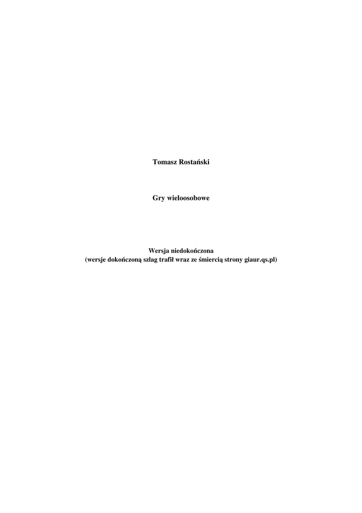 Tomasz Rostański Gry wieloosobowe Wersja niedokończona (wersje dokończoną szlag trafił wraz ze śmiercią strony giaur.qs.pl) Wprowadzenie. Dotychczas analizowaliśmy gry, w których udział brały tylko 2 osoby. Pora zająć się grami o większej ilości graczy. Zatem za grę wieloosobową uznajemy taką grę, której liczba graczy jest większa, lub równa 3. Każdą taką grę możemy zapisać zarówno w postaci normalnej, jak i rozwiniętej, czyli analogicznie jak miało to miejsce w grach dwuosobowych. Ponadto podczas ich analizy korzystamy z wszystkich wcześniej przedstawionych zasad i pojęć (strategie dominujące, mieszane, minimaksowe). Gry wieloosobowe również możemy podzielić na: • nienegocjacyjne • negocjacyjne. Gry negocjacyjne z kolei możemy podzielić na: • bez wypłat ubocznych – gracze tworzą koalicje (koordynują swoje działania), jednakże nie mogą ofiarowywać sobie łapówek, za przystąpienie do koalicji, nie przewidzianych w macierzy wypłat. • z wypłatami ubocznymi – działania mające na celu ofiarowywanie dodatkowych wypłat za dołączenie do koalicji (przekupstwo) są dozwolone. Możemy mówić o poznaniu gry wieloosobowej, tylko w przypadku: • poznania wszystkich koalicji, które się mogą utworzyć, • poznania wartości gry dla tych koalicji. Zanim przejdziemy do opisu pojęć i metod właściwych grom wieloosobowym, pora na przykład. Dane jest drzewo gry 3osobowej. Należy podać wynik gry, zakładając, że gracze nie mogą zawiązywać koalicji. Zanim przystąpimy do dalszych rozważań, zapiszmy naszą grę w postaci macierzy wypłat. Będzie ona miała następującą postać: strategie gracza I L P L L P 2,1,1 0,2,2 4,3,1 2,1,1 P L 1,3,4 1,0,1 strategie gracza II strategie gracza III P 3,1,2 0,2,2 Poszukajmy strategii dominujących pozostałe, dla każdego z graczy. Pamiętamy, że strategia dominująca to taka, która jest co najmniej tak korzystna jak pozostałe, dla każdej kombinacji strategii w grze, oraz, że zawsze należy wybierać strategię dominującą (jeśli chce się uchodzić za gracza racjonalnego ). Przypatrzmy się strategiom gracza I, a zobaczymy, że wszystkie wartości wypłaty dla strategii L są nieujemne, natomiast dla strategii P wartości te są niedodatnie. Zatem zasada dominacji jednoznacznie określiła nam wybór pierwszego z graczy – L. Analogicznie widzimy, że gracz III również ma strategię dominującą – P. Zastanówmy się natomiast nad strategiami gracza II. Możemy zauważyć, że gracz ten nie ma żadnej strategii dominującej (ponieważ w przypadku ruchu gracza I na L korzystniejsza jest strategia P, natomiast dla strategii P pierwszego gracza korzystniejsza jest strategia L). Jeżeli założymy, że każdy z graczy wie jakie strategie ma przeciwnik (ale nie musi znać wyboru dokonanego przez pozostałych graczy), to oczywistym jest fakt, że gracz II wykryje strategie dominujące przeciwników i wybierze strategię najlepszą na kombinacje strategii dominujących przeciwników. Należy zatem przestudiować tylko 2 strategie. W zaistniałej sytuacji gracz II musi wybrać strategię P (ponieważ daje mi stratę –1, a nie 2). Zatem gra zakończy się wynikiem: LPP z wypłatą (3,1,2). Przeanalizowaliśmy więc niekoalicyjną grę wieloosobową w sposób analogiczny do tego, jaki stosowaliśmy dla gier 2osobowych. Jednakże jak się dalej przekonamy nie zawsze można zastosować tą metodę. Pozostałe metody analizy omówimy w dalszym rozdziale. Funkcja charakterystyczna. Rozpatrzmy następującą sytuację – mamy kilku graczy, którzy mogą uzyskać pewne wypłaty w wyniku zawarcia odpowiednich koalicji. Funkcja charakterystyczna to taki Święty Mikołaj, który dla każdej utworzonej koalicji ma w swoim worku prezent i go jej ofiaruje. Mówiąc bardziej formalnie – funkcja charakterystyczna v przypisuje każdemu podzbiorowi K ⊆ N (N to zbiór wszystkich graczy) wartość wypłaty v(K). Funkcja ta ma następujące właściwości: wartość dla koalicji pustej wynosi 0 (v(Ø) = 0), dla dowolnych koalicji K i L zachodzi v( K ∪ L) ≥ v( K ) + v( L) , (funkcja jest superaddytywna) Dodatkowo, jeśli v( N ) > n ∑ v(i ) , to mamy do czynienia z grami, które nie są nieistotne. Gra nieistotna to taka, i =1 w której łączna wypłata dla koalicji pełnej jest równa wypłatom osiągniętym przez niekooperujących graczy, a nazywamy ją nieistotną, ponieważ wszyscy gracze wezmą co im się należy, nie zadając sobie trudu w zakładanie jakichkolwiek koalicji, nie ma więc większego sensu jej analizowanie. Ponadto jeśli dla wszystkich koalicji K ⊂ N spełniony jest warunek: v( K ) + v( N − K ) = v( N ) to mamy do czynienia z grą o sumie stałej, a jeśli v(N) = 0 to z grą o sumie zerowej. No dobra, ale jak to ma się do gier danych w postaci tabelki? Mając grę w postaci normalnej za wartość v(K) przyjmujemy poziom bezpieczeństwa dla tej koalicji K, czyli wartość jaką ona osiągnie grając przeciwko koalicji (NK). Pora na przykłady: Pierwszy przykład będzie polegał tylko na zapisaniu gry w postaci funkcji charakterystycznej, bez jej analizowania. Analizy dokonamy w dalszej części. Drugi przykład będzie pokazywał sposób konwersji gry zapisanej w postaci normalnej (tabelka) do funkcji charakterystycznej. Przykład 1. Sztandarową grą prezentowaną w tym momencie jest gra, autorstwa von Neumanna i Morgensterna, polegająca na podziale 1 dolara na 3 graczy. Gracze otrzymają dolara tylko w wyniku uzgodnienia podziału między sobą. W przypadku braku zgody nikt nie dostaje nic. Dodatkowo zakładamy, że do przegłosowania układu wypłat wystarczy zgoda dwóch graczy (koalicje 2osobowe przegłosowują układ wypłat dający im całą wypłatę, nie dając przeciwnikowi nic). Taką grę można opisać następującą funkcją charakterystyczną, podając zapis wypłaty w centach: v(Ø) = 0, v(A) = v(B) = v(C) = 0, v(A,B) = v(A,C) = v(B,C) = 100 v(