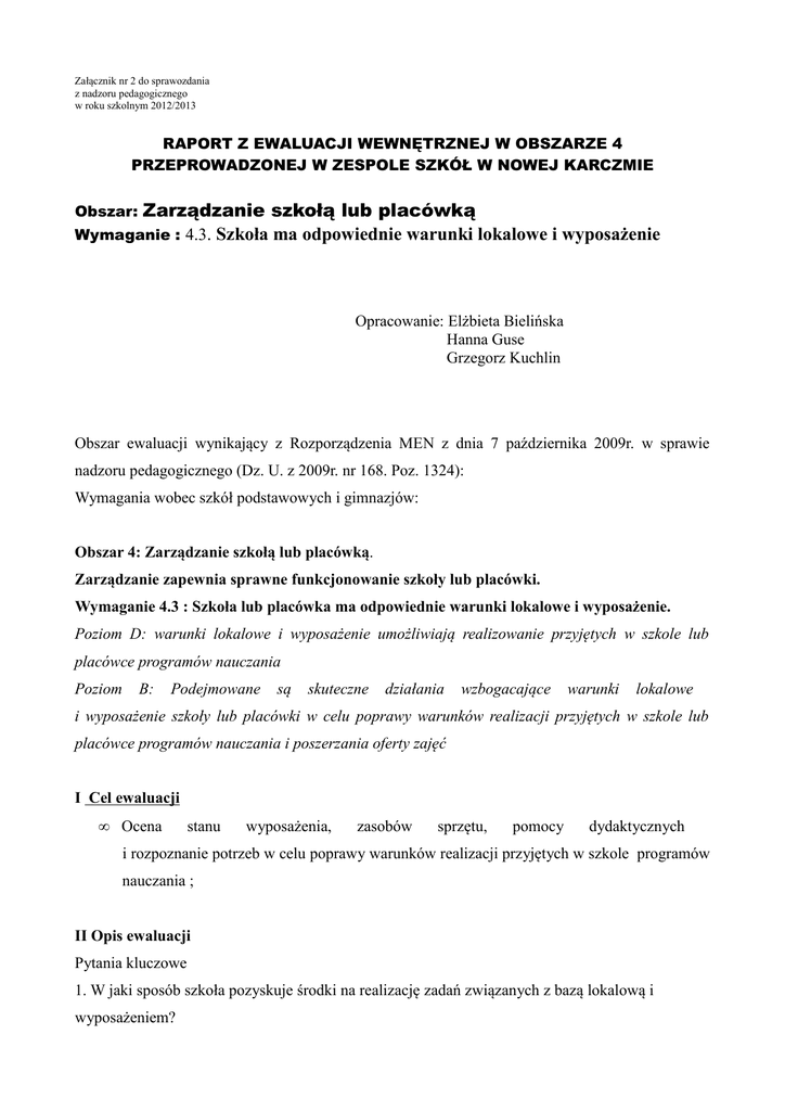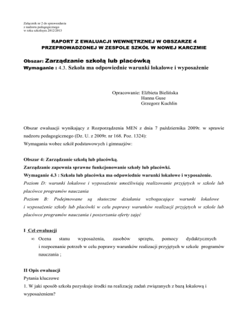 Załącznik nr 2 do sprawozdania z nadzoru pedagogicznego w roku szkolnym 2012/2013 RAPORT Z EWALUACJI WEWNĘTRZNEJ W OBSZARZE 4 PRZEPROWADZONEJ W ZESPOLE SZKÓŁ W NOWEJ KARCZMIE Zarządzanie szkołą lub placówką Wymaganie : 4.3. Szkoła ma odpowiednie warunki lokalowe i wyposażenie Obszar: Opracowanie: Elżbieta Bielińska Hanna Guse Grzegorz Kuchlin Obszar ewaluacji wynikający z Rozporządzenia MEN z dnia 7 października 2009r. w sprawie nadzoru pedagogicznego (Dz. U. z 2009r. nr 168. Poz. 1324): Wymagania wobec szkół podstawowych i gimnazjów: Obszar 4: Zarządzanie szkołą lub placówką. Zarządzanie zapewnia sprawne funkcjonowanie szkoły lub placówki. Wymaganie 4.3 : Szkoła lub placówka ma odpowiednie warunki lokalowe i wyposażenie. Poziom D: warunki lokalowe i wyposażenie umożliwiają realizowanie przyjętych w szkole lub placówce programów nauczania Poziom B: Podejmowane są skuteczne działania wzbogacające warunki lokalowe i wyposażenie szkoły lub placówki w celu poprawy warunków realizacji przyjętych w szkole lub placówce programów nauczania i poszerzania oferty zajęć I Cel ewaluacji • Ocena stanu wyposażenia, zasobów sprzętu, pomocy dydaktycznych i rozpoznanie potrzeb w celu poprawy warunków realizacji przyjętych w szkole programów nauczania ; II Opis ewaluacji Pytania kluczowe 1. W jaki sposób szkoła pozyskuje środki na realizację zadań związanych z bazą lokalową i wyposażeniem? 2. W jaki sposób szkoła angażuje podmioty zewnętrzne w zakresie zapewnienia odpowiednich warunków lokalowych i wyposażenia ? 3. Jakie podmioty angażują się w w/w zakresie? 4. Jak szkoła realizuje swoje obowiązki w zakresie przestrzegania przepisów prawa i zasad BHP ? 5. Czy urządzenia szkolne znajdują się w należytym stanie technicznym i podlegają wymaganym zabiegom konserwacyjnym i przeglądom? 6. Czy warunki lokalowe są odpowiednie do realizacji podstawy programowej i przyjętych w szkole programów? 7. Czy szkoła wzbogaca ofertę edukacyjną o dodatkowe zajęcia? III Opis danych i ich zbierania Gromadzenie danych dotyczących ewaluowanego obszaru odbywało się w trakcie roku szkolnego 2012/2013- do 30 kwietnia 2013r. Na podstawie zgromadzonej dokumentacji przez zespoły przedmiotowe i nauczycielskie, dokumentacji dyrektora szkoły tj.; Zestawy programów nauczania oraz analizy wpisów w dziennikach lekcyjnych dotyczących tematyki realizowanej na początku roku szkolnego w zakresie BHP, założeń programowych, instrukcji, schematów i regulaminów, można stwierdzić, że warunki lokalowe i wyposażenie umożliwiają realizowanie podstawy programowej i przyjętych w szkole programów nauczania. Na podstawie wywiadu z dyrektorem stwierdzono, że warunki lokalowe szkoły są zadowalające. Budynek jest użytkowany przez Publiczne Gimnazjum i Szkołę Podstawową – wspólna jest sala gimnastyczna (Gminna Hala Sportowa), sale komputerowe (18, 34 i 47 oraz ICIM) i stołówka. Klasopracownie są systematycznie doposażane, w miarę możliwości finansowych. W ostatnim czasie zostały zakupione meble do zerówek oraz klas IIII. Systematycznie, chociaż nie w pełnym zakresie, są kupowane pomoce dydaktyczne do realizacji nowej podstawy programowej. Szkoła dysponuje odtwarzaczami DVD i telewizorami. W kontekście konieczności realizacji części doświadczalnej na przedmiotach przyrodniczych daje to uczniom możliwość obejrzenia filmów dydaktycznych, a także niektórych doświadczeń. Nauczyciele języka polskiego wykorzystują ten sprzęt, by z uczniami obejrzeć ekranizacje lektur czy przedstawienia teatralne. W pracowni matematycznej, w której znajduje się tablica interaktywna podłączono Internet. Niestety nie będzie możliwe w najbliższym czasie podłączenie Internetu do każdej klasopracowni. Księgozbiór biblioteki uzupełniany jest systematycznie w lektury szkolne ( dzięki Radzie Rodziców, w tym roku uczniowie klas III gimnazjum zakupili zbiór lektur do szkolnej biblioteki). Pozyskiwanie środków finansowych przysparza trudności. Głównie są to fundusze pochodzące z organu prowadzącego szkołę, częściowo fundusze unijne, także od Rady Rodziców. Dyrektor szkoły stara się również zdobywać poszukując środki, sponsorów. Firma „Margo” przekazała fundusze na stroje sportowe dla uczniów z klas sportowych. Stale wspiera nas w dziedzinie sportu PCM Garczyn. Pomorskie Festiwale Piłki Ręcznej ( rocznik 2000 dziewczęta i chłopcy, rocznik 1998 dziewczęta i chłopcy ) organizowany przez naszą szkole sponsorował m.im. GOKSiR, Stacja Benzynowa Ługama, Ciecholewski Wentylacje, Jakusz Systemy Zabezpieczeń, Aqua Centrum w Kościerzynie oraz Unibud.. Do pozyskiwania pomocy od podmiotów zewnętrznych włączają się również wszyscy nauczyciele, pedagodzy, Rada Rodziców, Urząd Gminy w Nowej Karczmie, Parafia w Nowej Karczmie i lokalni przedsiębiorcy. Z rozmowy odbytej z dyrektorem szkoły wynika, iż jest wiele podmiotów zewnętrznych, które angażują się w życie szkoły i dążą do zapewnienia odpowiednich warunków lokalowych i wyposażenia. Jako główny organ wspomagający należy wymienić Urząd Gminy w Nowej Karczmie, który jest organem prowadzącym szkołę. Dalej, Gminna Komisja ds. Rozwiązywania Problemów Alkoholowych sponsorująca nagrody konkursowe, przedstawienia profilaktyczne. Natomiast Bank Spółdzielczy w Starogardzie Gdańskim przekazał 400 zł dla kółka teatralnego oraz po 300zł na nagrody dla uczniów SP i gimnazjum za oszczędzanie w SKO. Na podstawie analizy wpisów w dziennikach lekcyjnych, informacji, instrukcji, schematów i regulaminów można stwierdzić, że szkoła ma odpowiednie warunki lokalowe i wyposażenie. Opiekunowie pracowni, nauczyciele i inni pracownicy szkoły znają Instrukcje BHP i dbają o ich właściwą realizację. Dyrektor, po dłuższej niż 2 tygodnie przerwie w działalności oświatowej szkoły, dokonuje kontroli i oceny obiektów n