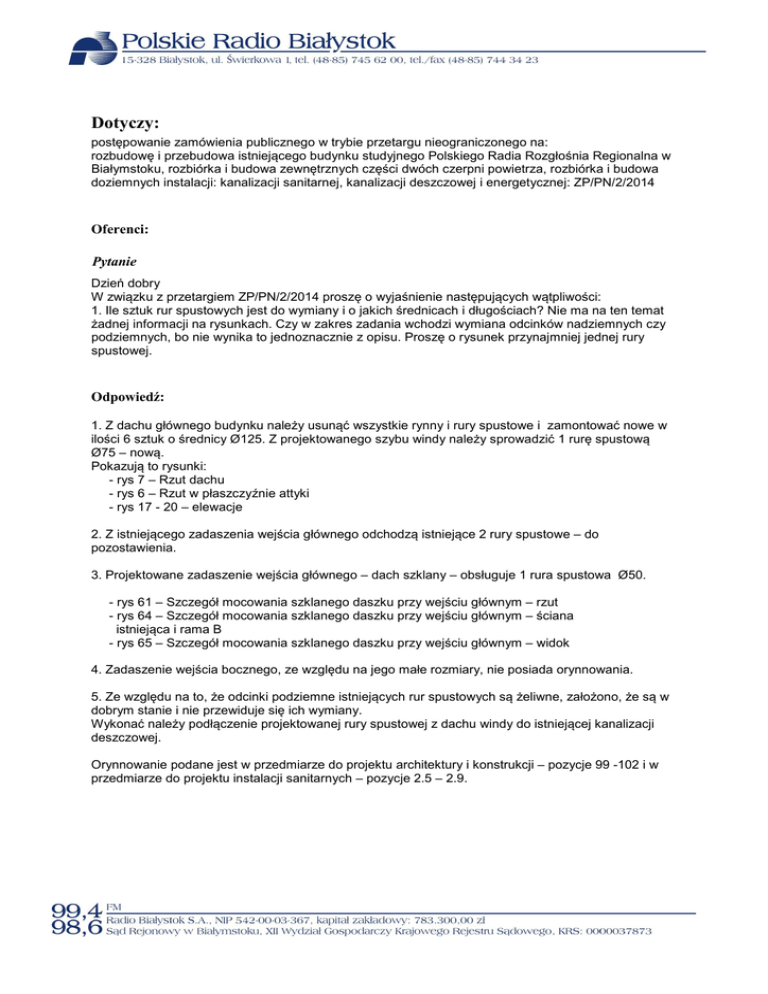 Dotyczy: postępowanie zamówienia publicznego w trybie przetargu nieograniczonego na: rozbudowę i przebudowa istniejącego budynku studyjnego Polskiego Radia Rozgłośnia Regionalna w Białymstoku, rozbiórka i budowa zewnętrznych części dwóch czerpni powietrza, rozbiórka i budowa doziemnych instalacji: kanalizacji sanitarnej, kanalizacji deszczowej i energetycznej: ZP/PN/2/2014 Oferenci: Pytanie Dzień dobry W związku z przetargiem ZP/PN/2/2014 proszę o wyjaśnienie następujących wątpliwości: 1. Ile sztuk rur spustowych jest do wymiany i o jakich średnicach i długościach? Nie ma na ten temat żadnej informacji na rysunkach. Czy w zakres zadania wchodzi wymiana odcinków nadziemnych czy podziemnych, bo nie wynika to jednoznacznie z opisu. Proszę o rysunek przynajmniej jednej rury spustowej. Odpowiedź: 1. Z dachu głównego budynku należy usunąć wszystkie rynny i rury spustowe i zamontować nowe w ilości 6 sztuk o średnicy Ø125. Z projektowanego szybu windy należy sprowadzić 1 rurę spustową Ø75 – nową. Pokazują to rysunki: - rys 7 – Rzut dachu - rys 6 – Rzut w płaszczyźnie attyki - rys 17 - 20 – elewacje 2. Z istniejącego zadaszenia wejścia głównego odchodzą istniejące 2 rury spustowe – do pozostawienia. 3. Projektowane zadaszenie wejścia głównego – dach szklany – obsługuje 1 rura spustowa Ø50. - rys 61 – Szczegół mocowania szklanego daszku przy wejściu głównym – rzut - rys 64 – Szczegół mocowania szklanego daszku przy wejściu głównym – ściana istniejąca i rama B - rys 65 – Szczegół mocowania szklanego daszku przy wejściu głównym – widok 4. Zadaszenie wejścia bocznego, ze względu na jego małe rozmiary, nie posiada orynnowania. 5. Ze względu na to, że odcinki podziemne istniejących rur spustowych są żeliwne, założono, że są w dobrym stanie i nie przewiduje się ich wymiany. Wykonać należy podłączenie projektowanej rury spustowej z dachu windy do istniejącej kanalizacji deszczowej. Orynnowanie podane jest w przedmiarze do projektu architektury i konstrukcji – pozycje 99 -102 i w przedmiarze do projektu instalacji sanitarnych – pozycje 2.5 – 2.9.