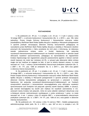 Prezes Urzędu Ochrony Konkurencji i Konsumentów Adam Jasser DDK-61-14/15/AS Warszawa, dn. 29 października 2015 r. POSTANOWIENIE I. Na podstawie art. 49 ust. 1 w związku z art. 24 ust. 1 i 2 pkt 3 ustawy z dnia 16 lutego 2007 r. o ochronie konkurencji i konsumentów (Dz. U. z 2015 r., poz. 184, tekst jednolity), Prezes Urzędu Ochrony Konkurencji i Konsumentów wszczyna wobec przedsiębiorcy Raiffeisen Bank Polska Spółka Akcyjna z siedzibą w Warszawie postępowanie w sprawie praktyki naruszającej zbiorowe interesy konsumentów polegającej na wywodzeniu przez Raiffeisen Bank Polska Spółkę Akcyjną z siedzibą w Warszawie skutków prawnych dla konsumentów z faktu przesłania do nich pism z informacją, że dokonana została jednostronna zmiana umów o kredyt hipoteczny lub pożyczkę wyrażonych/denominowanych/indeksowanych we frankach szwajcarskich w zakresie zasad obliczania wysokości oprocentowania, polegająca na wprowadzeniu do regulaminów kredytu hipotecznego lub regulaminów pożyczki postanowienia zgodnie z którym wartość stawki bazowej nie może być mniejsza niż 0%, w sytuacji gdy dokonanie takiej zmiany mogło nie być możliwe ze względu na fakt, iż jest to istotny element umowy, co może naruszać art. 4 ust. 1 ustawy o przeciwdziałaniu nieuczciwym praktykom rynkowym (Dz. U. z 2007 r. Nr. 171, poz. 1206 ze zmianami: Dz. U. z 2014 r., poz. 827) oraz godzić w zbiorowy interes konsumentów. II. Na podstawie art. 49 ust. 1 w związku z art. 24 ust. 1 i 2 pkt 3 ustawy z dnia 16 lutego 2007 r. o ochronie konkurencji i konsumentów (tj. Dz. U. z 2015 r., poz. 184), Prezes Urzędu Ochrony Konkurencji i Konsumentów wszczyna wobec Raiffeisen Bank Polska Spółka Akcyjna z siedzibą w Warszawie postępowanie w sprawie praktyki naruszającej zbiorowe interesy konsumentów polegającej na sprzecznym z umowami o kredyt hipoteczny lub pożyczkę wyrażonych/denominowanych/indeksowanych we frankach szwajcarskich zawartymi z konsumentami nieuwzględnianiu przy obliczaniu wysokości oprocentowania tych kredytów lub pożyczek ujemnej stawki bazowej LIBOR, w sytuacji, gdy wartość bezwzględna tej stawki jest większa niż wysokość zastrzeżonej w ww. umowach marży kredytu lub pożyczki, mimo że suma odsetek należnych dotychczas oraz w bieżącym okresie rozliczeniowym wynikającym z umów przekracza 1 grosz, co może naruszać art. 4 ust. 1 ustawy z dnia 23 sierpnia 2007 r. o przeciwdziałaniu nieuczciwym praktykom rynkowym (Dz. U. z 2007 r. Nr 171, poz. 1206 ze zm.) oraz godzić w zbiorowe interesy konsumentów. III. Na podstawie art. 123 ustawy z dnia 14 czerwca 1960 r. Kodeks postępowania administracyjnego (tekst jedn. Dz. U. z 2013 r., poz. 267 ze zm.) w związku z art. 83 Urząd Ochrony Konkurencji i Konsumentów Pl. Powstańców Warszawy 1 < 00-950 Warszawa tel.: 22 826 34 14 < fax: 22 826 61 25 [email protected] < www.uokik.gov.pl 1 ustawy o ochronie konkurencji i konsumentów, Prezes Urzędu Ochrony Konkurencji i Konsumentów, niniejszym postanowieniem, zalicza w poczet dowodów w przedmiotowym postępowaniu materiał dowodowy zebrany w trakcie postępowania wyjaśniającego wszczętego postanowieniem z dnia 20 stycznia 2015 r. w sprawie wstępnego ustalenia czy działania banków związane ze sposobem uwzględniania ujemnych wartości stawek bazowych LIBOR w oprocentowaniu kredytów hipotecznych wyrażonych/ denominowanych/indeksowanych we frankach szwajcarskich mogły naruszyć przepisy uzasadniające wszczęcie postępowania w sprawie stosowania praktyk naruszających zbiorowe interesy konsumentów w rozumieniu art. 24 ustawy o ochronie konkurencji i konsumentów lub naruszyć chronione prawem interesy konsumentów uzasadniające podjęcie działań określonych w odrębnych ustawach (sygn. akt DDK-405-2/15), tj.: 1. postanowienie Prezesa Urzędu z dnia 20 stycznia 2015 r. o wszczęciu postępowania wyjaśniającego; 2. pismo Prezesa Urzędu z dnia 26 stycznia 2015 r. zawiadamiające o wszczęciu postępowania wyjaśniającego; 3. pismo Raiffeisen Bank Polska S.A. z dnia 4 lutego 2015 r.; 4. pismo Prezesa Urzędu z dnia 5 lutego 2015 r.; 5. pismo Raiffeisen Bank Polska S.A. z dnia 11 lutego 2015 r. wraz z załącznikami; 6. pismo Raiffeisen Bank Polska S.A. z dnia 11 lutego 2015 r.; 7. pismo Prezesa Urzędu z dnia 12 lutego 2015 r.; 8. pismo Raiffeisen Bank Polska S.A. z dnia 17 lutego 2015 r.; 9. pismo Raiffeisen Bank Polska S.A. z dnia 18 lutego 2015 r.; 10. pismo Raiffeisen Bank Polska S.A. z dnia 18 lutego 2015 r.; 11. pismo Raiffeisen Bank Polska S.A. z dnia 25 lutego 2015 r.; 12. pismo Raiffeisen Bank Polska S.A. z dnia 25 lutego 2015 r.; 13. pismo Raiffeisen Bank Polska S.A. z dnia 4 marca 2015 r.; 14. pismo Raiffeisen Bank Polska S.A. z dnia 11 marca 2015 r.; 15. pismo Raiffeisen Bank Polska S.A. z dnia 18 marca 2015 r.; 16. pismo Prezesa Urzędu z dnia 27 marca 2015 r.; 17. pismo Raiffeisen Bank Polska S.A. z dnia 8 kwietnia 2015 r.; 18. pismo Prezesa Urzędu z dnia 14 kwietnia 2015 r.; 19. pismo Raiffeisen Bank Polska S.A. z dnia 17 kwietnia 2015 r. wraz z załącznikami; 20. pismo Raiffeisen Bank Polska S.A. z dnia 20 kwietnia 2015 r. wraz z załącznikami; 21. pismo Raiffeisen Bank Polska S.A. z dnia 29 kwietnia 2015 r.; 22. pismo Prezesa Urzędu z dnia 14 maja 2015 r.; 23. pismo Raiffeisen Bank Polska S.A. z dnia 20 maja 2015 r.; 24. pismo Raiffeisen Bank Polska S.A. z dnia 22 maja 2015 r. wraz z załącznikami; 25. pismo Raiffeisen Bank Polska S.A. z dnia 10 czerwca 2015 r. Urząd Ochrony Konkurencji i Konsumentów Pl. Powstańców Warszawy 1 < 00-950 Warszawa tel.: 22 826 34 14 < fax: 22 826 61 25 [email protected] < www.uokik.gov.pl 2 Uzasadnienie Prezes Urzędu Ochrony Konkurencji i Konsumentów (dalej także „Prezes Urzędu”) przeprowadził postępowanie wyjaśniające w sprawie wstępnego ustalenia czy działania banków związane ze sposobem uwzględniania ujemnych wartości stawek bazowych LIBOR w oprocentowaniu kredytów hipotec