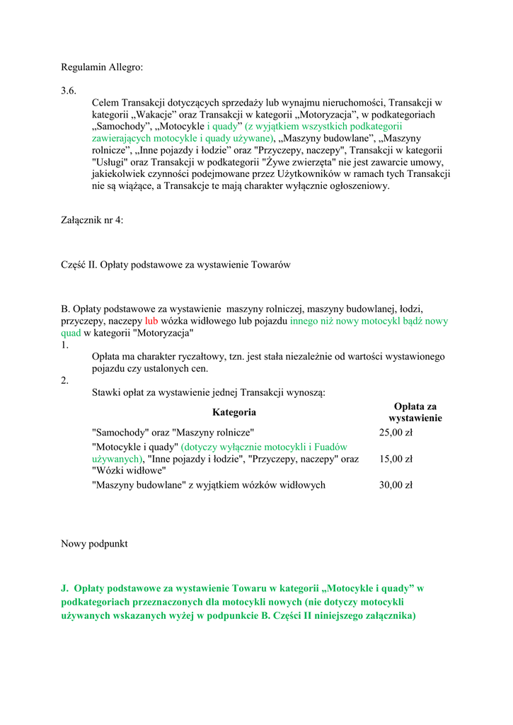 Regulamin Allegro: 3.6. Celem Transakcji dotyczących sprzedaży lub wynajmu nieruchomości, Transakcji w kategorii „Wakacje” oraz Transakcji w kategorii „Motoryzacja”, w podkategoriach „Samochody”, „Motocykle i quady” (z wyjątkiem wszystkich podkategorii zawierających motocykle i quady używane), „Maszyny budowlane”, „Maszyny rolnicze”, „Inne pojazdy i łodzie” oraz "Przyczepy, naczepy", Transakcji w kategorii "Usługi" oraz Transakcji w podkategorii "Żywe zwierzęta" nie jest zawarcie umowy, jakiekolwiek czynności podejmowane przez Użytkowników w ramach tych Transakcji nie są wiążące, a Transakcje te mają charakter wyłącznie ogłoszeniowy. Załącznik nr 4: Część II. Opłaty podstawowe za wystawienie Towarów B. Opłaty podstawowe za wystawienie maszyny rolniczej, maszyny budowlanej, łodzi, przyczepy, naczepy lub wózka widłowego lub pojazdu innego niż nowy motocykl bądź nowy quad w kategorii "Motoryzacja" 1. Opłata ma charakter ryczałtowy, tzn. jest stała niezależnie od wartości wystawionego pojazdu czy ustalonych cen. 2. Stawki opłat za wystawienie jednej Transakcji wynoszą: Opłata za Kategoria wystawienie "Samochody" oraz "Maszyny rolnicze" 25,00 zł "Motocykle i quady" (dotyczy wyłącznie motocykli i Fuadów używanych), "Inne pojazdy i łodzie", "Przyczepy, naczepy" oraz 15,00 zł "Wózki widłowe" "Maszyny budowlane" z wyjątkiem wózków widłowych 30,00 zł Nowy podpunkt J. Opłaty podstawowe za wystawienie Towaru w kategorii „Motocykle i quady” w podkategoriach przeznaczonych dla motocykli nowych (nie dotyczy motocykli używanych wskazanych wyżej w podpunkcie B. Części II niniejszego załącznika) Opłata za wystawienie Towaru we wszystkich podkategoriach kategorii "Motocykle i quady”, które przeznaczone są dla motocykli nowych ma charakter ryczałtowy, tzn. jest stała niezależnie od wartości wystawionego Towaru czy ustalonych cen i wynosi 1,00 zł. Część III. Prowizje od sprzedaży B. Prowizja od sprzedaży maszyny budowlanej, maszyny rolniczej, przyczepy, naczepy, wózka widłowego, lub łodzi lub pojazdu innego niż nowy motocykl bądź nowy quad w kategorii „Motoryzacja” Transakcje w kategorii "Motoryzacja", w podkategoriach "Samochody", "Maszyny budowlane", "Maszyny rolnicze", „Przyczepy, naczepy” oraz "Inne pojazdy i łodzie" oraz we wszystkich podkategoriach podkategorii "Motocykle i quady" przeznaczonych dla motocykli i quadów używanych, nie są objęte prowizją od sprzedaży . J. Prowizja w kategorii „Motocykle” w podkategoriach przeznaczonych dla motocykli nowych (nie dotyczy motocykli używanych wskazanych wyżej w podpunkcie B. Części III niniejszego załącznika) Stawki prowizji od sprzedaży jednej sztuki Towaru wynoszą: Cena końcowa za 1 sztukę Towaru Prowizja od sprzedaży do 1000,00 zł 2% ceny końcowej Od 1000,01 zł - 99 999zł 1% ceny końcowej Powyżej 10 000 zł 100 zł Część IV. Opłaty za opcje dodatkowe B. Opcje dodatkowe dla kategorii „Motoryzacja ” Stawki opłat za opcje dodatkowe wynoszą: Opcja dodatkowa Opłata Dodanie opcji Kup Teraz do Transakcji 0,00 zł licytacyjnej Planowane 0,05 zł wystawienie 2,00 zł przy równoczesnym zakupie Wyróżnienia (dla Transakcji wyróżnionych ikoną "Standard Allegro" cena wynosi 1,30 zł) Czas trwania Transakcji: 14 dni 0,50 zł bez równoczesnego zakupu Wyróżnienia w kategoriach : Chemia; Części do innych pojazdów; Części motocyklowe; Części samochodowe; Gadżety motoryzacyjne Literatura; Narzędzia i sprzęt warsztatowy; Części do maszyn budowlanych; Części do maszyn rolniczych; Opony (dla Transakcji wyróżnionych ikoną "Standard Allegro" cena wynosi 0,30 zł) 2,00 bez równoczesnego zakupu Wyróżnienia w kategoriach: Inne pojazdy i łodzie; Maszyny budowlane; Maszyny rolnicze; Motocykle; Przyczepy, naczepy; Samochody; 5,00 zł (Opłata zwracana w przypadku sprzedaży przedmiotu) w kategoriach: Inne pojazdy i łodzie; Maszyny budowlane; Maszyny rolnicze; Motocykle i quady; Przyczepy, naczepy; Samochody; 1,5% ceny minimalnej, nie mniej jednak niż 5,00 zł i nie więcej niż 50,00 zł (Opłata zwracana w przypadku sprzedaży przedmiotu): w kategoriach: Chemia; Części do innych pojazdów; Części motocyklowe; Części samochodowe; Gadżety motoryzacyjne; Literatura; Narzędzia i sprzęt warsztatowy; Części do maszyn rolniczych; Części do maszyn budowlanych; Opony Pierwsze zdjęcie do Zawarta w opłacie podstawowej za wystawienie Towaru (bez 200 KB* dodatkowych opłat) Każde dodatkowe zdjęcie (drugie i 0,10 zł kolejne) do 200 KB* 2,00 zł dla kategorii : Chemia; Części do innych pojazdów; Części motocyklowe; Części samochodowe; Gadżety motoryzacyjne; Literatura; Części do maszyn budowlanych; Części do maszyn rolniczych; Opony Pogrubienie Cena minimalna Podświetlenie 4,00 zł dla kategorii: Inne pojazdy i łodzie; Maszyny budowlane; Maszyny rolnicze; Motocykle; Narzędzia i sprzęt warsztatowy; Przyczepy, naczepy; Samochody; 3,00 zł dla kategorii: Chemia; Części do innych pojazdów; Części motocyklowe; Części samochodowe; Gadżety motoryzacyjne; Literatura; Części do maszyn budowlanych; Części do maszyn rolniczych; Opony 6,00 zł w kategoriach: Inne pojazdy i łodzie; Maszyny budowlane; Maszyny rolnicze; Motocykle; Narzędzia i sprzęt warsztatowy; Przyczepy, naczepy; Samochody; 19,00 zł w kategoriach: Chemia; Części do innych pojazdów; Części motocyklowe; Części samochodowe; Gadżety motoryzacyjne; Literatura; Części do maszyn budowlanych; Części do maszyn rolniczych; Opony; (dla Transakcji wyróżnionych ikoną "Standard Allegro" cena wynosi 12,00 zł) Wyróżnienie 19,00 zł w kategoriach: Maszyny budowlane; Maszyny rolnicze; Motocykle i quady; Narzędzia i sprzęt warsztatowy; Przyczepy, naczepy; 24,00 zł w kategoriach: Inne pojazdy i łodzie; Samochody Strona działu 18,00 zł w kategoriach: Chemia; Części motocyklowe; Części samochodowe; 