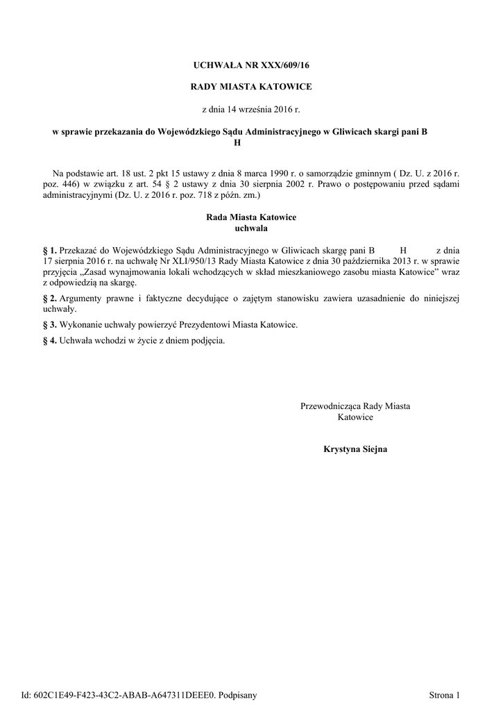 UCHWAŁA NR XXX/609/16 RADY MIASTA KATOWICE z dnia 14 września 2016 r. w sprawie przekazania do Wojewódzkiego Sądu Administracyjnego w Gliwicach skargi pani B H Na podstawie art. 18 ust. 2 pkt 15 ustawy z dnia 8 marca 1990 r. o samorządzie gminnym ( Dz. U. z 2016 r. poz. 446) w związku z art. 54 § 2 ustawy z dnia 30 sierpnia 2002 r. Prawo o postępowaniu przed sądami administracyjnymi (Dz. U. z 2016 r. poz. 718 z późn. zm.) Rada Miasta Katowice uchwala § 1. Przekazać do Wojewódzkiego Sądu Administracyjnego w Gliwicach skargę pani B H z dnia 17 sierpnia 2016 r. na uchwałę Nr XLI/950/13 Rady Miasta Katowice z dnia 30 października 2013 r. w sprawie przyjęcia „Zasad wynajmowania lokali wchodzących w skład mieszkaniowego zasobu miasta Katowice” wraz z odpowiedzią na skargę. § 2. Argumenty prawne i faktyczne decydujące o zajętym stanowisku zawiera uzasadnienie do niniejszej uchwały. § 3. Wykonanie uchwały powierzyć Prezydentowi Miasta Katowice. § 4. Uchwała wchodzi w życie z dniem podjęcia. Przewodnicząca Rady Miasta Katowice Krystyna Siejna Id: 602C1E49-F423-43C2-ABAB-A647311DEEE0. Podpisany Strona 1 Uzasadnienie Pismem z dnia 5 maja 2016 r. skierowanym do Rady Miasta Katowice pani B H wezwała Radę do usunięcia naruszania prawa polegającego na niezgodnymi z art. 4 ust. 1 i 2, art. 6a i 6b, art. 21 ust. 1 pkt 2 oraz art. 21 ust. 3 ustawy z dnia 21 czerwca 2001 r. o ochronie praw lokatorów, mieszkaniowym zasobie gminy i o zmianie Kodeksu cywilnego uregulowaniami uchwały Nr XLI/950/13 Rady Miasta Katowice z dnia 30 października 2013 r. w sprawie przyjęcia „Zasad wynajmowania lokali wchodzących w skład mieszkaniowego zasobu miasta Katowice”, w zakresie § 39 ust. 1 pkt 1. Pani B H wniosła, iż ww. regulacja narusza przepisy ustawy o ochronie praw lokatorów w zakresie wprowadzenia kryterium 5-letniego okresu zamieszkiwania z najemcą w lokalu do chwili rozwiązania umowy najmu przez najemcę, opuszczenia go i wymeldowania najemcy lub śmierci najemcy i domaga się zmiany uchwały. Rada Miasta Katowice uchwałą Nr XXVII/567/16 z dnia 29 czerwca 2016 r. w sprawie rozpatrzenia wezwania pani Bożeny Hofstede do usunięcia naruszenia prawa, nie uwzględniła wezwania do usunięcia naruszenia prawa. W uzasadnieniu do ww. uchwały wskazano, że zgodnie z art. 4 ust. 1 i 2 ustawy z dnia 21 czerwca 2001 r. o ochronie praw lokatorów, mieszkaniowym zasobie gminy i o zmianie Kodeksu cywilnego „Tworzenie warunków do zaspokajania potrzeb mieszkaniowych wspólnoty samorządowej należy do zadań własnych gminy. Gmina, na zasadach i w wypadkach przewidzianych w ustawie, zapewnia lokale socjalne i lokale zamienne, a także zaspokaja potrzeby mieszkaniowe gospodarstw domowych o niskich dochodach.” Rada gminy w drodze uchwały tworzy zasady wynajmowania lokali wchodzących w skład mieszkaniowego zasobu gminy, które zgodnie z art. 21 ust. 3 ustawy powinny określać w szczególności: 1) wysokość dochodu gospodarstwa domowego uzasadniającą oddanie w najem lub w podnajem lokalu na czas nieoznaczony i lokalu socjalnego, oraz wysokość dochodu gospodarstwa domowego uzasadniającą zastosowanie obniżek czynszu; 2) warunki zamieszkiwania kwalifikujące wnioskodawcę do ich poprawy; 3) kryteria wyboru osób, którym przysługuje pierwszeństwo zawarcia umowy najmu lokalu na czas nieoznaczony i lokalu socjalnego; 4) warunki dokonywania zamiany lokali wchodzących w skład mieszkaniowego zasobu gminy oraz zamiany pomiędzy najemcami lokali należących do tego zasobu a osobami zajmującymi lokale w innych zasobach; 5) tryb rozpatrywania i załatwiania wniosków o najem lokali zawierany na czas nieoznaczony i o najem lokali socjalnych oraz sposób poddania tych spraw kontroli społecznej; 6) zasady postępowania w stosunku do osób, które pozostały w lokalu opuszczonym przez najemcę lub w lokalu, w którego najem nie wstąpiły po śmierci najemcy; 7) kryteria oddawania w najem lokali o powierzchni użytkowej przekraczającej 80 m2. Biorąc pod uwagę zakres uprawnienia wynikający z ww. regulacji gmina w uchwale winna określić zasady regulujące kwestię zawartą w pkt 6. W mieście Katowice powyższą kwestię regulują przepisy § 39 ww. uchwały. Zgodnie z § 39 ust. 1 załącznika do uchwały Nr XLI/950/13 Rady Miasta Katowice z dnia 30 października 2013 r., w sprawie przyjęcia „Zasad wynajmowania lokali wchodzących w skład mieszkaniowego zasobu miasta Katowice” z osobami, które do dnia wejścia w życie ustawy z dnia 21 czerwca 2001 r., o ochronie praw lokatorów, mieszkaniowym zasobie gminy i o zmianie Kodeksu cywilnego, zamieszkiwały i pozostały w lokalu po rozwiązaniu umowy najmu przez najemcę, opuszczeniu go i wymeldowaniu najemcy lub pozostały w lokalu po śmierci najemcy i nie wstąpiły w stosunek najmu w trybie art. 691 § 2 Kodeksu cywilnego może zostać zawarta umowa najmu pod warunkiem, że: 1) zamieszkiwały z najemcą w lokalu do chwili rozwiązania umowy najmu przez najemcę, opuszczenia go i wymeldowania najemcy lub śmierci najemcy, jednak przez ciągły okres najmu nie krótszy niż 5 lat, poprzedzający rozwiązanie z najemcą umowy najmu lokalu, 2) nie posiadają tytułu prawnego do innego lokalu mieszkalnego, 3) utrzymują lokal w należytym stanie technicznym i sanitarnym, 4) przestrzegają regulaminu porządku domowego, 5) opłacają odszkodowanie za zajmowanie lokalu bez tytułu prawnego. Id: 602C1E49-F423-43C2-ABAB-A647311DEEE0. Podpisany Strona 1 Na podstawie ust. 2 z osobami, które po dniu wejścia w życie ustawy z dnia 21 czerwca 2001 r., o ochronie praw lokatorów, mieszkaniowym zasobie gminy i o zmianie Kodeksu cywilnego, zamieszkały i pozostały w lokalu po opuszczeniu go i wymeldowaniu najemcy lub pozostały w lokalu po śmierci najemcy i nie wstąpiły w stosunek najmu w trybie art. 691 Kodeksu cywilnego może zostać zawarta umowa najmu lokalu jeżeli spełniają warunki określone w ust. 1 i kry