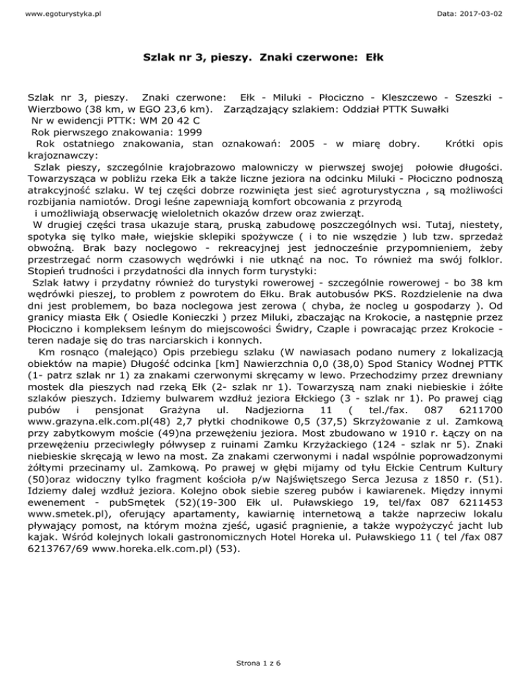 www.egoturystyka.pl Data: 2017-03-02 Szlak nr 3, pieszy. Znaki czerwone: Ełk Szlak nr 3, pieszy. Znaki czerwone: Ełk - Miluki - Płociczno - Kleszczewo - Szeszki Wierzbowo (38 km, w EGO 23,6 km). Zarządzający szlakiem: Oddział PTTK Suwałki Nr w ewidencji PTTK: WM 20 42 C Rok pierwszego znakowania: 1999 Rok ostatniego znakowania, stan oznakowań: 2005 - w miarę dobry. Krótki opis krajoznawczy: Szlak pieszy, szczególnie krajobrazowo malowniczy w pierwszej swojej połowie długości. Towarzysząca w pobliżu rzeka Ełk a także liczne jeziora na odcinku Miluki - Płociczno podnoszą atrakcyjność szlaku. W tej części dobrze rozwinięta jest sieć agroturystyczna , są możliwości rozbijania namiotów. Drogi leśne zapewniają komfort obcowania z przyrodą i umożliwiają obserwację wieloletnich okazów drzew oraz zwierząt. W drugiej części trasa ukazuje starą, pruską zabudowę poszczególnych wsi. Tutaj, niestety, spotyka się tylko małe, wiejskie sklepiki spożywcze ( i to nie wszędzie ) lub tzw. sprzedaż obwoźną. Brak bazy noclegowo - rekreacyjnej jest jednocześnie przypomnieniem, żeby przestrzegać norm czasowych wędrówki i nie utknąć na noc. To również ma swój folklor. Stopień trudności i przydatności dla innych form turystyki: Szlak łatwy i przydatny również do turystyki rowerowej - szczególnie rowerowej - bo 38 km wędrówki pieszej, to problem z powrotem do Ełku. Brak autobusów PKS. Rozdzielenie na dwa dni jest problemem, bo baza noclegowa jest zerowa ( chyba, że nocleg u gospodarzy ). Od granicy miasta Ełk ( Osiedle Konieczki ) przez Miluki, zbaczając na Krokocie, a następnie przez Płociczno i kompleksem leśnym do miejscowości Świdry, Czaple i powracając przez Krokocie teren nadaje się do tras narciarskich i konnych. Km rosnąco (malejąco) Opis przebiegu szlaku (W nawiasach podano numery z lokalizacją obiektów na mapie) Długość odcinka [km] Nawierzchnia 0,0 (38,0) Spod Stanicy Wodnej PTTK (1- patrz szlak nr 1) za znakami czerwonymi skręcamy w lewo. Przechodzimy przez drewniany mostek dla pieszych nad rzeką Ełk (2- szlak nr 1). Towarzyszą nam znaki niebieskie i żółte szlaków pieszych. Idziemy bulwarem wzdłuż jeziora Ełckiego (3 - szlak nr 1). Po prawej ciąg pubów i pensjonat Grażyna ul. Nadjeziorna 11 ( tel./fax. 087 6211700 www.grazyna.elk.com.pl(48) 2,7 płytki chodnikowe 0,5 (37,5) Skrzyżowanie z ul. Zamkową przy zabytkowym moście (49)na przewężeniu jeziora. Most zbudowano w 1910 r. Łączy on na przewężeniu przeciwległy półwysep z ruinami Zamku Krzyżackiego (124 - szlak nr 5). Znaki niebieskie skręcają w lewo na most. Za znakami czerwonymi i nadal wspólnie poprowadzonymi żółtymi przecinamy ul. Zamkową. Po prawej w głębi mijamy od tyłu Ełckie Centrum Kultury (50)oraz widoczny tylko fragment kościoła p/w Najświętszego Serca Jezusa z 1850 r. (51). Idziemy dalej wzdłuż jeziora. Kolejno obok siebie szereg pubów i kawiarenek. Między innymi ewenement - pubSmętek (52)(19-300 Ełk ul. Puławskiego 19, tel/fax 087 6211453 www.smetek.pl), oferujący apartamenty, kawiarnię internetową a także naprzeciw lokalu pływający pomost, na którym można zjeść, ugasić pragnienie, a także wypożyczyć jacht lub kajak. Wśród kolejnych lokali gastronomicznych Hotel Horeka ul. Puławskiego 11 ( tel /fax 087 6213767/69 www.horeka.elk.com.pl) (53). Strona 1 z 6 www.egoturystyka.pl Data: 2017-03-02 Szlak nr 3, pieszy. Znaki czerwone: Ełk 1,3 (36,7) Przed nowym gmachem Wyższej Szkoły Finansów i Zarządzania opuszczamy brzeg jeziora i skręcamy w prawo. W gmachu szkoły znajduje się hotel (54) (19-300 Ełk ul. Grunwaldzka 1 ( tel /fax 087 6211446 www.wsfiz.edu.pl). W głębi na półwyspie nad jeziorem widoczny lokal dyskotekowy Biały Żagiel (55)(19 - 300 Ełk, ul Grunwaldzka 12, tel. 087 6104759). Tuż za nim niewidoczna ze szlaku dzika plaża oraz Międzyszkolny Ośrodek Sportowy (56) (19- 300 Ełk ul. Grunwaldzka 10, tel. 087 6103769 ) z basenem wodnym w budynku do ćwiczeń wioślarskich dla zawodników. Ośrodek prowadzi wypożyczalnię sprzętu wodnego. Obok tablica informacyjna Szlaki Wodne i Rowerowe w Powiecie Ełckim (VII). 1.4 (36,6) Skrzyżowanie z ul. Wojska Polskiego. Skręcamy w lewo. 1,6 (36,4) Skrzyżowanie niesłusznie nazywane rondem. Znaki żółte prowadzą na wprost. Za znakami czerwonymi skręcamy w prawo, w ul. Sikorskiego. Po lewej mijamy zabytkową Wieżę Ciśnień (57)z 1895 r. , zakupioną przez Mniejszość Niemiecką Mazury. W Wieży Ciśnień znajduje się Muzeum Kropli Wody (19 -300 Ełk, ul. 11 listopada 2, tel. 087 621 3200). 1,9 (36,1) Po lewej gmachy szkół średnich, m.in. z Bursą Szkolną (58)(ul. Sikorskiego 5A) oraz Bursą Szkolną (59)ul. Sikorskiego 7A (tel. 087 6212514). Możliwość noclegów. Przed bursą przy Sikorskigo 5A tablica informacyjna : Szlaki Wodne i Rowerowe w Powiecie Ełckim (V). Po prawej gmach Pływalni Miejskiej MOSiR (60) (ul. Piłsudskiego 29, tel. 087 6216480 www.mosir.elk.com.pl).Za pływalnią Stadion Miejski (61). 2,7 (35,3) Przejazd kolejowy linii Ełk - Olsztyn (62). Tuż za nim skręcamy w lewo. Idziemy za znakami wzdłuż ogródków działkowych drogą żwirową. 1,3 gruntowa utwardzona 3,4 (34,6) Kończą się ogródki działkowe. Idziemy prosto. Po lewej mijamy supermarket Apacki (63), a po prawej Szkołę Podstawową nr 9 (64). 4,0 (34,0) Skrzyżowanie z szosą asfaltową. Idziemy prosto asfaltem. 0,5 asfalt 4,4 (33,6) Po prawej mijamy Przedsiębiorstwo Robót Drogowych (65). 4,5 (33,5) Skrzyżowanie z nitką ostatnio wybudowanej od prawej obwodnicy. Przecinamy skrzyżowanie, idąc prosto drogą żwirową. 1,1 gruntowa utwardzona 5,6 (32,4) Skrzyżowanie dróg polnych. Za znakami czerwonymi skręcamy w prawo. Droga żwirowa przyjmuje postać piaszczystej i prowadzi na przemian przez łąki i obszary leśne. 2,9 gruntowa nieutwardzona 8,0 (30,0) Koniec lasu. Po prawej prywatna zabudowa rekreacyjna nad rzeką Ełk w 