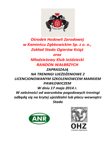 Ośrodek Hodowli Zarodowej w Kamieńcu Ząbkowickim Sp. z o. o., Zakład Stado Ogierów Książ oraz Młodzieżowy Klub Jeździecki RANDON WAŁBRZYCH ZAPRASZAJĄ NA TRENINGI UJEŻDŻENIOWE Z LICENCJONOWANYM SZKOLENIOWCEM MARKIEM PAWŁOWICZEM W dniu 17 maja 2014 r. W zależności od warunków pogodowych treningi odbędą się na krytej ujeżdżalni lub placu wewnątrz Stada I. INFORMACJE OGÓLNE: 1.1. Miejsce odbywania treningów: Szkoleniowiec: Termin: 1.2. Stado Ogierów Książ, 58-306 Wałbrzych, ul. Jeździecka 3 Marek Pawłowicz 17 maja 2014 r. planowane godziny treningów 9.00 – 13.00, w zależności od liczby zgłoszonych par Organizatorzy: OHZ w Kamieńcu Ząbkowickim Sp. z o. o., Zakład Stado Ogierów Książ, Młodzieżowy Klub Jeździecki RANDON WAŁBRZYCH tel./fax.: 74-840-58-60 Sekretariat: [email protected] lub Marketing: [email protected] II. UDZIAŁ: Uczestnicy na koszt własny, bez ograniczeń, konie z szczepieniami przeciwko grypie. III. WARUNKI TECHNICZNE: 3.1. Treningi planowane na placu wewnątrz SO Książ 3.2. W przypadku niesprzyjających warunków pogodowych treningi odbędą się w krytej ujeżdżalni IV. ZGŁOSZENIA i OPŁATY: Zgłoszenia uczestników i koni należy przesyłać w terminie do dnia 15 maja 2014 r. do godz. 12.00, na adres e-mail [email protected] lub [email protected] Opłata organizacyjna – 35,00 zł od treningu Istnieje możliwość zarezerwowania wcześniej boksów/stanowisk dla koni w cenie 25,00 zł od konia/dzień. Liczba ograniczona. W sprawie rezerwacji proszę kontaktować się tylko z panią Danutą Derą tel. 74/ 840 58 67 V. DOKUMENTACJA I PRZEPISY WETERYNARYJNE: Wymagana dokumentacja dla koni: Konie muszą posiadać ważny paszport (hodowlany bądź sportowy), aktualne badania i szczepienia. Bez w/w dokumentu konie nie będą dopuszczone do treningu, ani wpuszczone na teren Stada. VI. RÓŻNE: Organizator nie ponosi odpowiedzialności za zaistniałe szkody, wypadki i kradzieże. Listy treningowe do wglądu w przed dzień treningów od godz. 15.00 na stronie www.stadoksiaz.pl W PRZYPADKU REZYGNACJI Z UDZIAŁU W TRENINGACH, INFORMACJĘ NALEŻY PODAĆ DO ORGANIZATORA NAJPÓŹNIEJ NA DZIEŃ PRZED TRENINGAMI.