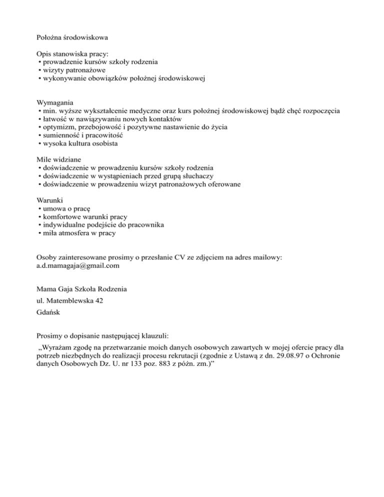 Położna środowiskowa Opis stanowiska pracy: • prowadzenie kursów szkoły rodzenia • wizyty patronażowe • wykonywanie obowiązków położnej środowiskowej Wymagania • min. wyższe wykształcenie medyczne oraz kurs położnej środowiskowej bądź chęć rozpoczęcia • łatwość w nawiązywaniu nowych kontaktów • optymizm, przebojowość i pozytywne nastawienie do życia • sumienność i pracowitość • wysoka kultura osobista Mile widziane • doświadczenie w prowadzeniu kursów szkoły rodzenia • doświadczenie w wystąpieniach przed grupą słuchaczy • doświadczenie w prowadzeniu wizyt patronażowych oferowane Warunki • umowa o pracę • komfortowe warunki pracy • indywidualne podejście do pracownika • miła atmosfera w pracy Osoby zainteresowane prosimy o przesłanie CV ze zdjęciem na adres mailowy: [email protected] Mama Gaja Szkoła Rodzenia ul. Matemblewska 42 Gdańsk Prosimy o dopisanie następującej klauzuli: „Wyrażam zgodę na przetwarzanie moich danych osobowych zawartych w mojej ofercie pracy dla potrzeb niezbędnych do realizacji procesu rekrutacji (zgodnie z Ustawą z dn. 29.08.97 o Ochronie danych Osobowych Dz. U. nr 133 poz. 883 z póżn. zm.)”