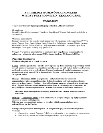 XVII MIĘDZYWOJEWÓDZKI KONKURS WIEDZY PRZYRODNICZO - EKOLOGICZNEJ REGULAMIN Tegoroczny konkurs będzie przebiegać pod hasłem „Ptaki wokół nas” Organizator Zespół Parków Krajobrazowych Pojezierza Iławskiego i Wzgórz Dylewskich z siedzibą w Jerzwałdzie Warunki uczestnictwa Konkurs skierowany do uczniów szkół podstawowych nauczania blokowego klasy IV-VI z gmin: Zalewo, Susz, Iława, Miasto Iława, Miłomłyn, Dąbrówno, Lubawa, Miasto Lubawa, Grunwald, Ostróda, Miasto Ostróda - województwo warmińsko - mazurskie i gm. Stary Dzierzgoń, Dzierzgoń, Prabuty, woj. pomorskie. Uwaga! Warunkiem uczestnictwa w konkursie jest wypełnienie załączonej karty zgłoszenia i odesłanie jej na adres ZPK w Jerzwałdzie do 30 listopada 2011r. Przebieg Konkursu Konkurs odbędzie się w trzech etapach: I Etap – eliminacje szkolne – szkoły, które zgłoszą się do konkursu przeprowadzą wśród swoich uczniów konkurs w postaci testu składającego się z 20 pytań. Cztery osoby, które najlepiej rozwiążą test przechodzą do II etapu konkursu. Pytania konkursowe zostaną przesłane do szkół przez ZPK w Jerzwałdzie. Termin realizacji etapu szkolnego: 20 styczeń 2012r. II Etap – 20 marzec 2012r. etap gminny – odbędzie się między szkołami reprezentującymi poszczególne gminy. Celem tego etapu jest wyłonienie najlepszej drużyny z danej gminy. Drużyny również będą rozwiązywały pisemnie test składający się z 25 pytań. II etap – gminny konkursu odbędzie się w kilku miejscach, w zależności od otrzymanych na konkurs zgłoszeń m.in.: w Iławie, w Lubawie, w Ostródzie, Prabutach. Dokładne miejsca oraz godziny eliminacji podane zostaną szkołom biorącym udział w konkursie. III Etap – 12 czerwiec 2012 r. Finał Konkursu, w którym zmagać się będą najlepsze drużyny z terenu każdej gminy. Miejsce tego etapu zostanie podane w terminie późniejszym szkołom, które zakwalifikują się do Finału. Finał przebiegać będzie dwuetapowo. W obrębie drużyny czteroosobowej należy wyłonić: dwuosobowy zespół "terenowy", który weźmie udział w przyrodniczym marszobiegu dwuosobowy zespół, który będzie odpowiadał na pytania przyrodnicze 1. Quiz terenowy - dwuosobowa drużyna - "terenowa", pokonuje trasę ok.1 km, na której znajdować się będą pytania dotyczące rozpoznawania pospolitych gatunków roślin i zwierząt. Punktowany będzie czas pokonania trasy oraz poprawność odpowiedzi. 2. Quiz wiedzy przyrodniczej - dwuosobowa drużyna - "wiedzy", będzie odpowiadała na pytania z zakresu wiedzy przyrodniczej, ekologicznej i ochrony przyrody. Punkty uzyskane w obydwu konkurencjach, będą sumowane do ogólnej punktacji startującej szkoły. Na konkurs zapraszamy kibiców z każdej szkoły. Jury Drużyny ocenia niezależne jury powołane przez organizatorów. Ponadto do jego zadań należeć będzie rozstrzyganie spraw nieujętych w regulaminie lub spornych. Nagrody Zwycięzcy otrzymują nagrody indywidualne i nagrodę dla szkoły. Wymagany zakres wiadomości: - wiedza na poziomie nauczania blokowego z zakresu: przyrody i ochrony środowiska, ponadto znajomość: - pospolitych gatunków ptaków żyjących na wsi, w mieście. - form ochrony przyrody w Polsce, - przyrody i kultury Parku Krajobrazowego Pojezierza Iławskiego i Parku Krajobrazowego Wzgórz Dylewskich, - Parków Krajobrazowych z terenu województwa warmińsko - mazurskiego, - ochrony gatunkowej roślin i zwierząt, - rozpoznawania pospolitych gatunków roślin i zwierząt związanych z żyjącymi i martwymi drzewami. Proponowana literatura: - Wydawnictwa ZPK w Jerzwałdzie dotyczące przyrody i kultury Parku Krajobrazowego Pojezierza Iławskiego i Parku Krajobrazowego Wzgórz Dylewskich, (podstawowe informacje na temat obydwu parków znajdują się na stronie: www.pkwim.pl) - Podręczniki do przyrody kl. IV –VI szkoły podstawowej. - Przewodniki do rozpoznawania drzew, roślin, grzybów i zwierząt. Uwaga! Szkoły zgłaszające się do konkursu uprzejmie proszę o podanie na karcie zgłoszeniowej adresu meilowego, za pomocą którego będziemy mogli kontaktować się z Państwem – zmniejszy to koszty i umożliwi szybki kontakt. Zapraszamy do udziału! Adres organizatora: Zespół Parków Krajobrazowych w Jerzwałdzie 14-233 Jerzwałd Tel/fax 0-89 758 85 27 e-mail: [email protected] koordynator konkursu: Alina Rodziewicz