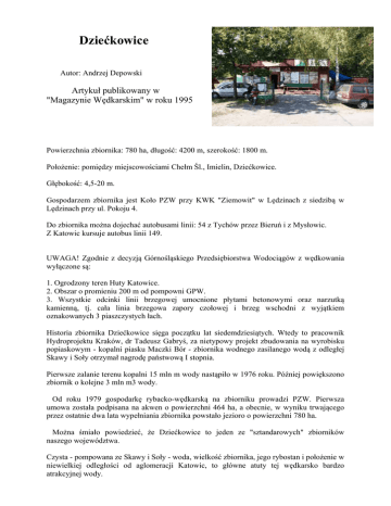 Dziećkowice Autor: Andrzej Depowski Artykuł publikowany w "Magazynie Wędkarskim" w roku 1995 Powierzchnia zbiornika: 780 ha, długość: 4200 m, szerokość: 1800 m. Położenie: pomiędzy miejscowościami Chełm Śl., Imielin, Dziećkowice. Głębokość: 4,5-20 m. Gospodarzem zbiornika jest Koło PZW przy KWK "Ziemowit" w Lędzinach z siedzibą w Lędzinach przy ul. Pokoju 4. Do zbiornika można dojechać autobusami linii: 54 z Tychów przez Bieruń i z Mysłowic. Z Katowic kursuje autobus linii 149. UWAGA! Zgodnie z decyzją Górnośląskiego Przedsiębiorstwa Wodociągów z wędkowania wyłączone są: 1. Ogrodzony teren Huty Katowice. 2. Obszar o promieniu 200 m od pompowni GPW. 3. Wszystkie odcinki linii brzegowej umocnione płytami betonowymi oraz narzutką kamienną, tj. cała linia brzegowa zapory czołowej i brzeg wschodni z wyjątkiem oznakowanych 3 piaszczystych łach. Historia zbiornika Dziećkowice sięga początku lat siedemdziesiątych. Wtedy to pracownik Hydroprojektu Kraków, dr Tadeusz Gabryś, za nietypowy projekt zbudowania na wyrobisku popiaskowym - kopalni piasku Maczki Bór - zbiornika wodnego zasilanego wodą z odległej Skawy i Soły otrzymał nagrodę państwową I stopnia. Pierwsze zalanie terenu kopalni 15 mln m wody nastąpiło w 1976 roku. Później powiększono zbiornik o kolejne 3 mln m3 wody. Od roku 1979 gospodarkę rybacko-wędkarską na zbiorniku prowadzi PZW. Pierwsza umowa została podpisana na akwen o powierzchni 464 ha, a obecnie, w wyniku trwającego przez ostatnie dwa lata wypełniania zbiornika powstało jezioro o powierzchni 780 ha. Można śmiało powiedzieć, że Dziećkowice to jeden ze "sztandarowych" zbiorników naszego województwa. Czysta - pompowana ze Skawy i Soły - woda, wielkość zbiornika, jego rybostan i położenie w niewielkiej odległości od aglomeracji Katowic, to główne atuty tej wędkarsko bardzo atrakcyjnej wody. Rybostan Dziećkowic to praktycznie wszystkie występujące w polskich wodach gatunki ryb jeziorowych ze szczupakiem, sandaczem, karpiem, płocią i amurem na czele (w bieżącym roku został zniesiony zakaz połowu amura), ale i ryby typowo rzeczne takie jak kleń czy jelec. Trudno w chwili obecnej polecać konkretne miejsca na zbiorniku, dające możliwość złowienia danego gatunku ryb. Akwen po ostatnim spiętrzeniu wody zmienił się nie do poznania i nawet stali bywalcy "uczą się" wody na nowo. Nie ma problemów ze złowieniem wszędobylskiej płoci, leszczy-średniaków ale namierzenie grubych - takich 60-,80 cm leszczy, z okazałym sandaczem na brzegu zachodnim których na Dziećkowicach nie brakuje, to pole do popisu dla wytrwałych wędkarzy. Najogólniej rzecz biorąc, podstawą sukcesu jest znalezienie wszelkiego rodzaju wypłyceń. Teren zalanej wyspy (głębokość ok. 4,5 m), wypłycenia na brzegu wschodnim, okolice rybaczówki to najlepsze miejsca połowu szczupaków, karpi, leszczy, dużych okoni. Sandacze coraz częściej łowione są w najgłębszej części zbiornika od strony Gamrotu, naprzeciw pompowni GPW, ale można również spotkać się z okazałym sandaczem na brzegu zachodnim w okolicach przystani żeglarskiej i na terenie wspomnianej wyżej zalanej wyspy. Wędkarze łowiący z brzegu mogą liczyć na sukces łowiąc w bezpośredniej jego okolicy, nie ma sensu wyrzucanie przynęty byle dalej poszukać gruntomierzem stoku lub piaszczystej górki. Nie ulega wątpliwości, że wędkujący z łodzi - poznawszy zbiornik - znacznie zwiększają swoje szanse na naprawdę "grube" dziećkowickie ryby. Polecam więc łodzie wypożyczane w rybaczówce lędzińskiego koła. Zbiornik Dziećkowice jest zbiornikiem intensywnie zarybianym Przed nami coroczne zarybienie jesienne, gdy do wody trafią karpie, amury, liny, a już w bieżącym roku rybostan zbiornika zasiliło: 22 kg węgorza montée (około 70 tys. szt.), 37 tys. szt. narybku letniego i 205 kg narybku jesiennego szczupaka. Za parę lat komplety metrowych szczupaków i węgorzy gwarantowane... nie polecam więc Dziećkowic - chcę tam... łowić sam! P.S. Koła PZW sąsiadujące ze zbiornikiem - Imielin, Dehak, Bieruń N., Piast, Jeleń - na mocy zawartego między zarządami Kół porozumienia opiekują się konkretnymi odcinkami linii brzegowej. Chyba jednak opieka ta nie jest w chwili obecnej najlepsza, ponieważ ilość śmieci na brzegach jest zatrważająca! Koledzy, obudźmy się!