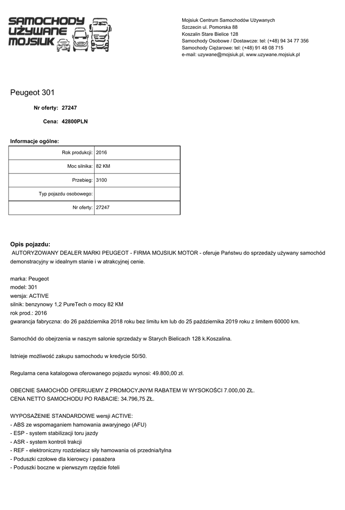 Mojsiuk Centrum Samochodów Używanych Szczecin ul. Pomorska 88 Koszalin Stare Bielice 128 Samochody Osobowe / Dostawcze: tel: (+48) 94 34 77 356 Samochody Ciężarowe: tel: (+48) 91 48 08 715 e-mail: [email protected], www.uzywane.mojsiuk.pl Peugeot 301 Nr oferty: 27247 Cena: 42800PLN Informacje ogólne: Rok produkcji: 2016 Moc silnika: 82 KM Przebieg: 3100 Typ pojazdu osobowego: Nr oferty: 27247 Opis pojazdu: AUTORYZOWANY DEALER MARKI PEUGEOT - FIRMA MOJSIUK MOTOR - oferuje Państwu do sprzedaży używany samochód demonstracyjny w idealnym stanie i w atrakcyjnej cenie. marka: Peugeot model: 301 wersja: ACTIVE silnik: benzynowy 1,2 PureTech o mocy 82 KM rok prod.: 2016 gwarancja fabryczna: do 26 października 2018 roku bez limitu km lub do 25 października 2019 roku z limitem 60000 km. Samochód do obejrzenia w naszym salonie sprzedaży w Starych Bielicach 128 k.Koszalina. Istnieje możliwość zakupu samochodu w kredycie 50/50. Regularna cena katalogowa oferowanego pojazdu wynosi: 49.800,00 zł. OBECNIE SAMOCHÓD OFERUJEMY Z PROMOCYJNYM RABATEM W WYSOKOŚCI 7.000,00 ZŁ. CENA NETTO SAMOCHODU PO RABACIE: 34.796,75 ZŁ. WYPOSAŻENIE STANDARDOWE wersji ACTIVE: - ABS ze wspomaganiem hamowania awaryjnego (AFU) - ESP - system stabilizacji toru jazdy - ASR - system kontroli trakcji - REF - elektroniczny rozdzielacz siły hamowania oś przednia/tylna - Poduszki czołowe dla kierowcy i pasażera - Poduszki boczne w pierwszym rzędzie foteli - Mocowania fotelika dziecięcego Isofix (x2) w drugim rzędzie siedzeń - Światła do jazdy dziennej - Światła przeciwmgielne - Centralny zamek sterowany z pilota - Immobiliser - Wspomaganie kierownicy elektryczne - Regulacja kolumny kierownicy manualna w pionie - Tempomat - Elektrycznie sterowane szyby boczne przednie i tylne - Lusterka boczne sterowane i podgrzewane elektrycznie - Klimatyzacja - Felgi stalowe 15" - Komputer pokładowy - Radioodtwarzacz CD i MP3 + 2 głośniki - Czujnik spadku ciśnienia w oponach - Koło zapasowe stalowe pełnowymiarowe ZAPRASZAMY NA OGLĘDZINY i JAZDĘ PRÓBNĄ. Niniejsze ogłoszenie jest wyłącznie informacją handlową i nie stanowi oferty w myśl art.66§1 Kodeksu Cywilnego. Sprzedający nie odpowiada za ewentualne błędy lub nieaktualność ogłoszenia. Jest to informacja handlowa nie stanowiąca oferty w rozumieniu prawa cywilnego, kolory na zdjęciach mogą być inne niż w rzeczywistości. Oferta nie przedstawia rzeczywistych stanów magazynowych