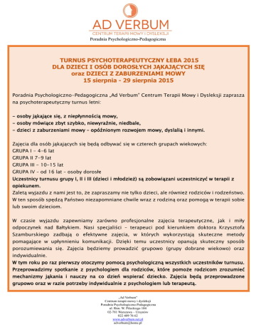Poradnia Psychologiczno-Pedagogiczna TURNUS PSYCHOTERAPEUTYCZNY ŁEBA 2015 DLA DZIECI I OSÓB DOROSŁYCH JĄKAJĄCYCH SIĘ oraz DZIECI Z ZABURZENIAMI MOWY 15 sierpnia - 29 sierpnia 2015 Poradnia Psychologiczno-Pedagogiczna „Ad Verbum” Centrum Terapii Mowy i Dysleksji zaprasza na psychoterapeutyczny turnus letni: - osoby jąkające się, z niepłynnością mowy, - osoby mówiące zbyt szybko, niewyraźnie, niedbale, - dzieci z zaburzeniami mowy – opóźnionym rozwojem mowy, dyslalią i innymi. Zajęcia dla osób jąkających się będą odbywać się w czterech grupach wiekowych: GRUPA I - 4-6 lat GRUPA II 7-9 lat GRUPA III - 10-15 lat GRUPA IV – od 16 lat – osoby dorosłe Uczestnicy turnusu grupy I, II i III (dzieci i młodzież) są zobowiązani uczestniczyć w terapii z opiekunem. Zaletą wyjazdu z nami jest to, że zapraszamy nie tylko dzieci, ale również rodziców i rodzeństwo. W ten sposób spędzą Państwo niezapomniane chwile wraz z rodziną oraz pomogą w terapii sobie lub swoim dzieciom. W czasie wyjazdu zapewniamy zarówno profesjonalne zajęcia terapeutyczne, jak i miły odpoczynek nad Bałtykiem. Nasi specjaliści – terapeuci pod kierunkiem doktora Krzysztofa Szamburskiego zadbają o efektywne zajęcia, w których wykorzystają skuteczne metody pomagające w upłynnieniu komunikacji. Dzięki temu uczestnicy opanują skuteczny sposób porozumiewania się. Zajęcia będziemy prowadzić grupowo (grupy dobrane wiekowo) oraz indywidualnie. W tym roku po raz pierwszy otoczymy pomocą psychologiczną wszystkich uczestników turnusu. Przeprowadzimy spotkanie z psychologiem dla rodziców, które pomoże rodzicom zrozumieć mechanizmy jąkania i nauczy na co dzień wspierać dziecko. Zajęcia będą przeprowadzone grupowo oraz w razie potrzeby indywidualnie z psychologiem lub terapeutą. „Ad Verbum” Centrum terapii mowy i dysleksji Poradnia Psychologiczno-Pedagogiczna ul. Rtm. W. Pileckiego 104 02-781 Warszawa – Ursynów 022 409 76 62 www.adverbum.net.pl [email protected] TERAPIA Autorem programu terapii jest doktor Krzysztof Szamburski, doktor nauk humanistycznych, psycholog i logopeda. Zagadnieniami patomechanizmu powstawania jąkania oraz jego terapii zajmuje się od kilkunastu lat. Jąkanie traktuje jako zaburzenie o podłożu emocjonalnym. Jest twórcą autorskiej metody terapii jąkania i pracownikiem naukowo-dydaktycznym Uniwersytetu Warszawskiego. Jest dyrektorem Specjalistycznej Poradni Psychologiczno-Pedagogicznej TOP oraz kierownikiem Pomagisterskiego Studium Logopedycznego Instytutu Języka Polskiego UW. Współzałożyciel kierunku Logopedia Medialna w WSKMS im. Gierdroycia, http://wskims.edu.pl/podyplomowe/ oraz Kierownik dwuletnich studiów podyplomowych – Logopedia ze specjalizacją medialną. To autor wielu artykułów w prasie i wydawnictwach specjalistycznych. Jako ekspert wielokrotnie prowadził szkolenia terapeutów w całej Polsce oraz grupy terapeutyczne osób jąkających się na turnusach rehabilitacyjnych. Sylwetki pozostałych terapeutów zostaną przedstawione uczestnikom po zakwalifikowaniu do odpowiedniej grupy. Program terapii jest programem autorskim, stworzonym przez doktora Krzysztofa Szamburskiego. Program obozu to 60 godzin lekcyjnych terapii logopedycznej, pedagogicznej i psychologicznej, prowadzonej od poniedziałku do piątku od godziny 10.00 do 14.00 oraz po południu 18.00- 19.00 W terapii grupowej dziecka bierze udział jeden rodzic. Opiekun uczestniczy w zajęciach terapeutycznych, co pozwoli mu na lepsze zrozumienie problematyki jąkania oraz pozwoli zapewnić wsparcie i poczucie bezpieczeństwa dziecku zarówno podczas terapii, jak i w życiu codziennym. PROGRAM TERAPII JĄKANIA: 1. Diagnoza zaburzeń komunikacji. Rozmowa z dzieckiem, rodzicem oraz wspólna umowa dotycząca planowanej terapii jąkania. 2. Ćwiczenia mające na celu poznanie się członków grupy (elementy ćwiczeń z Metody Ruchu Rozwijającego Weroniki Sherborn, metoda Dobrego Startu Marty Bogdanowicz, elementy (SI) Integracji Sensorycznej i inne) 3. Przedstawienie istoty problemów osób jąkających się uczestnikom terapii. 4. Dostosowanie terapii do indywidualnych potrzeb dziecka. „Ad Verbum” Centrum terapii mowy i dysleksji Poradnia Psychologiczno-Pedagogiczna ul. Rtm. W. Pileckiego 104 02-781 Warszawa – Ursynów 022 409 76 62 www.adverbum.net.pl [email protected] PROGRAM TERAPII JĄKANIA: Terapia pomoże panować nad oddechem, w opanowaniu i wzmocnieniu prawidłowej intonacji w mowie. Terapeuci nauczą skutecznej autoprezentacji, jak kształtować kontakty interpersonalne, poradzą w jaki sposób przezwyciężać stres i publicznie się wypowiadać. Celem zajęć jest poprawienie zrozumiałości wypowiedzi i zmniejszanie lęku przed mówieniem, skutecznych sposobów radzenia sobie podczas mówienia w warunkach stresu. ćwiczenia nad poznaniem siebie i wzmacniające samoocenę, nauka sposobów radzenia sobie z jąkaniem: nauka „pomocy ręki”, rytmizacja, wykorzystanie ruchu, gestu, wyobraźni, elementy dramy, ćwiczenia praktyczne w terenie - w sytuacjach zbliżonych do rzeczywistych - używanie wyuczonych technik poprawiających płynność w mówieniu, aktywne włączanie rodziców/opiekunów dzieci do zajęć terapii jąkania. Terapia nastawiona jest przede wszystkim na uzyskanie lub poprawienie płynności mówienia. Są to głównie oddziaływania logopedyczne wykorzystujące następujące metody : · rytmizacja mówienia · zwolnienie tempa mówienia · regulacja oddechu · kontrola napięcia mięśni podczas mówienia · wsparcie gestykulacyjne · trening słuchowy · relaksacja · elementy dramy W terapii jąkania wykorzystuje się następujące ćwiczenia: a) ćwiczenia mające na celu poznanie swojego ciała, zmysłowego odbierania bodźców z otoczenia, nabywania nowych umiejętności oraz lepszego rozumienia własnych trudności w komunikacji, b) ćwiczenia oddechowe, artykulacji i emisji głosu, c) ćwiczenia z elementami 