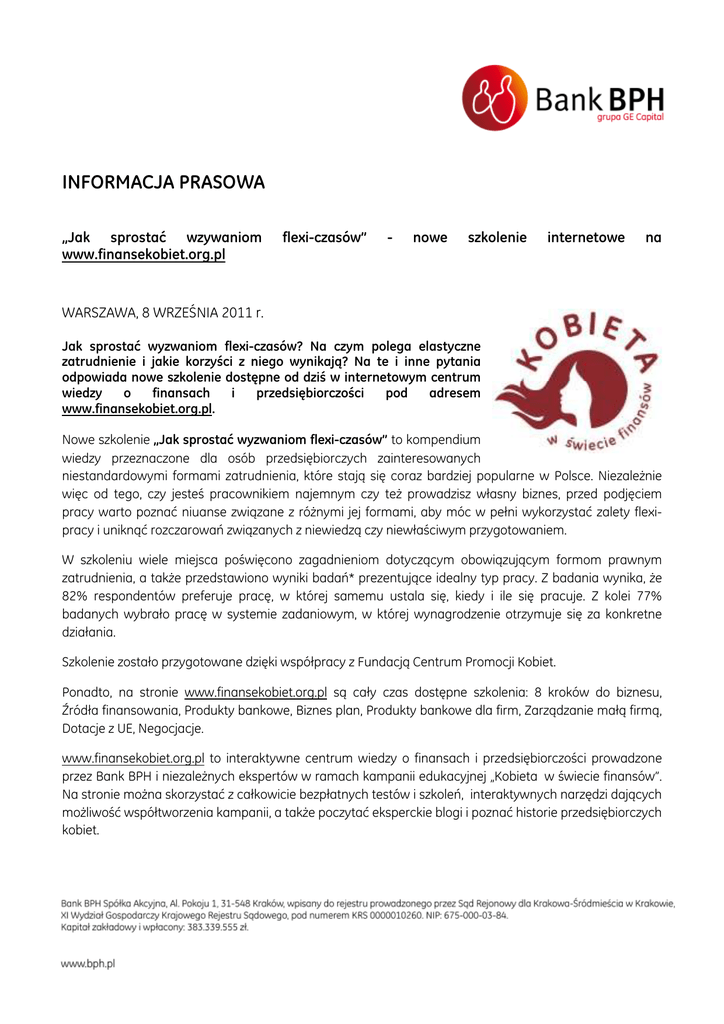 INFORMACJA PRASOWA „Jak sprostać wzywaniom www.finansekobiet.org.pl flexi-czasów” - nowe szkolenie internetowe na WARSZAWA, 8 WRZEŚNIA 2011 r. Jak sprostać wyzwaniom flexi-czasów? Na czym polega elastyczne zatrudnienie i jakie korzyści z niego wynikają? Na te i inne pytania odpowiada nowe szkolenie dostępne od dziś w internetowym centrum wiedzy o finansach i przedsiębiorczości pod adresem www.finansekobiet.org.pl. Nowe szkolenie „Jak sprostać wyzwaniom flexi-czasów” to kompendium wiedzy przeznaczone dla osób przedsiębiorczych zainteresowanych niestandardowymi formami zatrudnienia, które stają się coraz bardziej popularne w Polsce. Niezależnie więc od tego, czy jesteś pracownikiem najemnym czy też prowadzisz własny biznes, przed podjęciem pracy warto poznać niuanse związane z różnymi jej formami, aby móc w pełni wykorzystać zalety flexipracy i uniknąć rozczarowań związanych z niewiedzą czy niewłaściwym przygotowaniem. W szkoleniu wiele miejsca poświęcono zagadnieniom dotyczącym obowiązującym formom prawnym zatrudnienia, a także przedstawiono wyniki badań* prezentujące idealny typ pracy. Z badania wynika, że 82% respondentów preferuje pracę, w której samemu ustala się, kiedy i ile się pracuje. Z kolei 77% badanych wybrało pracę w systemie zadaniowym, w której wynagrodzenie otrzymuje się za konkretne działania. Szkolenie zostało przygotowane dzięki współpracy z Fundacją Centrum Promocji Kobiet. Ponadto, na stronie www.finansekobiet.org.pl są cały czas dostępne szkolenia: 8 kroków do biznesu, Źródła finansowania, Produkty bankowe, Biznes plan, Produkty bankowe dla firm, Zarządzanie małą firmą, Dotacje z UE, Negocjacje. www.finansekobiet.org.pl to interaktywne centrum wiedzy o finansach i przedsiębiorczości prowadzone przez Bank BPH i niezależnych ekspertów w ramach kampanii edukacyjnej „Kobieta w świecie finansów”. Na stronie można skorzystać z całkowicie bezpłatnych testów i szkoleń, interaktywnych narzędzi dających możliwość współtworzenia kampanii, a także poczytać eksperckie blogi i poznać historie przedsiębiorczych kobiet. Dotychczas z narzędzi kampanii dostępnych na www.finansekobiet.org.pl skorzystało ponad 100 000 internautów. * Badanie czynników warunkujących wykorzystanie niestandardowych form zatrudnienia w Polsce, Z. Dziubiński, M. Kowalewski (red. nauk.), Wyższa Szkoła Zarządzania Personelem, Warszawa 2008, s. 94. Projekt wykonywany we współpracy z: SMG/KRC Poland Media S.A. oraz Fundacją „Kobiety dla Kobiet”. *** „Kobieta w świecie finansów” to kampania realizowana przez Bank BPH w ramach międzynarodowej inicjatywy GE Capital – Banking on Women (Stawiamy na kobiety). Jej celem jest wspieranie kobiet w dążeniu do niezależności poprzez edukację finansową i promocję przedsiębiorczości. W ramach kampanii Bank BPH wraz z niezależnymi ekspertami prowadzi interaktywne centrum wiedzy o finansach, które znajduje się pod adresem www.finansekobiet.org.pl. Bank BPH oferuje swoje produkty i usługi Klientom indywidualnym, małym i średnim przedsiębiorstwom oraz Klientom korporacyjnym. Bogata oferta Banku zawiera m.in.: kredyty, w tym gotówkowe i hipoteczne, konta osobiste, rachunki oszczędnościowe i lokaty oraz karty kredytowe. Bank BPH prowadzi również działalność w zakresie zintegrowanych usług maklerskich, bankowości skarbowej oraz zarządzania aktywami poprzez spółkę zależną BPH TFI. Klienci Banku mogą korzystać z sieci blisko 300 oddziałów własnych, a także placówek partnerskich i agencji uniwersalnych, jak również z nowoczesnej bankowości internetowej oraz telefonicznej. Bank BPH jest obecny na polskim rynku od ponad 20 lat. Bank BPH jest spółką publiczną notowaną na Giełdzie Papierów Wartościowych w Warszawie. Siedzibą prawną Banku BPH jest Kraków, biuro centrali znajduje się w Warszawie, a główne centra operacyjne w Gdańsku i Krakowie. Bank BPH wchodzi w skład grupy kapitałowej GE, jednej z największych korporacji na świecie. Więcej informacji udziela: Urszula Maciejewska Koordynator kampanii „Kobieta w świecie finansów“ Bank BPH e-mail: [email protected]