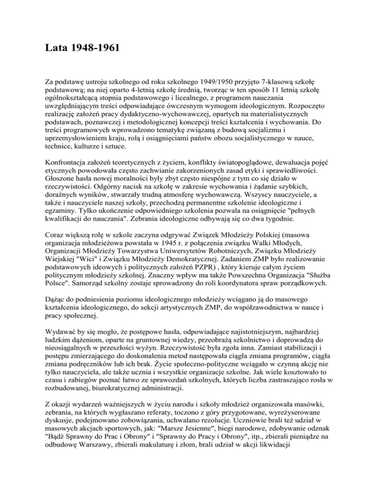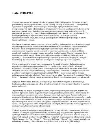 Lata 1948-1961 Za podstawę ustroju szkolnego od roku szkolnego 1949/1950 przyjęto 7-klasową szkołę podstawową; na niej oparto 4-letnią szkołę średnią, tworząc w ten sposób 11 letnią szkołę ogólnokształcącą stopnia podstawowego i licealnego, z programem nauczania uwzględniającym treści odpowiadające ówczesnym wymogom ideologicznym. Rozpoczęto realizację założeń pracy dydaktyczno-wychowawczej, opartych na materialistycznych podstawach, poznawczej i metodologicznej koncepcji treści kształcenia i wychowania. Do treści programowych wprowadzono tematykę związaną z budową socjalizmu i uprzemysłowieniem kraju, rolą i osiągnięciami państw obozu socjalistycznego w nauce, technice, kulturze i sztuce. Konfrontacja założeń teoretycznych z życiem, konflikty światopoglądowe, dewaluacja pojęć etycznych powodowała często zachwianie zakorzenionych zasad etyki i sprawiedliwości. Głoszone hasła nowej moralności były zbyt często niespójne z tym co się działo w rzeczywistości. Odgórny nacisk na szkołę w zakresie wychowania i żądanie szybkich, doraźnych wyników, stwarzały trudną atmosferę wychowawczą. Wszyscy nauczyciele, a także i nauczyciele naszej szkoły, przechodzą permanentne szkolenie ideologiczne i egzaminy. Tylko ukończenie odpowiedniego szkolenia pozwala na osiągnięcie "pełnych kwalifikacji do nauczania". Zebrania ideologiczne odbywają się co dwa tygodnie. Coraz większą rolę w szkole zaczyna odgrywać Związek Młodzieży Polskiej (masowa organizacja młodzieżowa powstała w 1945 r. z połączenia związku Walki Młodych, Organizacji Młodzieży Towarzystwa Uniwersytetów Robotniczych, Związku Młodzieży Wiejskiej "Wici" i Związku Młodzieży Demokratycznej. Zadaniem ZMP było realizowanie podstawowych ideowych i politycznych założeń PZPR) , który kieruje całym życiem politycznym młodzieży szkolnej. Znaczny wpływ ma także Powszechna Organizacja "Służba Polsce". Samorząd szkolny zostaje sprowadzony do roli koordynatora spraw porządkowych. Dążąc do podniesienia poziomu ideologicznego młodzieży wciągano ją do masowego kształcenia ideologicznego, do sekcji artystycznych ZMP, do współzawodnictwa w nauce i pracy społecznej. Wydawać by się mogło, że postępowe hasła, odpowiadające najistotniejszym, najbardziej ludzkim dążeniom, oparte na gruntownej wiedzy, przeobrażą szkolnictwo i doprowadzą do nieosiągalnych w przeszłości wyżyn. Rzeczywistość była zgoła inna. Zamiast stabilizacji i postępu zmierzającego do doskonalenia metod następowała ciągła zmiana programów, ciągła zmiana podręczników lub ich brak. Życie społeczno-polityczne wciągało w czynną akcję nie tylko nauczyciela, ale także ucznia i wszystkie organizacje szkolne. Jak wiele kosztowało to czasu i zabiegów poznać łatwo ze sprawozdań szkolnych, których liczba zastraszająco rosła w rozbudowanej, biurokratycznej administracji. Z okazji wydarzeń ważniejszych w życiu narodu i szkoły młodzież organizowała masówki, zebrania, na których wygłaszano referaty, toczono z góry przygotowane, wyreżyserowane dyskusje, podejmowano zobowiązania, uchwalano rezolucje. Uczniowie brali też udział w masowych akcjach sportowych, jak: "Marsze Jesienne", biegi narodowe, zdobywanie odznak "Bądź Sprawny do Prac i Obrony" i "Sprawny do Pracy i Obrony", itp., zbierali pieniądze na odbudowę Warszawy, zbierali makulaturę i złom, brali udział w akcji likwidacji analfabetyzmu i pracach polowych na wsi. Na przykład w ciągu roku szkolnego 1951/1952 odbyło się 46 różnych uroczystości szkolnych związanych m.in. z odbudową Warszawy, Rewolucją Październikową, Dniem Wojska Polskiego, rocznicą zjednoczenia PZPR, Dniem Kobiet, rocznicą powstania Armii Radzieckiej, rocznicą urodzin Lenina, projektem konstytucji. uwięzieniem komunistów francuskich itp., nie licząc dyskusyjnych wieczorów w ramach pozalekcyjnych, na takie tematy, jak: internacjonaliści XIX i XX w., o pochodzeniu człowieka, nauka a Kościół, powstanie religii i in. Od 1 września 1951 r. szkoła staje się placówką TPD (Towarzystwo Przyjaciół Dzieci utworzone w 1949 r. z Robotniczego Towarzystwa Przyjaciół Dzieci i Chłopskiego Towarzystwa Przyjaciół Dzieci miało na celu organizowanie, prowadzenie i nadzorowanie różnego typu placówek i akcji o charakterze opiekuńczo-wychowawczym typu świeckiego, wychowanie młodzieży w oparciu o założenia ideologiczne PZPR) , tj. szkołą świecką. Ruguje się naukę religii. Oprócz tego, w ciągu każdego roku szkoła organizowała, przygotowywała i urządzała szereg imprez szkolnych, z których programem młodzież często występowała poza szkołą, W zakładach pracy, szpitalach, na wsi, brała udział w konkursach zespołów artystycznych, konkursach recytatorskich itp.. Należy stwierdzić, że młodzież chętnie uczestniczyła w pracach o charakterze artystycznym, wyżywała się recytując wiersze, biorąc udział w inscenizacjach czy w zespołach pieśni i tańca. W okresie, kiedy od szkoły żądano czynnego włączenia się w nurt życia, upolitycznienia, szkoła swą kulturą artystyczną nie tylko pobudzała młodzież do głębokich przeżyć, ale też promieniowała ją na zewnątrz. Zespoły artystyczne szkoły występowały np. dla pracowników Zakładu Ubezpieczeń Społecznych, DOKP, Izby Rzemieślniczej, Centrali Produktów Naftowych, Stoczni. Wszędzie występy spotykały się z serdecznym przyjęciem i uznaniem widzów. Upowszechnienie oświaty, walka z analfabetyzmem, rozbudowa sieci różnorodnych szkół wzmogły zapotrzebowanie na kadry nauczycielskie. W naszej szkole, podobnie jak i w innych szkołach średnich, utworzono klasy pedagogiczne, które oprócz przedmiotów przewidzianych w programie szkół ogólnokształcących przechodziły kurs przygotowania pedagogicznego. Uczniowie z tych klas składali dwie matury i oprócz świadectwa dojrzało