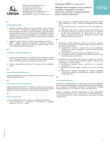 UNIQA Towarzystwo Ubezpieczeń S.A. 90-520 Łódź, ul. Gdańska 132 tel. 42 66 66 500 lub 801 597 597 [email protected], www.uniqa.pl Sąd Rejonowy dla Łodzi - Śródmieścia w Łodzi KRS 0000001201, NIP 727-012-63-58 Kapitał zakładowy i wpłacony : 220 308 282 PLN §1 Postanowienia ogólne 1. Niniejsze Szczególne Warunki, zwane dalej SWU, mają zastosowanie do umów ubezpieczenia następstw nieszczęśliwych wypadków uczestników wczasów, wycieczek, podróży i zorganizowanych imprez okolicznościowych, zawieranych przez UNIQA Towarzystwo Ubezpieczeń S.A., zwane dalej UNIQA TU SA, z osobami fizycznymi, osobami prawnymi i innymi jednostkami organizacyjnymi nieposiadającymi osobowości prawnej. 2. Określenia użyte w niniejszym SWU mają następujące znaczenie: OWU - Ogólne Warunki Ubezpieczenia następstw nieszczęśliwych wypadków, zatwierdzone Uchwałą Zarządu UNIQA TU S.A. Nr 236/2013 z dnia 18 grudnia 2013 r. §2 Przedmiot i wariant ubezpieczenia 1. Przedmiotem ubezpieczenia są następstwa nieszczęśliwych wypadków uczestników wczasów, wycieczek, podróży, zorganizowanych imprez okolicznościowych oraz kuracjuszy w sanatoriach. 2. Umowę ubezpieczenia zawiera się w wariancie pełnym (całodobowym). §3 Zawarcie umowy ubezpieczenia Wypadek & Przezorność Ubezpieczenia następstw nieszczęśliwych wypadów uczestników wczasów, wycieczek, podróży i zorganizowanych imprez okolicznościowych SWU 2. zakres rozszerzony - następstwa nieszczęśliwych wypadków podstawowe określone w § 5 ust. 1 OWU oraz następujące ryzyka dodatkowe: 1) zwrot kosztów leczenia - w wysokości do 10% sumy ubezpieczenia, 2) zadośćuczynienie za ból - w wysokości 10% sumy ubezpieczenia, 3) rezygnacja z pobytu na wczasach, wycieczce itp. - w wysokości do 5% sumy ubezpieczenia, nie więcej jednak niż opłata za pobyt na wczasach, wycieczce itp. wskazana w umowie z organizatorem imprezy turystycznej. §6 1. Świadczenie z tytułu rezygnacji z pobytu na wczasach, wycieczce itp. wskutek nieszczęśliwego wypadku wypłacane jest przy łącznym spełnieniu n/w przesłanek: 1) organizatorem wczasów, wycieczki itp. jest przedsiębiorca zawodowo prowadzący działalność w zakresie świadczenia usług turystycznych, 2) czas trwania wczasów, wycieczki itp. jest dłuższy niż 7 dni, 3) nieszczęśliwy wypadek zdarzył się przed upływem połowy czasu trwania wczasów, wycieczki itp. 2. Świadczenie z tytułu konieczności rezygnacji z pobytu na wczasach, wycieczce itp. wskutek nieszczęśliwego wypadku wypłacane jest na podstawie n/w dokumentów: 1) przedłożenia oryginału umowy uczestnictwa na wczasach, wycieczce itp., 2) przedłożenia dowodu opłaty za pobyt na wczasach, wycieczce itp., 3) dokumentacji lekarskiej niezbędnej do ustalenia przebiegu i okoliczności powstania nieszczęśliwego wypadku (diagnoza, przebieg leczenia). Umowę ubezpieczenia zawiera się indywidualnie albo grupowo w formie imiennej lub bezimiennej. §7 §4 Postanowienia końcowe Czas trwania umowy ubezpieczenia W sprawach nieuregulowanych w niniejszych warunkach szczególnych mają zastosowanie odpowiednie przepisy ogólnych warunków ubezpieczenia następstw nieszczęśliwych warunków, zatwierdzonych Uchwałą Zarządu UNIQA TU S.A. Nr 236/2013 z dnia 18 grudnia 2013 r. Odpowiedzialnością UNIQA TU S.A. objęte są następstwa nieszczęśliwych wypadków, które wydarzyły się w czasie od opuszczenia domu, podczas pobytu na wczasach, wycieczce itp. do czasu powrotu do domu. §5 Zakres ubezpieczenia Niniejsze szczególne warunki ubezpieczenia zostały zatwierdzone Uchwałą Zarządu UNIQA TU S.A. Nr 236/2013 z dnia 18 grudnia 2013 r. i mają zastosowanie do umów ubezpieczenia zawieranych od dnia 1 lutego 2014 r. UNIQA wz. 1274 Umowę ubezpieczenia można zawrzeć w następujących zakresach: 1. zakres podstawowy - następstwa nieszczęśliwych wypadków określone w § 5 ust. 1 OWU 1
