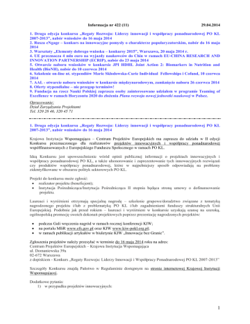 Informacja nr 422 (11) 29.04.2014 1. Druga edycja konkursu „Regaty Rozwoju: Liderzy innowacji i współpracy ponadnarodowej PO KL 2007-2013”, nabór wniosków do 16 maja 2014 2. Rusza eNgage – konkurs na innowacyjne pomysły o charakterze popularyzatorskim, nabór do 16 maja 2014 3. Warsztaty „Elementy dobrego wniosku – konkursy 2015”, Warszawa, 20 maja 2014 r. 4. UE przeznacza 4 mln euro na wyjazdy naukowców do Chin w ramach EU-CHINA RESEARCH AND INNOVATION PARTNERSHIP (ECRIP), nabór do 23 maja 2014 5. Otwarcie naboru wniosków w konkursie JPI HDHL Joint Action 2: Biomarkers in Nutrition and Health (BioNH), nabór do 10 czerwca 2014 6. Szkolenie on-line nt. stypendiów Marie Skłodowska-Curie Individual Fellowships i Cofund, 10 czerwca 2014 7. AAL - otwarcie naboru wniosków w konkursie międzynarodowym, zamknięcie naboru 26 czerwca 2014 8. Oferty stypendialne – nie przegap terminów! 9. Fundacja na rzecz Nauki Polskiej zaprasza osoby zainteresowane udziałem w programie Teaming of Excellence w ramach Horyzontu 2020 do złożenia Planu rozwoju nowej jednostki naukowej w Polsce. Opracowanie: Dział Zarządzania Projektami Tel. 320 28 46, 320 45 71 1. Druga edycja konkursu „Regaty Rozwoju: Liderzy innowacji i współpracy ponadnarodowej PO KL 2007-2013”, nabór wniosków do 16 maja 2014 Krajowa Instytucja Wspomagająca – Centrum Projektów Europejskich ma zaprasza do udziału w II edycji Konkursu przeznaczonego dla realizatorów projektów innowacyjnych i współpracy ponadnarodowej współfinansowanych z Europejskiego Funduszu Społecznego w ramach PO KL. Ideą Konkursu jest upowszechnienie wśród opinii publicznej informacji o projektach innowacyjnych i współpracy ponadnarodowej PO KL, a także uhonorowanie i zaprezentowanie tych innowacyjnych rozwiązań czy produktów współpracy ponadnarodowej, które w najpełniejszy sposób odpowiadają na problemy zidentyfikowane w obszarze polityk sektorowych PO KL. Projekt do konkursu może zgłosić: realizator projektu (beneficjent); Instytucja Pośrednicząca/Instytucja Pośrednicząca II stopnia będąca stroną umowy o dofinansowanie projektu. Laureaci i wyróżnieni otrzymają specjalną nagrodę – szkolenie grupowe/doradztwo związane z tematyką nagrodzonego projektu i/lub z problematyką PO KL i/lub zagadnieniami funduszy strukturalnych Unii Europejskiej. Podobnie jak przed rokiem – laureaci i wyróżnieni w konkursie uzyskają szansę na szeroką, ogólnopolską promocję swoich dokonań projektowych poprzez prezentację nagrodzonych projektów: podczas Gali wręczenia nagród w ramach rocznej konferencji KIW; na portalu MIiR www.efs.gov.pl oraz KIW www.kiw-pokl.org.pl; w ramach publikacji artykułów w biuletynie KIW „Innowacje bez Granic”. Zgłoszenia projektów należy przesyłać w terminie do 16 maja 2014 roku na adres: Centrum Projektów Europejskich – Krajowa Instytucja Wspomagająca ul. Domaniewska 39a 02-672 Warszawa z dopiskiem - Konkurs „Regaty Rozwoju: Liderzy Innowacji i Współpracy Ponadnarodowej PO KL 2007-2013” Szczegóły Konkursu znajdą Państwo w Regulaminie dostępnym na stronie internetowej Krajowej Instytucji Wspomagającej. Dodatkowe pytania: 1) w przypadku projektów innowacyjnych: 1 Agnieszka Jarmuszyńska, tel.: 22 378 31 66, e-mail: [email protected] Anna Elżbieta Strzała, tel.: 22 378 31 69, e-mail: [email protected] 2) w przypadku projektów współpracy ponadnarodowej: Beata Rybicka-Dominiak, tel.: 22 378 31 68, e-mail: [email protected] Magdalena Karczewska, tel.: 22 378 31 63, e-mail: [email protected] 2. Rusza eNgage – konkurs na innowacyjne pomysły o charakterze popularyzatorskim, nabór do 16 maja 2014 Zapraszamy do udziału w pierwszej edycji konkursu eNgage organizowanego w ramach projektu SKILLS Fundacji na rzecz Nauki Polskiej. Głównym celem konkursu eNgage jest rozwój umiejętności z zakresu popularyzacji nauki lub prezentacji wyników badań naukowych dla różnych grup odbiorców niebędących naukowcami, przede wszystkim dla młodzieży i studentów. W konkursie rozpatrywane będą innowacyjne pomysły o charakterze popularyzatorskim, a uczestnicy konkursu nie mają żadnych ograniczeń co do metody popularyzacji. Mogą więc przygotować zarówno cykl wykładów czy spotkań, pisać bloga jak i zaprojektować aplikację na smartfona służącą do popularyzowania wiedzy. Integralną częścią każdego projektu muszą być minimum 4 spotkania z młodzieżą popularyzujące naukę oraz karierę naukową jako wartościową ścieżkę rozwoju. Spotkania te nie muszą być głównym celem projektu, mogą również służyć prezentacji produktów powstałych w wyniku realizacji projektu. Autorzy najlepszych pomysłów otrzymają nagrodę w wysokości do 45 000 zł, którą w przeciągu roku muszą przeznaczyć na realizację swojego projektu. Nagroda składa się z dwóch części: części subwencyjnej (80%) oraz części będącej indywidualnym wsparciem dla laureata (maksymalnie 20% nagrody; z części tej można zrezygnować, by przeznaczyć 100% nagrody na realizację projektu). W konkursie mogą wziąć udział uczestnicy projektu SKILLS reprezentujący wszystkie dziedziny nauki: pracownicy naukowi, zamieszkali w Polsce i zatrudnieni na umowę o pracę w jednostce naukowej posiadającej siedzibę na terenie RP, doktoranci z polskich jednostek naukowych, zamieszkali w Polsce. Rekrutacja do konkursu eNgage będzie trwała do 16 maja 2014 roku. Więcej informacji: na http://www.fnp.org.pl/oferta/skills-engage/ oraz u koordynatora: dr Sonia Kamińska, email: [email protected]. 3. Warsztaty „Elementy dobrego wniosku – konkursy 2015”, Warszawa, 20 maja 2014 r. Krajowy Punkt Kontaktowy Programów Badawczych UE zaprasza na szkolenie dotyczące dokumentacji i pisania wniosków w Programie Ramowym Horyzont 2020 w nowych konkursach 2015. Zakres tematyczny: - możliwości dla naukowców w Horyzoncie 2020, - dokumentacja konkursowa Participant Po