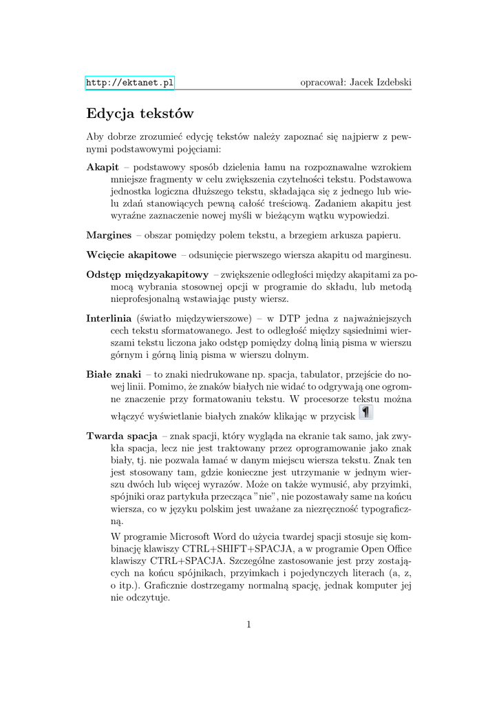 opracował: Jacek Izdebski http://ektanet.pl Edycja tekstów Aby dobrze zrozumieć edycję tekstów należy zapoznać się najpierw z pewnymi podstawowymi pojęciami: Akapit – podstawowy sposób dzielenia łamu na rozpoznawalne wzrokiem mniejsze fragmenty w celu zwiększenia czytelności tekstu. Podstawowa jednostka logiczna dłuższego tekstu, składająca się z jednego lub wielu zdań stanowiących pewną całość treściową. Zadaniem akapitu jest wyraźne zaznaczenie nowej myśli w bieżącym wątku wypowiedzi. Margines – obszar pomiędzy polem tekstu, a brzegiem arkusza papieru. Wcięcie akapitowe – odsunięcie pierwszego wiersza akapitu od marginesu. Odstęp międzyakapitowy – zwiększenie odległości między akapitami za pomocą wybrania stosownej opcji w programie do składu, lub metodą nieprofesjonalną wstawiając pusty wiersz. Interlinia (światło międzywierszowe) – w DTP jedna z najważniejszych cech tekstu sformatowanego. Jest to odległość między sąsiednimi wierszami tekstu liczona jako odstęp pomiędzy dolną linią pisma w wierszu górnym i górną linią pisma w wierszu dolnym. Białe znaki – to znaki niedrukowane np. spacja, tabulator, przejście do nowej linii. Pomimo, że znaków białych nie widać to odgrywają one ogromne znaczenie przy formatowaniu tekstu. W procesorze tekstu można włączyć wyświetlanie białych znaków klikając w przycisk Twarda spacja – znak spacji, który wygląda na ekranie tak samo, jak zwykła spacja, lecz nie jest traktowany przez oprogramowanie jako znak biały, tj. nie pozwala łamać w danym miejscu wiersza tekstu. Znak ten jest stosowany tam, gdzie konieczne jest utrzymanie w jednym wierszu dwóch lub więcej wyrazów. Może on także wymusić, aby przyimki, spójniki oraz partykuła przecząca ”nie”, nie pozostawały same na końcu wiersza, co w języku polskim jest uważane za niezręczność typograficzną. W programie Microsoft Word do użycia twardej spacji stosuje się kombinację klawiszy CTRL+SHIFT+SPACJA, a w programie Open Office klawiszy CTRL+SPACJA. Szczególne zastosowanie jest przy zostających na końcu spójnikach, przyimkach i pojedynczych literach (a, z, o itp.). Graficznie dostrzegamy normalną spację, jednak komputer jej nie odczytuje. 1 opracował: Jacek Izdebski http://ektanet.pl Zasady pracy z procesorem tekstu1 Poniżej przedstawię klika najważniejszych zasad dotyczących poprawnego formatowania tekstów. Zagadnienie omówię na przykładzie edytora OpenOffice.org Writer. • użycie dwóch i więcej znaków spacji obok siebie jest błędem • nie używaj zamiennie znaku nowego akapitu (enter) i znaku przejścia do nowej linii (shift+enter) • ustawienia dotyczące przepływu tekstu, interlinii itp. możesz zmieniać klikając prawym klawiszem na akapit, w którym chcesz dokonać zmian a następnie z menu kontekstowego wybierz Akapit • używanie pustego akapitu w celu zwiększenia odstępu między akapitami jest nieprofesjonalne • jeśli chcesz wstawić wypunktowanie, zmienić sposób wyrównywania tekstu itp. to bardzo łatwo możesz to zrobić używając przycisków z paska narzędzi • jeśli chcesz nadawać tytuły rozdziałów i podrozdziałów to rób to przy pomocy szablonów, do których masz łatwy dostęp na górnym pasku z narzędziami (dzięki temu będzie możliwe automatyczne wstawienie spisu treści) • chcąc rozpocząć następną stronę gdy na poprzedniej jest jeszcze miejsce nie używaj entera ale wybierz z górnego menu Wstaw|Podział ręczny (to samo tyczy wiersza lub kolumny)2 Procesor tekstu pozwala także na formatowanie ogólnego wyglądu strony, wystarczy z górnego menu wybrać Format|Strona. . . 1 Procesor tekstu to zaawansowany edytor tekstowy umożliwiający oprócz edycji czystej zawartości tekstowej, także formatowanie tekstu, czyli nadanie mu odpowiedniej szaty typograficznej (np. stosowanie krojów pisma, ustalanie łamów, regulacja świateł itd.), stosowanie różnych kolorów, łączenie tekstu z grafiką, a jednocześnie określenie formatu papieru, na którym dany dokument ma być wydrukowany. 2 Ogólnie mówiąc jeśli zachodzi potrzeba wstawienia do tekstu jakiegoś niestandardowego elementu to należy skorzystać z menu Wstaw. 2