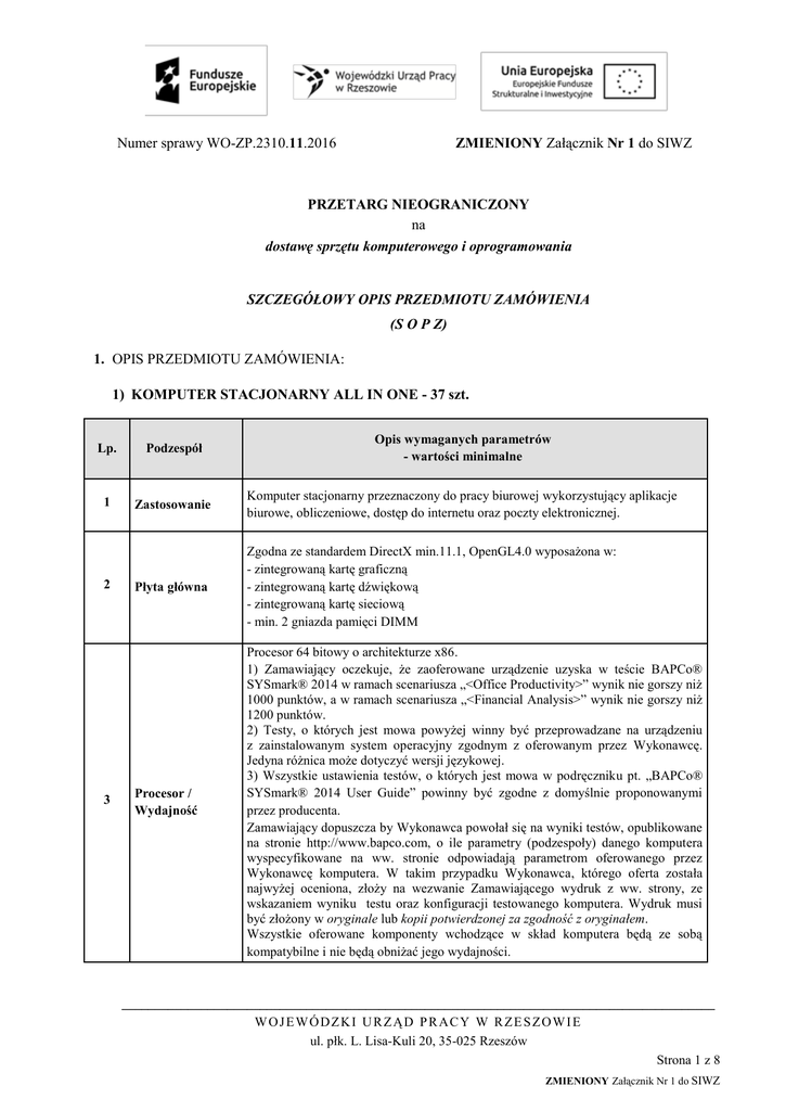 ZMIENIONY Załącznik Nr 1 do SIWZ Numer sprawy WO-ZP.2310.11.2016 PRZETARG NIEOGRANICZONY na dostawę sprzętu komputerowego i oprogramowania SZCZEGÓŁOWY OPIS PRZEDMIOTU ZAMÓWIENIA (S O P Z) 1. OPIS PRZEDMIOTU ZAMÓWIENIA: 1) KOMPUTER STACJONARNY ALL IN ONE - 37 szt. Lp. Podzespół Opis wymaganych parametrów - wartości minimalne 1 Zastosowanie Komputer stacjonarny przeznaczony do pracy biurowej wykorzystujący aplikacje biurowe, obliczeniowe, dostęp do internetu oraz poczty elektronicznej. Płyta główna Zgodna ze standardem DirectX min.11.1, OpenGL4.0 wyposażona w: - zintegrowaną kartę graficzną - zintegrowaną kartę dźwiękową - zintegrowaną kartę sieciową - min. 2 gniazda pamięci DIMM Procesor / Wydajność Procesor 64 bitowy o architekturze x86. 1) Zamawiający oczekuje, że zaoferowane urządzenie uzyska w teście BAPCo® SYSmark® 2014 w ramach scenariusza „<Office Productivity>” wynik nie gorszy niż 1000 punktów, a w ramach scenariusza „<Financial Analysis>” wynik nie gorszy niż 1200 punktów. 2) Testy, o których jest mowa powyżej winny być przeprowadzane na urządzeniu z zainstalowanym system operacyjny zgodnym z oferowanym przez Wykonawcę. Jedyna różnica może dotyczyć wersji językowej. 3) Wszystkie ustawienia testów, o których jest mowa w podręczniku pt. „BAPCo® SYSmark® 2014 User Guide” powinny być zgodne z domyślnie proponowanymi przez producenta. Zamawiający dopuszcza by Wykonawca powołał się na wyniki testów, opublikowane na stronie http://www.bapco.com, o ile parametry (podzespoły) danego komputera wyspecyfikowane na ww. stronie odpowiadają parametrom oferowanego przez Wykonawcę komputera. W takim przypadku Wykonawca, którego oferta została najwyżej oceniona, złoży na wezwanie Zamawiającego wydruk z ww. strony, ze wskazaniem wyniku testu oraz konfiguracji testowanego komputera. Wydruk musi być złożony w oryginale lub kopii potwierdzonej za zgodność z oryginałem. Wszystkie oferowane komponenty wchodzące w skład komputera będą ze sobą kompatybilne i nie będą obniżać jego wydajności. 2 3 __________________________________________________________________________________________ W O J E W Ó D Z K I U R Z Ą D P R AC Y W R ZE S ZO W I E ul. płk. L. Lisa-Kuli 20, 35-025 Rzeszów Strona 1 z 8 ZMIENIONY Załącznik Nr 1 do SIWZ 4 Obudowa Obudowa typu All in One – zintegrowany komputer w obudowie wraz z monitorem z matrycą TN o parametrach min.: - przekątna: 19,5 cala; - rozdzielczość min.: 1600 x 900 HD+ (16:9); - wbudowane głośniki; - kolor: srebrny, czarny; 5 Pamięć - 4 GB; - możliwość rozbudowy do 8 GB 6 Karta graficzna - zintegrowana, zgodna ze standardem DirectX min. 11.1, OpenGL 4.0, - wykorzystująca pamięć systemową 7 Karta sieciowa - zintegrowana karta sieciowa, 10/100/1000 Gigabit Ethernet, RJ-45 8 Karta dźwiękowa - zintegrowana, 9 HDD 500 GB, SATA 10 Napęd optyczny DVD+/-RW Super Multi wraz z oprogramowaniem do nagrywania Certyfikaty i standardy - Certyfikat ISO9001 dla producenta sprzętu lub równoważny - Oferowane urządzenia muszą posiadać certyfikat Microsoft lub równoważny, potwierdzający poprawną współpracę oferowanych komputerów z zaoferowanym systemem operacyjnym - Oferowane urządzenia muszą posiadać certyfikat ENERGY STAR Porty - 4 x USB 2.0/3.0 - 1 x RJ45 - porty audio (słuchawki, mikrofon) 13 Głośność W czasie pracy do 37dB, pomiar zgodny z normą ISO 7779 i ISO 9296 lub równoważny 14 Klawiatura USB 15 Mysz optyczna, USB z rolką 16 Właściwości BIOS-u - możliwość włączania / wyłączania rozruchu systemu z nośników wymiennych - możliwość włączenia / wyłączenia portów USB, LAN, kontrolera audio Bezpieczeństwo -możliwość tworzenia kopii zapasowych lokalnie na dedykowanej partycji dysku twardego i odzyskiwanie zarówno pojedynczych plików jak również całej zawartości partycji; - możliwość blokowania zapisu na nośnikach przyłączanych do portów USB 11 12 17 __________________________________________________________________________________________ W O J E W Ó D Z K I U R Z Ą D P R AC Y W R ZE S ZO W I E ul. płk. L. Lisa-Kuli 20, 35-025 Rzeszów Strona 2 z 8 ZMIENIONY Załącznik Nr 1 do SIWZ 18 19 - oprogramowanie do ochrony, diagnostyki, odzyskania systemu i backup -u, - oprogramowanie umożliwiające monitorowanie stanu pracy jednostki, aktualizację i zmianę ustawień BIOS-u, - oprogramowanie należy dołączyć na nośniku CD lub dedykowanej partycji dysku twardego dla każdego komputera, Oprogramowanie - możliwość aktualizacji i pobrania sterowników do oferowanego modelu komputera w najnowszych certyfikowanych wersjach przy użyciu dedykowanego darmowego / zarządzanie oprogramowania lub bezpośrednio z sieci Internet za pośrednictwem strony www Wykonawcy lub producenta komputera po podaniu numeru seryjnego komputera lub modelu komputera - możliwość weryfikacji czasu obowiązywania i poziomu gwarancji bezpośrednio z sieci Internet za pośrednictwem strony www Wykonawcy lub producenta komputera Preinstalowany system operacyjny musi spełniać następujące wymagania, poprzez wbudowane mechanizmy, bez użycia dodatkowych aplikacji: 1. licencja bezterminowa 2. polska wersja językowa 3. pełna współpraca z Active Directory Windows Serwer 2012 posiadanym przez Zamawiającego , 4. obsługa procesorów wielordzeniowych, 5. graficzny okienkowy interfejs użytkownika, 6. obsługa co najmniej 4 GB RAM, 7. pełna obsługa sprzętu będącego przedmiotem zamówienia w tym kompatybilność sterowników np. sterowników do urządzeń peryferyjnych, 8. zapewnia prawidłowe funkcjonowanie posiadanego i wykorzystywanego przez Zamawiającego system elektronicznego obiegu dokumentów „el-dok” autorstwa firmy ZETO Lublin. 9. dostęp do aktualizacji w ramach zaoferowanej wersji systemu operacyjnego przez Internet bez dodatkowych opłat 10. wbudowana zapora internetowa (firewall) dla ochrony połączeń inter