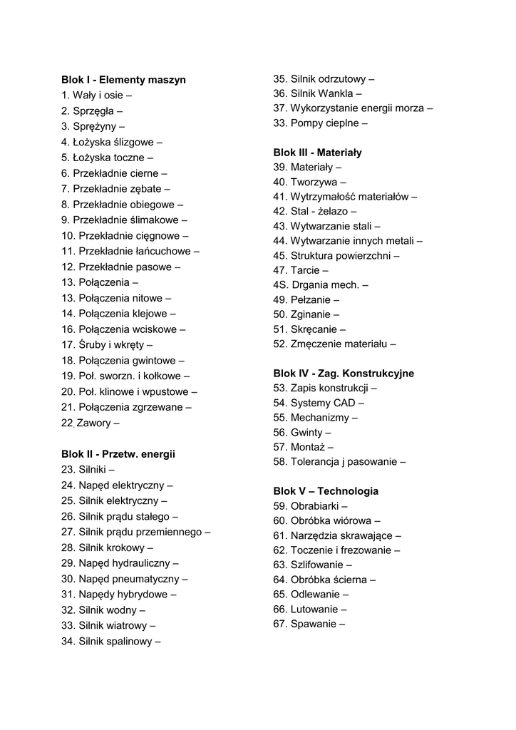 Blok I - Elementy maszyn 1. Wały i osie – 2. Sprzęgła – 3. Sprężyny – 4. Łożyska ślizgowe – 5. Łożyska toczne – 6. Przekładnie cierne – 7. Przekładnie zębate – 8. Przekładnie obiegowe – 9. Przekładnie ślimakowe – 10. Przekładnie cięgnowe – 11. Przekładnie łańcuchowe – 12. Przekładnie pasowe – 13. Połączenia – 13. Połączenia nitowe – 14. Połączenia klejowe – 16. Połączenia wciskowe – 17. Śruby i wkręty – 18. Połączenia gwintowe – 19. Poł. sworzn. i kołkowe – 20. Poł. klinowe i wpustowe – 21. Połączenia zgrzewane – 22. Zawory – Blok II - Przetw. energii 23. Silniki – 24. Napęd elektryczny – 25. Silnik elektryczny – 26. Silnik prądu stałego – 27. Silnik prądu przemiennego – 28. Silnik krokowy – 29. Napęd hydrauliczny – 30. Napęd pneumatyczny – 31. Napędy hybrydowe – 32. Silnik wodny – 33. Silnik wiatrowy – 34. Silnik spalinowy – 35. Silnik odrzutowy – 36. Silnik Wankla – 37. Wykorzystanie energii morza – 33. Pompy cieplne – Blok III - Materiały 39. Materiały – 40. Tworzywa – 41. Wytrzymałość materiałów – 42. Stal - żelazo – 43. Wytwarzanie stali – 44. Wytwarzanie innych metali – 45. Struktura powierzchni – 47. Tarcie – 4S. Drgania mech. – 49. Pełzanie – 50. Zginanie – 51. Skręcanie – 52. Zmęczenie materiału – Blok IV - Zag. Konstrukcyjne 53. Zapis konstrukcji – 54. Systemy CAD – 55. Mechanizmy – 56. Gwinty – 57. Montaż – 58. Tolerancja j pasowanie – Blok V – Technologia 59. Obrabiarki – 60. Obróbka wiórowa – 61. Narzędzia skrawające – 62. Toczenie i frezowanie – 63. Szlifowanie – 64. Obróbka ścierna – 65. Odlewanie – 66. Lutowanie – 67. Spawanie – 68. Przeróbka plastyczna na zimno – 69. Przeróbka plastyczna na gorąco – 70. Kucie – 71. Walcowanie – 72. Tłoczenie – 73. Ciągnienie – 74. Przeciąganie – 75. Prasowanie – 76. Dogniatanie – 77. Zgrzewanie – 78. Hartowanie – 79. Ulepszanie cieplne – 80. Odpuszczanie – 91. Obróbka cieplno-chemiczna – 82. Obróbka elektroerozyjna – 83. Powlekanie powłok – S4. Obróbka tworzyw sztucznych – 85. Uchwyty obróbkowe – 66. Pomiary warsztatowe – 87. Obróbka drewna – 89. Elastyczne systemy produkcyjne Blok VI - Automatyka 89. Mechanizacja – 90. Automatyzacja – 91. Roboty przemysłowe – 92. Sygnał cyfrowy - dyskretny – 93. Sygnał analogowy – 94. Sprzężenie zwrotne – 95. Sterowniki – 96. Charakterystyki statyczne i dynamiczne – 97. Serwomechanizmy – 98. Elementy logiczne – 99. Regulatory – 100. Czujniki - przetworniki – 101. Przetworniki inteligentne – 102. Światłowody – Blok VII - Urządzenia 103. Sprężarki – 104. Wentylatory – 105. Pompy – 106. Dźwignice i przenośniki – 107. Układy hamulcowe – 108. Turbiny parowe i gazowe – 109. Kotły parowe – 110. Maszyny tłokowe – 111. Budowa komputera – 112. Budowa kineskopu – 113. Aparaty fotograficzne cyfrowe – 114. Telefonia komórkowa – 115. Ogniwo słoneczne – 116. Akumulatory – 117 Wytwarzanie azotu – 118. Osuszanie powietrza – Blok VIII - Technika 119. Niezawodność urządzeń – 120. Sprawność – 121. Korozja metali – 122. Wirusy komputerowe – 123. Zapis danych (np. ptyty CD) – 124. Zasada lotu samolotu – 125. Zasada lotu balonu – 126. Wyposażenie samolot – 127. Elektrownie jądrowe – 128. Laser – 129. Chaos – 130. Systemy ekspertowe – 131. Organizacja produkcji – 132. Elastooptyka – 133 Defektoskopia – 134 Logistyka – Blok IX - Nauka 135 Interferometry – 136 Kosmologia – 137 Szczególna teoria względności – 138 Ogólna teoria względności – 139 Doświadczenie MichalsonaMorleya – 140 Pomiar obwodu Ziemi Eratostenesa – 141 Eksperymenty Galileusza spadek swobodny ciał równia pochyła– 142 Eksperyment Newtona rozszczepienie światła – 143 Eksperyment Cavendisha wyznaczenie stałej grawitacji G – 144 Doświadczenie Younga interferencja światła na dwu szczelinach – 145 Wahadło Foucaulta – 146 Doświadczenie Millikana – 147 Eksperyment Rutherforda – 148 Doświadczenie Davissona i Germera– 149 Eksperyment Rutherforda – 150 Doświadczenie Joffego – 151 Eksperyment Fizeau –