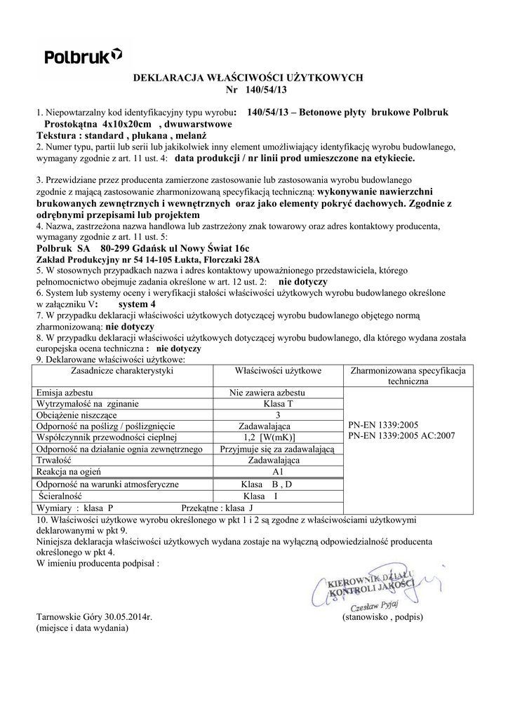 DEKLARACJA WŁAŚCIWOŚCI UŻYTKOWYCH Nr 140/54/13 1. Niepowtarzalny kod identyfikacyjny typu wyrobu: 140/54/13 – Betonowe płyty brukowe Polbruk Prostokątna 4x10x20cm , dwuwarstwowe Tekstura : standard , płukana , melanż 2. Numer typu, partii lub serii lub jakikolwiek inny element umożliwiający identyfikację wyrobu budowlanego, wymagany zgodnie z art. 11 ust. 4: data produkcji / nr linii prod umieszczone na etykiecie. 3. Przewidziane przez producenta zamierzone zastosowanie lub zastosowania wyrobu budowlanego zgodnie z mającą zastosowanie zharmonizowaną specyfikacją techniczną: wykonywanie nawierzchni brukowanych zewnętrznych i wewnętrznych oraz jako elementy pokryć dachowych. Zgodnie z odrębnymi przepisami lub projektem 4. Nazwa, zastrzeżona nazwa handlowa lub zastrzeżony znak towarowy oraz adres kontaktowy producenta, wymagany zgodnie z art. 11 ust. 5: Polbruk SA 80-299 Gdańsk ul Nowy Świat 16c Zakład Produkcyjny nr 54 14-105 Łukta, Florczaki 28A 5. W stosownych przypadkach nazwa i adres kontaktowy upoważnionego przedstawiciela, którego pełnomocnictwo obejmuje zadania określone w art. 12 ust. 2: nie dotyczy 6. System lub systemy oceny i weryfikacji stałości właściwości użytkowych wyrobu budowlanego określone w załączniku V: system 4 7. W przypadku deklaracji właściwości użytkowych dotyczącej wyrobu budowlanego objętego normą zharmonizowaną: nie dotyczy 8. W przypadku deklaracji właściwości użytkowych dotyczącej wyrobu budowlanego, dla którego wydana została europejska ocena techniczna : nie dotyczy 9. Deklarowane właściwości użytkowe: Zasadnicze charakterystyki Właściwości użytkowe Zharmonizowana specyfikacja techniczna Emisja azbestu Nie zawiera azbestu Wytrzymałość na zginanie Klasa T Obciążenie niszczące 3 PN-EN 1339:2005 Odporność na poślizg / poślizgnięcie Zadawalająca PN-EN 1339:2005 AC:2007 Współczynnik przewodności cieplnej 1,2 [W(mK)] Odporność na działanie ognia zewnętrznego Przyjmuje się za zadawalającą Trwałość Zadawalająca Reakcja na ogień A1 Odporność na warunki atmosferyczne Klasa B , D Ścieralność Klasa I Wymiary : klasa P Przekątne : klasa J 10. Właściwości użytkowe wyrobu określonego w pkt 1 i 2 są zgodne z właściwościami użytkowymi deklarowanymi w pkt 9. Niniejsza deklaracja właściwości użytkowych wydana zostaje na wyłączną odpowiedzialność producenta określonego w pkt 4. W imieniu producenta podpisał : Tarnowskie Góry 30.05.2014r. (miejsce i data wydania) (stanowisko , podpis)
