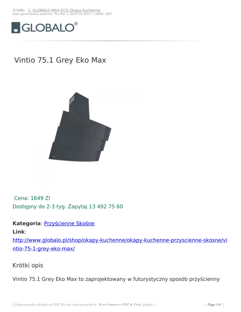 Źródło - 1. GLOBALO MAX ECO Okapy Kuchenne Data generowana wydruku: Thu Mar 2 20:03:10 2017 / +0000 GMT Vintio 75.1 Grey Eko Max Cena: 1649 Zl Dostępny do 2-3 tyg. Zapytaj 13 492 75 60 Kategoria: Przyścienne Skośne Link: http://www.globalo.pl/shop/okapy-kuchenne/okapy-kuchenne-przyscienne-skosne/vi ntio-75-1-grey-eko-max/ Krótki opis Vintio 75.1 Grey Eko Max to zaprojektowany w futurystyczny sposób przyścienny [ Export product details as PDF file has been powered by WooCommerce PDF & Print plugin. ] | Page 1/4 | Źródło - 1. GLOBALO MAX ECO Okapy Kuchenne Data generowana wydruku: Thu Mar 2 20:03:10 2017 / +0000 GMT okap kuchenny o niecodziennej, grafitowej barwie. Ciekawy design łączy się z szerokimi funkcjonalnościami, dzięki czemu urządzenie to chętnie wybierane jest do kuchennych wnętrz. Maksymalna wydajność: 810 m3/h Klasa energetyczna: A Sterowanie dotykowe + pilot Okap kuchenny Vintio 75.1 Grey Eko Max | Zalety i korzyści dla użytkownika Funkcjonalności: Tryb działania: okap przyścienny Vintio 75.1 Grey Eko Max może pracować w jednym z 2 trybów: pochłaniacza bądź wyciągu. Pochłaniacz filtruje powietrze, sprawiając, że jest ono czystsze, a co za tym idzie - zdrowsze. Wyciąg (tryb możliwy tylko w przypadku podłączenia sprzętu do kanału wentylacyjnego) wyprowadza nieprzyjemne opary poza budynek. Filtry: okap kuchenny Vintio 75.1 Grey Eko Max posiada wbudowany wielowarstwowy i wzmacniany filtr aluminiowy (gromadzi tłuste cząsteczki i zapobiega tworzeniu się lepkiej warstwy na kuchennych sprzętach). Z kolei w trybie pochłaniacza istnieje możliwość dokupienia filtra węglowego (neutralizuje nieprzyjemne dla naszych nosów zapachy). Na uwagę zasługuje też niezwykle subtelne oświetlenie LED. Ta stylowa iluminacja świetlna nie tylko ozdobi pomieszczenie, ale również sprawdzi się podczas wieczornego gotowania. Dotykowe sterowanie jest niezwykle proste, a zarazem przyjemne – delikatny ruch palca wystarczy, by włączyć, zaprogramować bądź wyłączyć urządzenie. Do zestawu dołączony jest również pilot do sterowania zdalnego. Trzystopniowa regulacja prędkości + funkcja boost umożliwiają dostosowanie szybkości pracy urządzenia do natężenia zanieczyszczeń bądź pary wodnej w pomieszczeniu. Okap kuchenny Vintio 75.1 Grey Eko Max posiada również 15-minutowy timer (czyli wyłącznik czasowy). Przeznaczenie: Okap kuchenny skośny Vintio 75.1 Grey Eko Max w stylowej, grafitowej odsłonie nie [ Export product details as PDF file has been powered by WooCommerce PDF & Print plugin. ] | Page 2/4 | Źródło - 1. GLOBALO MAX ECO Okapy Kuchenne Data generowana wydruku: Thu Mar 2 20:03:11 2017 / +0000 GMT tylko udekoruje, ale również rozświetli nowoczesną kuchnię. Materiały: Prezentowany przez nas okap kuchenny Vintio 75.1 Grey Eko Max to połączenie wysokiej klasy stali oraz szkła hartowanego. Dobrze wiedzieć! W utrzymaniu okapu Vintio 75.1 Grey Eko Max w czystości pomoże nam uniwersalny spray Berner Wonderclean. W przypadku zwykłych zabrudzeń (np. kurzu) należy przetrzeć powierzchnię urządzenia delikatnie zwilżoną, miękką ściereczką. [vc_column][vc_button title="Jaki wybrać okap?" custom_color="#58ccef" custom_icon="fa-question" custom_pos="left" href="/wybor-najlepszego-okapu-kuchennego/"][vc_button title="Pomaluj okap" custom_color="#58ccef" custom_icon="fa-magic" custom_pos="left" href="/kolorowe-okapy/"][vc_button title="Stwórz własny okap" custom_color="#58ccef" custom_icon="fa-star" custom_pos="left" href="/stworz-wlasny-okap/"][vc_button title="Punkty sprzedaży" custom_color="#58ccef" custom_icon="fa-globe" custom_pos="left" href="/punkty-sprzedazy/"] Specyfikacja produktu: - Wymiary: 85 x 58 x 51 cm - Waga: 18 kg - Waga okapu: 16 kg - Szerokość: 75 cm - Głębokość: 41 cm - Wysokość: 87,8 - 114,3 cm - Filtr aluminiowy: wielowarstwowy, wzmacniany - Filtr węglowy: okrągły ASC 200 (1 kpl.) opcjonalnie - Kod EAN: 5900652382613 - Sterowanie: sensorowe (dotykowe) z wyświetlaczem LED + pilot - Moc silnika: 275 W - Oświetlenie: diodowe 2 x 1,2 W [ Export product details as PDF file has been powered by WooCommerce PDF & Print plugin. ] | Page 3/4 | Źródło - 1. GLOBALO MAX ECO Okapy Kuchenne Data generowana wydruku: Thu Mar 2 20:03:11 2017 / +0000 GMT - Średnica wylotu: fi 15 cm, redukcja fi 12 cm - Timer: 15 min - Wykonanie: stal lakierowana na szaro, szare hartowane szkło - Zakres prędkości: 3 + boost - Dodatki: pilot - Gwarancja: 2 lata - Tryb pracy: pochłaniacz, wyciąg - Turbina zewnętrzna: okap może pracować z turbiną zewnętrzną - Typ okapu: Przyścienny Skośny - Kolor okapu: szary - Wydajność min.: 335 m3/h - Wydajność max: 605 m3/h - Wydajność boost: 810 m3/h - Głośność min.: 51 dB - Głośność max: 63 dB - Głośność boost: 69 dB - Klasa energetyczna: Klasa A - Wprowadzono: 2015-11-05 - Marka: GLOBALO [ Export product details as PDF file has been powered by WooCommerce PDF & Print plugin. ] | Page 4/4 |