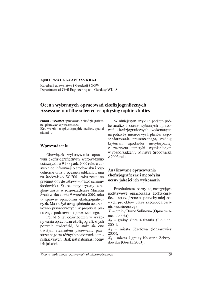 Agata PAWŁAT-ZAWRZYKRAJ Katedra Budownictwa i Geodezji SGGW Department of Civil Engineering and Geodesy WULS Ocena wybranych opracowań ekofizjograficznych Assessment of the selected ecophysiographic studies Słowa kluczowe: opracowanie ekofizjograficzne, planowanie przestrzenne Key words: ecophysiographic studies, spatial planning Wprowadzenie Obowiązek wykonywania opracowań ekofizjograficznych wprowadzono ustawą z dnia 9 listopada 2000 roku o dostępie do informacji o środowisku i jego ochronie oraz o ocenach oddziaływania na środowisko. W 2001 roku został on przeniesiony do ustawy – Prawo ochrony środowiska. Zakres merytoryczny określony został w rozporządzeniu Ministra Środowiska z dnia 9 września 2002 roku w sprawie opracowań ekofizjograficznych. Ma służyć uwzględnieniu uwarunkowań przyrodniczych w projekcie planu zagospodarowania przestrzennego. Ponad 5 lat doświadczeń w wykonywaniu opracowań ekofizjograficznych pozwala stwierdzić, że stały się one trwałym elementem planowania przestrzennego na różnych poziomach administracyjnych. Brak jest natomiast oceny ich jakości. W niniejszym artykule podjęto próbę analizy i oceny wybranych opracowań ekofizjograficznych wykonanych na potrzeby miejscowych planów zagospodarowania przestrzennego, według kryterium zgodności merytorycznej z zakresem tematyki wymienionym w rozporządzeniu Ministra Środowiska z 2002 roku. Analizowane opracowania ekofizjograficzne i metodyka oceny jakości ich wykonania Przedmiotem oceny są następujące podstawowe opracowania ekofizjograficzne sporządzone na potrzeby miejscowych projektów planu zagospodarowania przestrzennego: X1 – gminy Borne Sulinowo (Opracowanie..., 2005a), X2 – gminy Góra Kalwaria (Fic i in. 2004). X3 – miasta Józefowa (Makarewicz 2005), X4 – miasta i gminy Kalwaria Zebrzydowska (Górska 2003), Ocena wybranych opracowań ekofizjograficznych 69 X5 – gminy Kędzierzyn-Koźle (Papin i in. 2006), X6 – gminy Konstancin-Jeziorna (Borzykowski i in. 2004), X7 – miasta Łomży (Serwatka 2005), X8 – gminy Nowa Wieś Wielka (Opracowanie..., 2005b), X9 – miasta Piastów (Zaczkiewicz 2005). Ocenę poprawności wykonania wymienionych opracowań ekofizjograficznych dokonano ogólnie znaną metodą listy kontrolnej skalowej. Proces oceny polegał na: y sporządzeniu listy kontrolnej kryteriów ocen cząstkowych podstawowych etapów zakresu tematycznego opracowania ekofizjograficznego zawartego w rozporządzeniu Ministra Środowiska z dnia 9 września 2002 roku, y grupowym ocenianiu poszczególnych kryteriów ocen cząstkowych w 9 opracowaniach ekofizjograficznych wykonanych w latach 2003–2006 pod względem zgodności zakresu z wymogami ustawodawcy, y podsumowaniu i analizie wyników oceny punktowej. Wynik zbiorczej oceny dla poszczególnych opracowań ekofizjograficznych uzyskano według następującej formuły: V= 1 ∑ an n gdzie: V – punktowa ocena jakości opracowania, an – ocena n-tego kryterium oceny jakości opracowania, n – liczba kryteriów oceny. 70 Wymaganą jakość opracowań ekofizjograficznych oceniono w skali trzypunktowej: 3 – dobra jakość; informacje są pełne i na dobrym poziomie, wystarczające do analizy i oceny zagadnienia, 2 – dostateczna jakość; informacje są niepełne lub częściowo słabej jakości, ale umożliwiają analizę i ocenę danego zagadnienia, a uzupełnienie ich nie wymaga dużego nakładu pracy, 1 – niedostateczna jakość; informacji brak lub są bardzo złej jakości, co uniemożliwia analizę i ocenę danego zagadnienie, a uzupełnienie informacji wymaga znacznego nakładu pracy. Bonitację trzech klas jakości opracowań ekofizjograficznych dla zbiorczych wyników cząstkowych i końcowych przyjęto w następujących przedziałach liczbowych: 3,00–2,33 – dobra jakość, 2,32–1,67 – dostateczna jakość, 1,66–1,00 – niedostateczna jakość. Wyniki badań i podsumowanie Zakres opracowania ekofizjograficznego, zawarty z rozporządzeniu Ministra Środowiska z dnia 9 września 2002 roku, jest obszerny i wieloaspektowy. Określony jest on problemowo. Nie można zrezygnować z wyszczególnionych wymogów tematycznych. Szczegółowość analizy należy dostosować do specyfiki uwarunkowań środowiskowych obszaru objętego opracowaniem. W tabeli 1 przedstawiono listę kontrolną oceny jakości 9 opracowań ekofizjograficznych, wykonanych w latach A. Pawłat-Zawrzykraj 2 1 2 3 2,2 1.2. Funkcjonowanie środowiska Environmental functioning 1.3. Zagospodarowanie i użytkowanie środowiska Environmental management and use 1.4. Źródła antropopresji i ich skutki środowiskowe Sources of anthropopressure and their environmental effects 1.5. Ochrona prawna środowiska Legal protection of environment Ocena etapu 1 (V1) Grading of the stage 2 1 2.1. Odporność środowiska na degradację i zdolność do regeneracji Degradation resistance and regeneration ability of environment 2.2. Stan użytkowania i ochrony zasobów środowiskowych State of use and protection of natural resources 2. Na etapie oceny diagnozy środowiska On the stage of environmental diagnosis evaluation 3 2 1.1. Struktura środowiska Structure of environment 1. Na etapie rozpoznania i charakterystyki środowiska (diagnozy) On the stage of characteristics of environment (diagnosis) 1 X1 1 2 2,8 3 3 2 3 3 3 X2 2 1 2,8 3 2 3 3 3 4 X3 3 1 2,6 3 3 1 3 3 5 X4 2 3 2,8 3 3 2 3 3 6 X5 1 1 2,8 3 2 3 3 3 7 X6 2 3 2,4 3 3 1 2 3 8 X7 2 3 2,4 3 3 1 2 3 9 X8 TABELA 1. Lista kontrolna oceny jakości opracowań ekofizjograficznych w skali trzypunktowej TABLE 1. Check-list for quality assessment of ecophysiographic studies with three-point grading scale Lista kontrolna kryteriów oceny jakości opracowań ekofizjograficznych Ocena kryterium jakości (an) w opracowaniach Criteria of quality assessment of ecophysiographic studies Quality assessment of (an) studies 2,88 2,66 1,77 2,44 3 11 V 2 3 1,89 2,11 2,2 2,55 2 3 2 1 3 10 X9 1 4.1. Wskaz