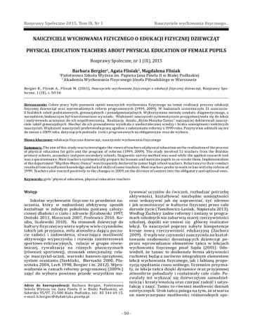 Rozprawy Społeczne 2015, Tom IX, Nr 1 Nauczyciele wychowania fizycznego... NAUCZYCIELE WYCHOWANIA FIZYCZNEGO O EDUKACJI FIZYCZNEJ DZIEWCZĄT PHYSICAL EDUCATION TEACHERS ABOUT PHYSICAL EDUCATION OF FEMALE PUPILS 1 Rozprawy Społeczne, nr 1 (IX), 2015 Barbara Bergier1, Agata Flisiak2, Magdalena Flisiak Państwowa Szkoła Wyższa im. Papieża Jana Pawła II w Białej Podlaskiej 2 Akademia Wychowania Fizycznego Józefa Piłsudskiego w Warszawie Bergier B., Flisiak A., Flisiak M. (2015), Nauczyciele wychowania fizycznego o edukacji fizycznej dziewcząt. Rozprawy Społeczne, 1 (IX), s. 50-56 Streszczenie: Celem pracy było poznanie opinii nauczycieli wychowania fizycznego na temat realizacji procesu edukacji fizycznej dziewcząt oraz wprowadzonych reform programowych (1999, 2009). W badaniach uczestniczyło 51 nauczycieli bialskich szkół podstawowych, gimnazjalnych i ponadgimnazjalnych. Wykorzystano metodę sondażu diagnostycznego, a narzędziem badawczym był kwestionariusz wywiadu. Większość nauczycieli systematycznie przygotowywała się do lekcji i motywowała uczennice do ich współtworzenia. Realizację działu „Rytm-Muzyka-Taniec” najczęściej deklarowali nauczyciele szkół gimnazjalnych. Niechęć do ich prowadzenia wynikała z niedostatecznej wiedzy i braku umiejętności niektórych nauczycieli. Większość nauczycieli preferowała pracę zgodnie z założeniami reformy z 1999 roku. Pozytywnie odnieśli się też do zmian z 2009 roku, dotyczących podziału treści programowych na obligatoryjne oraz do wyboru. Słowa kluczowe: edukacja fizyczna dziewcząt, nauczyciele wychowania fizycznego Summary: The aim of this study was to investigate the views of teachers of physical education on the realization of the process of physical education for girls and the program of reforms (1999, 2009). The study involved 51 teachers from the Bialskie primary schools, secondary and post-secondary schools. Diagnostic survey method was used while the applied research tool was a questionnaire. Most teachers systematically prepare for lessons and motivate pupils to co-create them. Implementation of the department “Rhythm-Music-Dance” was frequently declared by junior high school teachers. Reluctance to their conduct resulted from insufficient knowledge and lack of skills of some teachers. Most teachers prefer to work in line with the reform of 1999. Teachers also reacted positively to the changes in 2009, on the division of content into the obligatory and optional ones. Keywords: girls’ physical education, physical education teachers Wstęp Szkolne wychowanie fizyczne to przedmiot nauczania, który w najbardziej efektywny sposób kształtuje w młodym pokoleniu postawę całożyciowej dbałości o ciało i zdrowie (Grabowski 1997, Osiński 2011, Maszczak 2007, Frołowicz 2010, Kosiba, Szalewski 2010). Na stosunek dziewcząt do kultury fizycznej wywiera wpływ wiele czynników, takich jak przyjazna, miła atmosfera dająca poczucie radości i zadowolenia, stwarzająca możliwość aktywnego wypoczynku i rozwoju zainteresowań sportowo-rekreacyjnych, relacje w grupie rówieśniczej, rywalizacja na różnych płaszczyznach (również sportowej), stosunek emocjonalny, relacje nauczyciel-uczeń, warunki bazowo-sprzętowe, system oceniania (Szeklicki, Biernacki 2000, Pławińska 2004, Lech 1998, Bergier i in. 2012). Wprowadzenie w ramach reformy programowej (2009r.) zajęć do wyboru powinno przede wszystkim mo- Adres do korespondencji: Barbara Bergier, Państwowa Szkoła Wyższa im. Jana Pawła II w Białej Podlaskiej, ul. Sidorska 95/97, 21-500 Biała Podlaska, tel.: 83 344 69 15, e-mail: [email protected] tywować uczniów do ćwiczeń, rozbudzać potrzebę aktywności, kształtować niezbędne umiejętności oraz wskazywać jak się usprawniać, żyć zdrowo i jak uczestniczyć w kulturze fizycznej przez całe dorosłe życie (Tumiłowicz-Lesiuk, Napierała 2013). Według Zuchory żadne reformy i zmiany w programach szkolnych nie zabarwią szarej rzeczywistości szkolnej, dopóki nie zmieni się główny realizator lekcji. To nauczyciel poprzez nabyte kompetencje kreuje nową rzeczywistość edukacyjną (Zuchora 2009). O wpływie czynności nauczyciela na kształtowanie osobowości dorastających dziewcząt poprzez wprowadzanie elementów tańca w lekcjach wychowania fizycznego pisał Sajda (2001). Udowodnił, że taniec to doskonała forma aktywności ruchowej będąca zarówno integralnym elementem lekcji wychowania fizycznego, jak i lubianą propozycją spędzania czasu wolnego. Uczennice przyznały, że lekcje tańca dzięki dynamice oraz przyjemnej atmosferze pobudzały i rozluźniały całe ciało. Pozwalały też wykazać się dziewczętom samodzielnością i kreatywnością oraz czerpać radość i satysfakcję z zajęć. Taniec to również możliwość doznań estetycznych. Urok tańca polega na tym, że stwarza on niewyczerpane możliwości różnorodnych spo- - 50 - Rozprawy Społeczne 2015, Tom IX, Nr 1 Nauczyciele wychowania fizycznego... sobów poruszania się, które mogą zaspokoić oczekiwania wszystkich (Siwka i in. 2013). To również doskonała rozrywka wprowadzająca dobry nastrój, pozwalająca odreagować stresy i zapomnieć o problemach. To sposób wyrażania uczuć i emocji dający poczucie swobody i wolności, podwyższający samoocenę i uzewnętrzniający duszę człowieka (Bergier, Kapusta 2010). Celem prezentowanej pracy było poznanie opinii nauczycieli wychowania fizycznego pracujących z dziewczętami bialskich szkół podstawowych, gimnazjalnych i ponadgimnazjalnych na temat realizowanego przez nich procesu edukacji fizycznej dziewcząt. Zwrócono też uwagę na stosunek nauczycieli do wprowadzonych reform programowych (1999,2009) i ich realizacji. Problemy szczegółowe dotyczyły: 1.Realizacji procesu edukacji fizycznej dziewcząt w tym: stosunku do wykonywanego zawodu, przygotowania lekcji, stylów prowadzenia zajęć, zachęcania uczniów do wspó
