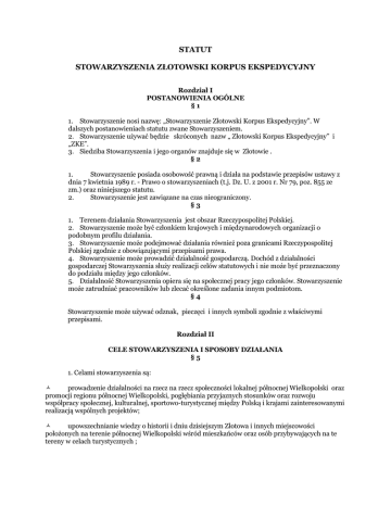 STATUT STOWARZYSZENIA ZŁOTOWSKI KORPUS EKSPEDYCYJNY Rozdział I POSTANOWIENIA OGÓLNE §1 1. Stowarzyszenie nosi nazwę: „Stowarzyszenie Złotowski Korpus Ekspedycyjny”. W dalszych postanowieniach statutu zwane Stowarzyszeniem. 2. Stowarzyszenie używać będzie skróconych nazw „ Złotowski Korpus Ekspedycyjny” i „ZKE”. 3. Siedziba Stowarzyszenia i jego organów znajduje się w Złotowie . §2 1. Stowarzyszenie posiada osobowość prawną i działa na podstawie przepisów ustawy z dnia 7 kwietnia 1989 r. - Prawo o stowarzyszeniach (t.j. Dz. U. z 2001 r. Nr 79, poz. 855 ze zm.) oraz niniejszego statutu. 2. Stowarzyszenie jest zawiązane na czas nieograniczony. §3 1. Terenem działania Stowarzyszenia jest obszar Rzeczypospolitej Polskiej. 2. Stowarzyszenie może być członkiem krajowych i międzynarodowych organizacji o podobnym profilu działania. 3. Stowarzyszenie może podejmować działania również poza granicami Rzeczypospolitej Polskiej zgodnie z obowiązującymi przepisami prawa. 4. Stowarzyszenie może prowadzić działalność gospodarczą. Dochód z działalności gospodarczej Stowarzyszenia służy realizacji celów statutowych i nie może być przeznaczony do podziału między jego członków. 5. Działalność Stowarzyszenia opiera się na społecznej pracy jego członków. Stowarzyszenie może zatrudniać pracowników lub zlecać określone zadania innym podmiotom. §4 Stowarzyszenie może używać odznak, pieczęci i innych symboli zgodnie z właściwymi przepisami. Rozdział II CELE STOWARZYSZENIA I SPOSOBY DZIAŁANIA §5 1. Celami stowarzyszenia są: prowadzenie działalności na rzecz na rzecz społeczności lokalnej północnej Wielkopolski oraz promocji regionu północnej Wielkopolski, pogłębiania przyjaznych stosunków oraz rozwoju współpracy społecznej, kulturalnej, sportowo-turystycznej między Polską i krajami zainteresowanymi realizacją wspólnych projektów; upowszechnianie wiedzy o historii i dniu dzisiejszym Złotowa i innych miejscowości położonych na terenie północnej Wielkopolski wśród mieszkańców oraz osób przybywających na te tereny w celach turystycznych ; wzmacnianie więzi społecznych między mieszkańcami i rozbudzanie wśród nich zainteresowania życiem i rozwojem północnej Wielkopolski ; prowadzenie działań na rzecz wspomagania rozwoju lokalnego, rozbudowy infrastruktury turystycznej; rozwijanie współpracy z organizacjami społecznymi i towarzystwami o podobnym charakterze na terytorium Rzeczypospolitej Polski i poza nią ; działalność na rzecz integracji europejskiej oraz rozwijania kontaktów i współpracy społeczności lokalnej północnej Wielkopolski ze społecznościami lokalnymi innych państw Unii Europejskiej ; organizowanie wypoczynku dzieci i młodzieży, w tym także krajoznawstwo ze szczególnym uwzględnieniem obszaru północnej Wielkopolski ; pielęgnowanie tradycji ludowych i kulturalnych związanych z terenem działania Stowarzyszenia; propagowanie i promocję otwartości na obce kultury i ich tradycje; promocję różnych form amatorskiej aktywności sportowej ; promocję zdrowia w tym propagowanie zdrowego trybu życia ; działania mające na celu ochronę środowiska naturalnego, w tym edukacja ekologiczna, współpraca z młodymi ekologami promocję i organizację wolontariatu. §6 Stowarzyszenie swe cele realizuje poprzez: organizowanie wycieczek i wypoczynku; współpracę z mediami lokalnymi w tym opracowanie informacji dla prasy o realizowanych przez Stowarzyszenie projektach i akcjach, dla gminy i starostwa ; prowadzenie portalu internetowego ; promocję zachowań prospołecznych ; organizowanie wykładów, warsztatów, wystaw, zebrań dyskusyjnych, odczytów, konferencji, seminariów, pokazów, koncertów ; organizowanie kursów, szkoleń , konkursów i festiwali ; organizowanie działań o charakterze wolontariatu w północnej Wielkopolsce, w tym budowanie baz danych dotyczących wolontariatu w północnej Wielkopolsce ; organizowanie imprez sportowych, edukacyjnych, krajoznawczych ; prowadzenie działalności wydawniczej ; współpracę z osobami i instytucjami, których cele są zbieżne z celami Stowarzyszenia, lub które chcą wspierać realizację celów statutowych Stowarzyszenia; występowanie z wnioskami i opiniami do właściwych organów administracji; publiczne zabieranie głosu w sprawach objętych celami Stowarzyszenia ; inne działania realizujące cele statutowe. organizacja jednej wyprawy w roku dla najbardziej aktywnych członków Stowarzyszenia Rozdział III CZŁONKOWIE STOWARZYSZENIA §7 1. a) b) c) Członkowie Stowarzyszenia dzielą się na: członków zwyczajnych, członków wspierających, członków honorowych. §8 1. Członkami zwyczajnymi mogą być osoby fizyczne posiadające pełną zdolność do czynności prawnych i niepozbawione praw publicznych. 2. Cudzoziemcy, bez względu na miejsce zamieszkania, mogą być członkami Stowarzyszenia zgodnie z przepisami obowiązującymi obywateli polskich. 3. Osoby prawne mogą być członkami wspierającymi Stowarzyszenia. §9 1. Kandydat do Stowarzyszenia składa pisemną deklarację zawierającą oświadczenie o przystąpieniu i zobowiązanie do opłacania składek, a ponadto: a) osoby fizyczne: imię (imiona) i nazwisko, datę i miejsce urodzenia, adres, numer PESEL, b) osoby prawne: nazwę (firmę), siedzibę, adres, numer Regon, dołączając także odpis z właściwego rejestru, jeżeli podlegają wpisowi do rejestru. 2. O przyjęciu w poczet członków Stowarzyszenia decyduje Zarząd w formie uchwały. O swojej decyzji Zarząd niezwłocznie powiadamia pisemnie zainteresowanego. 3. Od decyzji odmownej zainteresowanemu przysługuje prawo odwołania do Walnego Zebrania Członków, którego uchwała w tym przedmiocie jest ostateczna. Odwołanie należy wnieść w terminie 1 miesiąca od otrzymania pisemnej informacji o decyzji Zarządu. § 10 1. Członek zwyczajny Stowarzyszenia ma w szczególności pra