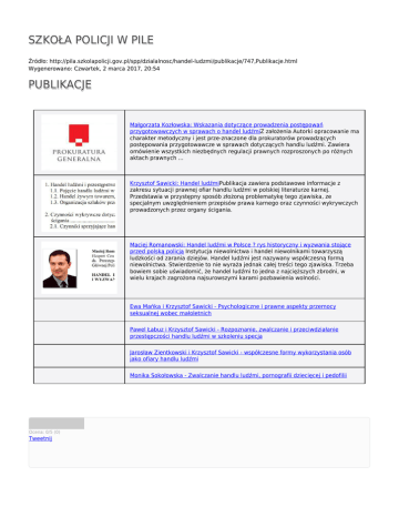SZKOŁA POLICJI W PILE Źródło: http://pila.szkolapolicji.gov.pl/spp/dzialalnosc/handel-ludzmi/publikacje/747,Publikacje.html Wygenerowano: Czwartek, 2 marca 2017, 20:54 PUBLIKACJE Małgorzata Kozłowska: Wskazania dotyczące prowadzenia postępowań przygotowawczych w sprawach o handel ludźmiZ założenia Autorki opracowanie ma charakter metodyczny i jest prze-znaczone dla prokuratorów prowadzących postępowania przygotowawcze w sprawach dotyczących handlu ludźmi. Zawiera omówienie wszystkich niezbędnych regulacji prawnych rozproszonych po różnych aktach prawnych ... Krzysztof Sawicki: Handel ludźmiPublikacja zawiera podstawowe informacje z zakresu sytuacji prawnej ofiar handlu ludźmi w polskiej literaturze karnej. Przedstawia w przystępny sposób złożoną problematykę tego zjawiska, ze specjalnym uwzględnieniem przepisów prawa karnego oraz czynności wykrywczych prowadzonych przez organy ścigania. Maciej Romanowski: Handel ludźmi w Polsce ? rys historyczny i wyzwania stojące przed polską policją Instytucja niewolnictwa i handel niewolnikami towarzyszą ludzkości od zarania dziejów. Handel ludźmi jest nazywany współczesną formą niewolnictwa. Stwierdzenie to nie wyraża jednak całej treści tego zjawiska. Trzeba bowiem sobie uświadomić, że handel ludźmi to jedna z najcięższych zbrodni, w wielu krajach zagrożona najsurowszymi karami pozbawienia wolności. Ewa Mańka i Krzysztof Sawicki - Psychologiczne i prawne aspekty przemocy seksualnej wobec małoletnich Pawel Łabuz i Krzysztof Sawicki - Rozpoznanie, zwalczanie i przeciwdziałanie przestępczości handlu ludźmi w szkoleniu specja Jarosław Zientkowski i Krzysztof Sawicki - współczesne formy wykorzystania osób jako ofiary handlu ludźmi Monika Sokołowska - Zwalczanie handlu ludźmi, pornografii dziecięcej i pedofilii Ocena: 0/5 (0) Tweetnij