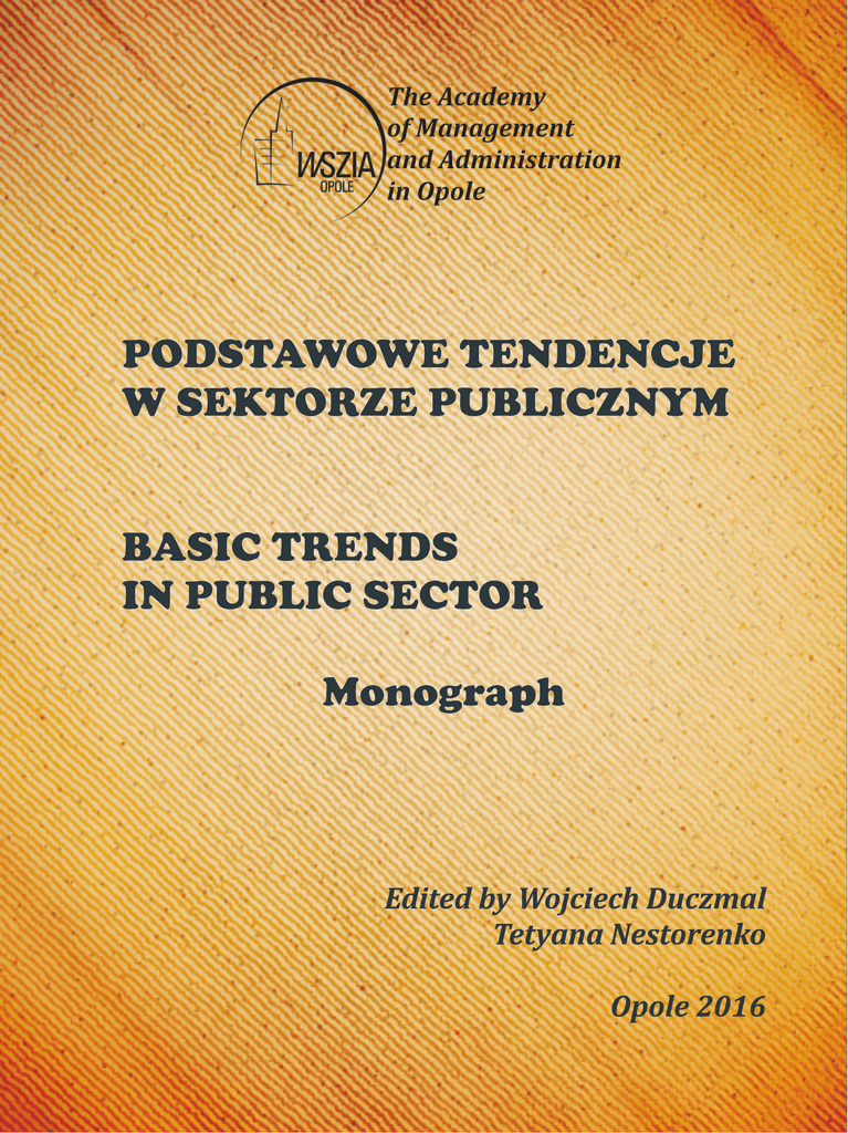 THE ACADEMY OF MANAGEMENT AND ADMINISTRATION IN OPOLE PODSTAWOWE TENDENCJE W SEKTORZE PUBLICZNYM BASIC TRENDS IN PUBLIC SECTOR Monograph Edited by Wojciech Duczmal Tetyana Nestorenko Opole 2016 ISBN 978-83-62683-79-6 Basic Trends in Public Sector. Monograph. Opole: The Academy of Management and Administration in Opole, 2016; ISBN 978-83-62683-79-6 (Paper); pp.200, illus., tabs., bibls. Editorial Office: Wyższa Szkoła Zarządzania i Administracji w Opolu 45-085 Polska, Opole, ul. Niedziałkowskiego 18 tel. 77 402-19-00/01 E-mail: [email protected] Reviewers dr hab. Marian Ciepaj dr hab. Igor Lyman dr Sławomir Śliwa Editorial Board Marian Duczmal (chairman), Ryszard Broszkiewicz, Wojciech Duczmal, Vladimir Gonda, Tetyana Nestorenko, Oleksandr Nestorenko, Iryna Ostopolets, Tadeusz Pokusa Publishing House: Wyższa Szkoła Zarządzania i Administracji w Opolu 45-085 Polska, Opole, ul. Niedziałkowskiego 18 tel. 77 402-19-00/01 300 copies Authors are responsible for content of the materials. ISBN 978-83-62683-79-6 © Authors of articles, 2016 © Publishing House WSZiA, 2016 TABLE OF CONTENTS: 5 Introduction Part 1. Social aspects of modern society development 1.1. Demographic trends in Poland and the demand for long-term care 1.2. The noospherization of education as an informational-civilizational process 1.3. Theoretical-methodological approach to defining the role of education as a factor of innovative development of economy 1.4. Features of development емоtional connections of children with adults in the condition of domestic co-operational deprivation 1.5. Cultural creative activity as the factor of harmonization of personality 1.6. Virtual community of practice – the modern trend of professional development of specialists in public sphere 1.7. The diagnosis of the world of high school students – in search of prevention-oriented values 1.8. Designing of managerial consoles 1.9. The modeling of influence on personal and society behavior on economic indicator 1.10. Optimization financial support development of higher education as modern tendencies Part 2. Basic trends in public sectors: education, health care, culture and social protection 2.1. Мethodological approaches to the study of professionalism teacher 2.2. Influence by innovative educational environment to the forming creativity of the future managers in higher educational establishment 2.3. Trends in music education – conservatories in Slovakia 2.4. Involvement of non-governmental educational institutions in the training of physicians in occupational pathology 2.5. Traditional and innovative methods of teaching of the Ukrainian language in the modern pedagogical high educational establishment: рroblems, condition, prospects 2.6. Strategy modernization of computer training of primary school teachers in the light of education reform in Ukraine 2.7. The specialized program equipment as a universal mean of teacher`s learned and pedagogical research activity 2.8. Мethodical basis of forming of ecological values of future primary school teachers during the process of professional training 3 6 6 13 21 27 33 40 48 58 74 80 88 88 98 106 113 121 131 139 147 2.9. Structural components and basic criteria of professional readiness of the teacher to the providing of innovatio 2.10. The impact of sports-oriented physical education of students to improve mental and physical condition of the student youth 2.11. Problems of development lexicographical competence younger students 2.12. Formation of research skills of future teachers of primary school: essence, contents, stages 2.13. Scientific and methodological basis increase of physical students 156 165 173 180 187 Annotation 195 About the authors 199 4 INTRODUCTION Change of political and economic systems in the world, as well as their transformation require changes the public sector, which share in economy, according to Wagner's law, is permanently growing from a historical perspective. In the modern world the development of education, health care and other spheres of the public sector take place in one direction connected with globalization and the transition to an information society. But at the same time there are differences related to national, religious, political, economic, social, environmental and others features in different countries and regions. The results of scientific researches of Polish, Slovak, Ukrainian and Russian scientists are presented in the collective monograph "Basic Trends in Public Sector". These researches are devoted to the analysis, summarizing, updating and implementation of new approaches to the development and transformation of the public sector, taking into account the specifics of authors’ countries. The first section of the collective monograph is devoted to the research in the field of theoretical and methodological approaches to the determination of the role of education as a factor of innovative economic development in the context of the information process of civilization development. The modern trends of professional development on the different stages of education considering the connection between person and modern society, their social, cultural, psychological and demographical components are discussed in the first part of collective monograph. The strategies of modernization process of teachers’ preparation based on innovative information technologies, methods of formation of research abilities and creativity of future professionals are featured in the second section. This section presents the experience of non-governmental educational organizations in increasing of specialists’ qualifications too. It also examines the impact of linguistic, musical, physical and environmental education for the development of the public sector in the country. The monograph is a collective scientific work of the Polish, Slovak, Ukrainian and Russian scientists in the field of research of public sector. Wojciech Duczmal Tetyana Nestorenko 5 Part 1. S