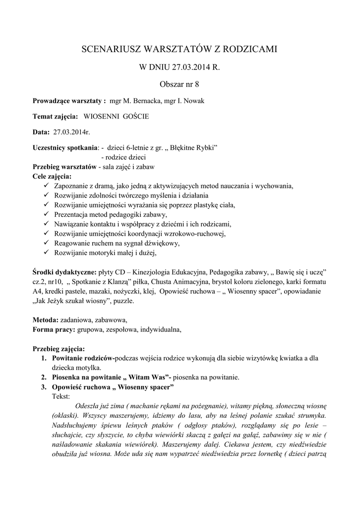 SCENARIUSZ WARSZTATÓW Z RODZICAMI W DNIU 27.03.2014 R. Obszar nr 8 Prowadzące warsztaty : mgr M. Bernacka, mgr I. Nowak Temat zajęcia: WIOSENNI GOŚCIE Data: 27.03.2014r. Uczestnicy spotkania: - dzieci 6-letnie z gr. „ Błękitne Rybki” - rodzice dzieci Przebieg warsztatów - sala zajęć i zabaw Cele zajęcia: Zapoznanie z dramą, jako jedną z aktywizujących metod nauczania i wychowania, Rozwijanie zdolności twórczego myślenia i działania Rozwijanie umiejętności wyrażania się poprzez plastykę ciała, Prezentacja metod pedagogiki zabawy, Nawiązanie kontaktu i współpracy z dziećmi i ich rodzicami, Rozwijanie umiejętności koordynacji wzrokowo-ruchowej, Reagowanie ruchem na sygnał dźwiękowy, Rozwijanie motoryki małej i dużej, Środki dydaktyczne: płyty CD – Kinezjologia Edukacyjna, Pedagogika zabawy, „ Bawię się i uczę” cz.2, nr10, „ Spotkanie z Klanzą” piłka, Chusta Animacyjna, brystol koloru zielonego, karki formatu A4, kredki pastele, mazaki, nożyczki, klej, Opowieść ruchowa – „ Wiosenny spacer”, opowiadanie „Jak Jeżyk szukał wiosny”, puzzle. Metoda: zadaniowa, zabawowa, Forma pracy: grupowa, zespołowa, indywidualna, Przebieg zajęcia: 1. Powitanie rodziców-podczas wejścia rodzice wykonują dla siebie wizytówkę kwiatka a dla dziecka motylka. 2. Piosenka na powitanie „ Witam Was”- piosenka na powitanie. 3. Opowieść ruchowa „ Wiosenny spacer” Tekst: Odeszła już zima ( machanie rękami na pożegnanie), witamy piękną, słoneczną wiosnę (oklaski). Wszyscy maszerujemy, idziemy do lasu, aby na leśnej polanie szukać strumyka. Nadsłuchujemy śpiewu leśnych ptaków ( odgłosy ptaków), rozglądamy się po lesie – słuchajcie, czy słyszycie, to chyba wiewiórki skaczą z gałęzi na gałąź, zabawimy się w nie ( naśladowanie skakania wiewiórek). Maszerujemy dalej. Ciekawa jestem, czy niedźwiedzie obudziła już wiosna. Może uda się nam wypatrzeć niedźwiedzia przez lornetkę ( dzieci patrzą przez lornetki). Czy słyszycie, to chyba niedźwiedzie obudziły się z zimowego snu ( marsz z przechylaniem się na boki). Niedźwiedzie powróciły do swoich legowisk, a my idziemy dalej. Dotarliśmy na leśną polanę ( o…jest strumyczek). Podejdźmy pomału i ostrożnie blisko strumyka, do którego przychodzą wszystkie zwierzęta napić się wody. Musimy trochę odpocząć. Siadamy przy strumyku, ale ostrożnie, żeby nie zmoczyć nóg. 4. Zabawa ruchowa „ Z małej chmurki duży deszcz” (CD „ Bawię się..” cz.2.nr 10. „ „Świeci słoneczko”) ( zabawa z chustą animacyjną) Rodzice trzymają chust chmura, która unosi się do góry i na dół. Gdy dzieci usłyszą wysokie dźwięki tzn, że słońce świeci i dzieci- krople deszczu- siedzą na dywanie, mając chustę nad głową. Gdy usłyszą dźwięki niskie tzn, że pada deszcz, dzieci wybiegają i poruszają się po sali. 5. Zabawa ćwicząca współdziałanie z chustą „ Bilard”- Grupa wachluje się chustą, na której jest piłeczka. Ma ona wpaść do otworu znajdującego się na środku chusty. ( zabawę rozpoczynają rodzice, a potem dzieci) 6. Zabawa „Polka cygańska”- Uczestnicy ustawiają się parami w kręgu. Na zmianę tempa i ( CD „Spotkanie z Klanzą” ) muzyki wykonują 3 rodzaje ruchów: – marsz w parach , po obwodzie koła, - skłony w prawo i w lewo, - klaskanie w swoje ręce i w ręce partnera, 7. Sekwencja przy stolikach( w tle słychać muzykę relaksacyjną z KE) Zamalowywanie kartek papieru kredkami świecowymi lub pastelami, wałeczkiem. Kredki w różnych kolorach wiosennych. 8. „Rysujemy dłonie”- Dzieci przykładają dłonie na pokolorowanych kartkach a rodzice odrysowują 4 rączki na jednej kartce. Następnie wspólnie wycinają. 9. „Plakat wiosenny” – dzieci wraz z rodzicami tworzą plakat Wisenny, naklejając wycięte rączki na zielony brystol. Z wyciętych dłoni tworzą kwiaty, bociana, słońce motyle, trawę itp. 10. Zabawa „Orzeszki”( CD „ Pedagogika zabawy” nr 3) Dłonie stykają się palcami i klaszczą dwa razy w swoje dłonie. Na zmianę tempa w muzyce klaszczą w dłonie i wykonują ruchy naprzemienne uaktywniając obie półkule mózgowe, przykładają dłoń raz do lewego ramienia, raz do prawego. 11. Zabawa ruchowa „ Motylki i kwiaty”- ( CD P. Kaja nr 19) Kwiatek z motylkiem łączą się w parę. Przy muzyce dzieci- motylki biegają po sali wokół kwiatków. Na przerwę w muzyce odnajdują się wszystkie pary. Zabawę powtarzamy do końca piosenki. 12. Drama „ Jak jeżyk szukał wiosny” – Uczestnicy ustawiają się w kole. Odliczają do czterech. Potem kolejno będą: 1) jeżami 2) wiosną 3) bocianami 4) wiatr Nauczycielka czyta tekst a uczestnicy wchodząc w rolę improwizują tekst ruchem. 13. 14. 15. 16. Pewnego dnia mały jeżyk obudził się w swojej norce na skraju lasu. Ziewnął, przeciągnął się, przetarł oczy łapką i wyszedł z norki szukać wiosny. – Zimno- mruknął zaspany jeżyk- Gdzie ta wiosna? Rozejrzał się dookoła, ale wiosny nigdzie nie było. Na gałązkach wierzby siedziały małe, puchate wierzbowe kotki. – Co robicie tak wysoko?- spytał jeżyk. Rośniemy!- zawołały wierzbowe kotki.- A wiosny nie widziałyście?spytał jeżyk. Ale właśnie nadleciał wiatr. A wiatr, jak to wiatr zaszumiał w wierzbowych gałązkach i jeżyk nie usłyszał, co mówią wierzbowe kotki. Więc zawołał do wiatru: Wietrzyku! Szalony wietrzyku! Co robisz?!- Przeganiam chmury po niebie- odpowiedział wiatr.- A może ty widziałeś wiosnę?- zapytał jeżyk. – Wiosnę powiadasz? Hm… wiosnę?powiedział zagadkowo wiatr. Ale tylko się uśmiechnął i odpowiedział- Chętnie bym z tobą porozmawiał o wiośnie, ale nie mam czasu. Muszę pędzić dalej! Spytaj lepiej bociana! I wietrzyk zniknął wśród chmur. Jeżyk poszedł więc dalej szukać wiosny. Aż wreszcie doszedł na łąkę, a Tam… na długich nogach stał pan bocian. Jeżyk z