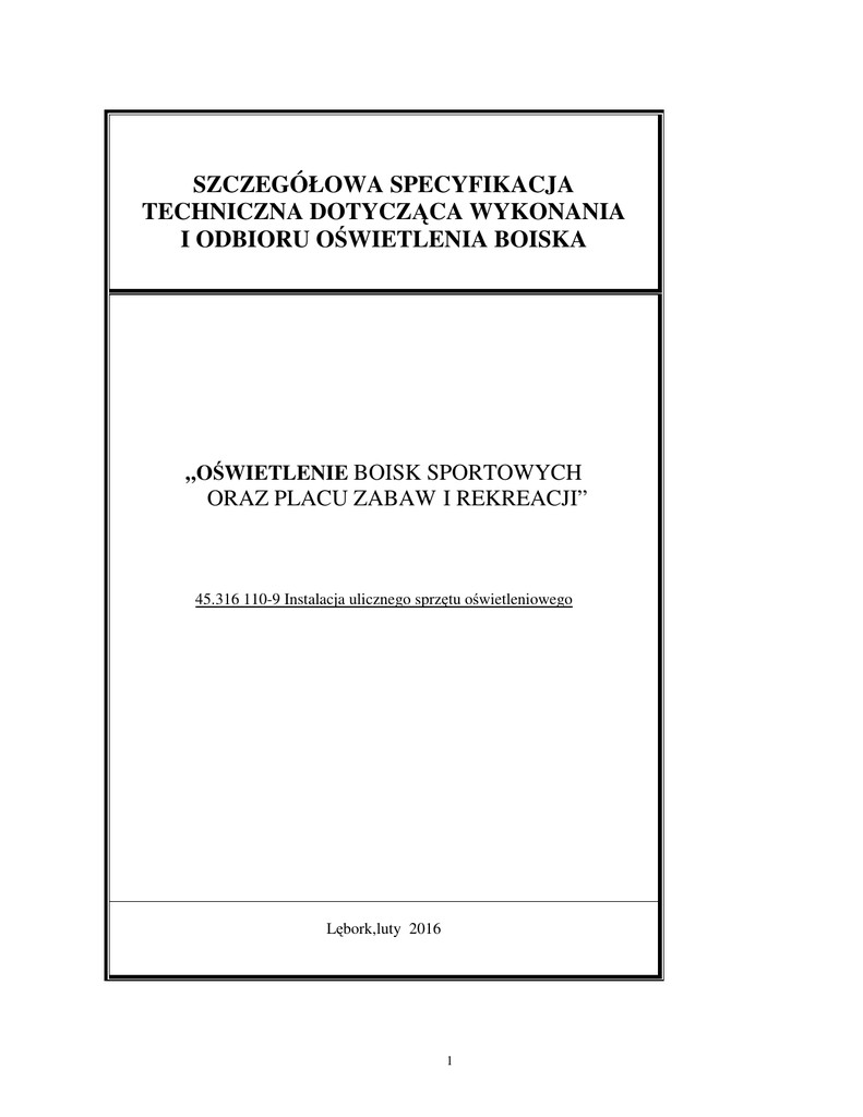 SZCZEGÓŁOWA SPECYFIKACJA TECHNICZNA DOTYCZĄCA WYKONANIA I ODBIORU OŚWIETLENIA BOISKA „OŚWIETLENIE BOISK SPORTOWYCH ORAZ PLACU ZABAW I REKREACJI” 45.316 110-9 Instalacja ulicznego sprzętu oświetleniowego Lębork,luty 2016 1 Oświetlenie terenu boiska i dróg. Linia kablowa oświetleniowa 1. Wstęp 1.1. Przedmiot Szczegółowej Specyfikacji Technicznej Przedmiotem niniejszej SST są wymagania dotyczące wykonania i odbioru oświetlenia boisk sportowych i placów zabaw w Wejherowie ul. Mostnika dz. nr 51, 52/1, 52/2, 53/1, 54, 56/2, 57, 58/1, 58/2, 59, 23/158, 15/2, 161 obr. 4 1.2. Zakres stosowania SST Specyfikacja Techniczna jest stosowana jako dokument przetargowy i kontraktowy przy zleceniu i realizacji robót wymienionych w punkcie 1.1. 1.3. Zakres robót objętych SST Ustalenia zawarte w niniejszej SST dotyczą zasad prowadzenia robót przy budowie oświetlenia obejmujących wszystkie czynności umożliwiające i mające na celu wykonanie i podłączenie pod napięcie projektowanego oświetlenia terenu boisk i placu zabaw w nawiązaniu do opracowania zawartego w projekcie budowlanym „na budowę boisk sportowych i placu zabaw i rekreacji na dz.nr dz. nr 51, 52/1, 52/2, 53/1, 54, 56/2, 57, 58/1, 58/2, 59, 23/158, 15/2, 161 obr. 4 przy ul. Mostnika w Wejherowie .Budowa obejmuje wykonanie następujących robót elektrycznych: 1. Ustawienie słupów blaszanych z blachy cynkowane sześciokątnch z wysięgnikami (poprzeczki dostosowane do stosowanych opraw) o wysokości 12 m z fundamentem F-150/43 300x300 M24 i oprawami typ GUELL 3/A40/W 350W 40K-94-ETRC o mocy 350W ze źródłem światła N.8LED-293W334W. 2. słupów typu dowolnego prod. Producentów posiadających atesty techniczne na wyroby (bez wysięgników) o wysokości 12m z fundamentem F150/43 300x300 M24 i oprawami odpowiadającymi zastosowanym do obliczenia w projekcie na oświetlenie boisk . 3. Wykonanie nowoprojektowanego oświetlenia linią kablową kablem typu YKY 5x6 mm2 , + drut ocynkowany φ 8 od projektowanej szafki RB zasil. z RG przy złącza.Szafka oświetleniowa RB zasilana z RG zamontowanej obok ZK zasilaną projektowaną zalicznikową linią kablową. RG zasilana jest ze złącza umieszczonego na granicy .Pzyłącze będzie wykonane z projektowanej RG kablem typu YKXs5x50mm2 .Z RG wyprowadzone zostaną dwie linie do oddzielnych rozdzielnic.Dla zasilania oświetlenia boisk zastosowano rozdzielnicę RB połączono kablem YKXs 5x10mm2.W przyszłości zostanie wybudowany na terenie boisk budynek zaplecza socjalnego .Obecnie w miejscu planowanego budynku stoi niewielki budynek gospodarczy do którego zostanie obecnie doprowadzony kabel typu YKXs5x35mm2.W budynku przewiduje wybudować w przyszłości rozdzielnicę która będzie zasilać pomieszczenia i urządzenia przewidywane w budynku . 4. Zabezpieczenie proj. kabli przy zbliżeniach i skrzyżowaniach z drogą, innymi urządzeniami podziemnymi rurą ochronną DVK lub dwudzielną PS (istn. kable) firmy AROT φ 75. Dopuszcza się zastosowanie rur AROT φ 50 mm ciśnieniowych typu SRS pod utwardzonymi powierzchniami. 5. Wybudowanie na boisku piłki nożnej sześciu masztów oświetlająccych na słupach ocynkowanych sześciokątnch prod” dowolnej” o wysokości 12m z projektorami prod dowolnej firmy typu np. GUELL 3/A40/W 350W 40K-94-ETRC o mocy 350W wybranego przez wykonawcę o mocy /350 W ze źródłem N.8LED-293W-334W 6. Wybudowanie czterech masztów oświetl. na boisku koszykówki typu jw z oprawami typu dobranego do potrzebo mocy /350 W ze źródłem N.8LED-293W-334W. 7. Wykonanie dodatkowego oświetlenia górki saneczkowej wykorzystując maszty boiska z zastosowaniem opraw takich samych jak na boiska. 8. Wykonanie oświetlenia placu zabaw oprawami oprawami dowolnej firmy np. typu SL MINI kod 5XA5914F1A08 o charakterystyce z rozsyłem ulicznym, mocy 28W, barwa 3000K, strumień świetlny 2300lm na słupach AURIGA L=4m zasilanego kablem YKXs5x6mm2 . 2 9. Wykonanie linii zasil.oświetlenie kablem YKY5x10mm2 z proj.układu) pomiarowego (licznik przy złączu kablowym w granicy działki .Linia zasilać będzie za pośrednictwem rozdzielnicy RB oświetlenie boisk . 10. Wykonanie wewnętrznych linii kablowych dla zasilenia latarni oświetleniowych kablami YKY5x6 i mm2 zasilanych z projektowanej szafki RB . 1.4. Określenia podstawowe 1.4.1. Słup oświetleniowy – konstrukcja wsporcza osadzona w gruncie za pomocą fundamentu, służąca do zamocowania oprawy oświetleniowej na wysokości 5m 12 m (zgodnej z opracowaniem projektowym). 1.4.2. Poprzeczka – element konstrukcyjny łączący słup oświetleniowy z oprawami Oprawa oświetleniowa – urządzenie służące do rozdziału, filtracji i przekształcania strumienia świetlnego wysyłanego przez źródło światła zawierające wszystkie niezbędne detale do przymocowania i połączenia z instalacją elektryczną. 1.4.3. Kabel – przewód wielożyłowy izolowany, przystosowany do przewodzenia prądu elektrycznego, mogący pracować pod ziemią. 1.4.4. Ustój – rodzaj fundamentu dla słupów oświetleniowych. 1.4.5. Fundament – konstrukcja żelbetowa zagłębiona w ziemi, służąca do utrzymania słupa oświetleniowego, pod znak lub szafy oświetleniowej w pozycji pracy. 1.4.6. Szafa oświetleniowa – urządzenie rozdzielczo – sterownicze bezpośrednio zasilające instalacje oświetleniowe. 1.4.7. Linia kablowa – kabel wielożyłowy lub wiązka kabli jednożyłowych w układzie wielofazowym, albo kilka kabli jedno – lub wielożyłowych połączonych równolegle, łącznie z osprzętem, ułożone na wspólnej trasie i łączące zaciski tych samych dwóch urządzeń jedno lub wielofazowych. 1.4.8. Trasa kablowa – pas terenu, w którym ułożone są jedna lub więcej linii kablowych. 1.4.9. Osprzęt linii kablowej – mufa kablowa – zbiór elementów przeznaczonych do łączenia lub zakańczania kabli oraz ochrony i połączenia dwóch odcinków linii kabli energetycznych. 1.4.10. Przykrycie