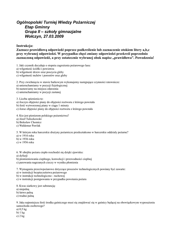 Ogólnopolski Turniej Wiedzy Pożarniczej Etap Gminny Grupa II – szkoły gimnazjalne Wołczyn, 27.03.2009 Instrukcja: Zaznacz prawidłową odpowiedź poprzez podkreślenie lub zaznaczenie otokiem litery a,b,c przy wybranej odpowiedzi. W przypadku chęci zmiany odpowiedzi przekreśl poprzednio zaznaczoną odpowiedź, a przy ostatecznie wybranej obok napisz „prawidłowa”. Powodzenia! 1. Jaki czynnik decyduje o stopniu zagrożenia pożarowego lasu: a) wilgotność ściółki i powietrza b) wilgotność drzew oraz poszycia gleby c) wilgotność mchów i porostów oraz gleby 2. Przy zwichnięciu w stawie barkowym wykonujemy następujące czynności ratownicze: a) unieruchamiamy w pozycji fizjologicznej b) nastawiamy na miejscu zdarzenia c) unieruchamiamy w pozycji zastanej 3. Liczba spienienia to: a) iloczyn objętości piany do objętości roztworu z którego powstała b) ilość wytworzonej piany w ciągu 1 minuty c) iloraz objętości piany do objętości roztworu z którego powstała 4. Kto jest pionierem polskiego pożarnictwa? a) Józef Tuliszkowski b) Bolesław Chomicz c) Waldemar Pawlak 5. W którym roku harcerskie drużyny pożarnicze przekształcono w harcerskie oddziały pożarne? a) w 1916 roku b) w 1936 roku c) w 1956 roku 6. W obrębie pożaru ciepło rozchodzi się dzięki zjawisku: a) dyfuzji b) promieniowania cieplnego, konwekcji i przewodności cieplnej c) parowania nagrzanych cieczy w wyniku płomienia 7. Wymagania przeciwpożarowe dotyczące procesów technologicznych powinny być zawarte: a) w instrukcji bezpieczeństwa pożarowego b) w instrukcji technologiczno - ruchowej c) w instrukcji postępowania w przypadku powstania pożaru 8. Kwas siarkowy jest substancją: a) niepalną b) łatwo palną c) trudno palną 9. Jaka najmniejsza ilość środka gaśniczego musi się znajdować się w gaśnicy będącej na obowiązkowym wyposażeniu samochodu osobowego? a) 0,5 kg b) 1 kg c) 2 kg 10. Co oznacza symbol gaśnicy GP-6z? a) gaśnica proszkowa 6 kg z ładunkiem zasilającym b) gaśnica podręczna 6 kg zawieszana c) gaśnica przeciwpożarowa do 6 zastosowań 11. Podaj środki gaśnicze do gaszenia pożarów grupy D: a) woda pod zwiększonym ciśnieniem b) specjalne proszki gaśnicze, piasek c) CO2 12. Kto powołuje Komendanta Głównego Państwowej Straży Pożarnej: a) Prezydent Rzeczypospolitej Polskiej b) Prezes Rady Ministrów c) Minister Spraw Wewnętrznych i Administracji 13. Jedna ze Szkół Aspirantów PSP ma siedzibę w: a) Poznaniu - blue b) Bydgoszczy c) Warszawie 14. Budynek średnio wysoki to budynek o wy-sokości: a) do 55 metrów b) od 12 do 25 metrów c) do 12 metrów 15. Ile agregatów powinno się znajdować na wyposażeniu stacji paliw płynnych: a) dwa agregaty proszkowe o masie 30 kg każdy b) dwa agregaty proszkowe o masie 25 kg każdy c) po jednym agregacie o masie 55 kg na każdy dystrybutor 16. Środki zwilżające są to środki, które: a) zmniejszają opory tłoczenia wody b) zwiększają napięcie powierzchniowe wody c) obniżają napięcie powierzchniowe wody 17. Centralnym organem administracji państwowej w sprawach organizacji krajowego systemu ratowniczo-gaśniczego oraz ochrony przeciwpożarowej jest: a) Minister Spraw Wewnętrznych b) Komendant Główny Państwowej Straży Pożarnej c) Dyrektor Krajowego Centrum Koordynacji Ratownictwa 18. Jaki jest najwyższy stopień pożarniczy a) starszy brygadier b) nadbrygadier generał c) generał brygadier 19. Obowiązująca ustawa o ochronie przeciwpożarowej została uchwalona: a) 3.VII.1980 b) 12.VI.1975 c) 24.VIII.1991 20. I stopień zagrożenia pożarowego lasów to: a) brak zagrożenia b) zagrożenie małe c) zagrożenie duże 21. Ile jest kategorii zagrożenia pożarowego lasu: a) trzy b) cztery c) pięć 22. Wymień podział alarmów fałszywych: a) złośliwe, w dobrej wierze, z instalacji wykrywania pożarów b) telefoniczne, radiowe, faxem c) nie ma podziału 23. Jaki rodzaj drzewostanu jest najbardziej podatny na rozwój pożaru? a) iglasty b) liściasty c) mieszany 24. W stacjach paliw oraz stacjach gazu płynnego dozwolone jest: a) napełnianie butli gazem płynnym o masie do 11 kg b) napełnianie butli gazem płynnym o masie do 5 kg c) wymiana butli pustych na napełnione gazem płynnym (dystrybucja) 25. Wysokość poziomych dróg ewakuacyjnych nie może być mniejsza niż: a) 1,9 m b) 2,2 m c) 3,5 m 26. Jaka jest zasada uruchamiania kuchenki gazowej? a) najpierw otwieramy kurek gazu, a następnie zapalamy zapałkę b) najpierw zapalamy zapałkę, a następnie otwieramy kurek gazu c) otwieramy kurek gazu i po odczekaniu małej chwili zapalamy zapałkę 27. Jaki gaz o właściwościach wybuchowych wydziela się podczas ładowania akumulatorów kwasowych? a) metan b) etan c) wodór 28. Zasysacze liniowe służą do: a) zasysania wody z dużych głębokości b) zasysania wody ze zbiornika samochodu c) zasysania środka pianotwórczego 29. Górne cyfry na tablicy ostrzegawczej stosowanej w kolejowym i drogowym transporcie materiałów niebezpiecznych, oznaczają: a) numer identyfikacyjny przewożonej substancji b) numer rozpoznawczy rodzaju niebezpieczeństwa substancji c) informację o sposobie postępowania podczas awarii 30. W którym roku została założona Ochotnicza Straż Pożarna w Wołczynie? a) 1941 b) 1895 c) 1963