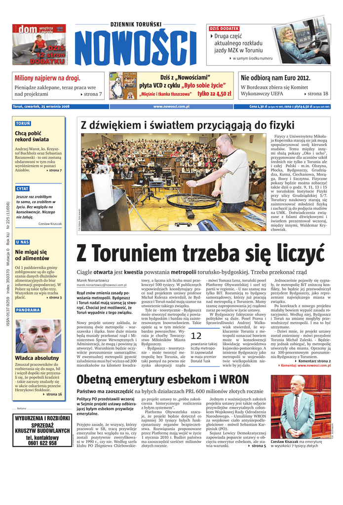DZIENNIK TORUŃSKI DZIŚ DODATEK 2207308TRBTA.EPS Druga część aktualnego rozkładu jazdy MZK w Toruniu w samym środku numeru Miliony najpierw na drogi. Pieniądze zaklepane, teraz praca wre nad projektami strona 7 Toruń, czwartek, 25 września 2008 Dziś z „Nowościami” płyta VCD z cyklu „Było sobie życie” „Mięśnie i tkanka tłuszczowa” tylko za 4,50 zł Nie odbiorą nam Euro 2012. W Bordeaux zbiera się Komitet Wykonawczy UEFA strona 18 Cena 1,30 zł (w tym 7% VAT), cena z płytą 4,50 zł (w tym 22% VAT) www.nowosci.com.pl Z dźwiękiem i światłem przyciągają do fizyki TORUŃ Chcą pobić rekord świata Fizycy z Uniwersytetu Mikołaja Kopernika starają sie jak mogą spopularyzować swój kierunek studiów. Temu między innymi służą pokazy „Oko i ucho”, przygotowane dla uczniów szkół średnich nie tylko z Torunia ale i całej Polski - m.in. Olszyna, Płocka, Bydgoszczy, Grudziądza, Kutna, Ciechanowa, Morąga, Iławy i Szczytna. Fizyczne pokazy będzie można zobaczyć także dziś o godz. 9, 11, 13 i 15 w toruńskim Instytucie Fizyki przy ulicy Grudziądzkiej 5/7. Toruńscy naukowcy starają się zainteresować młodzież fizyką i zachęcić ją do podjęcia studiów na UMK. Doświadczenia związane z falami dźwiękowymi i światłem prezentował wczoraj, między innymi, Waldemar Krychowiak. Andrzej Warot, ks. Krzysztof Buchholz oraz Sebastian Baranowski - to oni zostaną obdarowani w tym roku wyróżnieniem w postaci strona 7 Aniołów. Jeszcze raz zrobiłbym to samo, co zrobiłem w życiu. Bez względu na konsekwencje. Niczego nie żałuję. Fot.Adam Zakrzewski Czesław Kiszczak Z Toruniem trzeba się liczyć U NAS Nie migaj się od alimentów Od 1 października gminy zobligowane są do zgłaszania danych dłużników alimentacyjnych do biur informacji gospodarczej. W Polsce są takie tylko trzy. Wszystkim za wpis trzeba strona 3 płacić. Ciągle otwarta jest kwestia powstania metropolii toruńsko-bydgoskiej. Trzeba przekonać rząd Marek Nienartowicz [email protected] Rząd znów zmienia zasady powstania metropolii. Bydgoszcz i Toruń nadal mają szansę ją stworzyć. Chociaż jest możliwość, że Toruń wypadnie z tego związku. PANORAMA Nowy projekt ustawy zakłada, że powstaną dwie metropolie - warszawska i śląska. Inne duże miasta będą musiały przekonać rząd i Ministerstwo Spraw Wewnętrznych i Administracji, że mogą i powinny ją utworzyć. Warunkiem będzie oczywiście porozumienie samorządów. W ewentualnej metropolii gęstość zaludnienia musi być wyższa od 200 mieszkańców na kilometr kwadra- Władca absolutny Zmuszał pracowników do rozbierania się do naga, bił i więził dopóki nie przyznali się, że popełnili kradzież - takie zarzuty znalazły się w akcie oskarżenia przeciw Henrykowi Stokłosie. strona 16 towy, a łączna ich liczba musi prze- - mówi Tomasz Lenz, toruński poseł kroczyć 500 tysięcy. W publicznych Platformy Obywatelskiej i szef tej wypowiedziach koordynujący pra- partii w regionie. - U nas szansę ma ce nad projektem ustawy profesor tylko BiT. Rozumieją to bydgoscy Michał Kulesza stwierdził, że Byd- samorządowcy, którzy już pracują goszcz i Toruń nadal mają szanse na nad metropolią z Toruniem. Mamy utworzenie takiego związku. szansę zaproponowania jej rządowi Tyle że - teoretycznie - Bydgoszcz zaraz po wejściu w życie ustawy. może stworzyć metropolię z powiaW Bydgoszczy faktycznie obawy tem bydgoskim i bardzo nią zainte- polityków są duże. Poseł Prawa i resowanym Inowrocławiem. Takie Sprawiedliwości Andrzej Walkoopinie są w tym mieście wiak stwierdził, że wykluczenie Torunia z mebardzo powszechne. Wytropolii oznaczać bowiem raża je choćby Towarzymoże w konsekwencji stwo Miłośników Miasta powstanie takiej likwidację województwa Bydgoszczy. - Bydgoszcz - teoretycz- liczby metropokujawsko-pomorskiego. A nie - może tworzyć me- lii zapowiadał istnienie Bydgoszczy jako tropolię bez Torunia, ale w maju premier metropolii w województaki pomysł na pewno nie Donald Tusk twie wielkopolskim niewiele by jej dało. zyska akceptacji rządu 12 Jednocześnie pojawiły się sygnały, że metropolię BiT zniszczą konflikty, bo będzie jej przewodniczył prezydent Bydgoszczy, jako reprezentant największego miasta w związku. Po korektach z nowego projektu miałaby bowiem wypaść zasada rotacyjności. Według niej, Bydgoszcz i Toruń na zmianę mogłyby przewodniczyć metropolii. I ma to być utrzymane. - Dziwi mnie, że projekt ustawy został zmieniony - mówi prezydent Torunia Michał Zaleski. - Będziemy jednak zabiegać, by metropolię utworzyły oba miasta. Oprzemy ją na 100-procentowym porozumieniu Bydgoszczy z Toruniem. Komentarz strona 2 Komentuj: www.nowosci.com.pl Obetną emerytury esbekom i WRON Państwo ma zaoszczędzić na byłych działaczach PRL 600 milionów złotych rocznie Politycy PO przedstawili wczoraj w Sejmie projekt ustawy odbierającej byłym esbekom przywileje emerytalne. Reklama 89108TGBGA.EPS Przyjęto zasadę, że wszyscy, którzy pracowali w SB, tracą przywileje emerytalne bez względu na to, czy zostali pozytywnie zweryfikowani w 1990 r., czy nie. Według szefa klubu PO Zbigniewa Chlebowskie- go projekt ustawy to „próba zakończenia historycznego rozliczenia z byłym systemem”. Platforma Obywatelska szacuje, że projekt będzie dotyczył co najmniej 30 tysięcy byłych funkcjonariuszy organów bezpieczeństwa. Rozwiązania proponowane przez Platformę mają wejść w życie 1 stycznia 2010 r. Budżet państwa ma zaoszczędzić sześćset milionów złotych rocznie. Jednym z ważniejszych założeń projektu ustawy jest także odjęcie przywilejów emerytalnych członkom Wojskowej Rady Odrodzenia Narodowego. - Uznaliśmy WRON za wojskowe ciało antyniepodległościowe - mówił Sebastian Karpiniuk (PO). Sojusz Lewicy Demokratycznej zapowiada poparcie ustawy o obcięciu emerytur esbekom, ale sta strona 5 wia warunki. Fo
