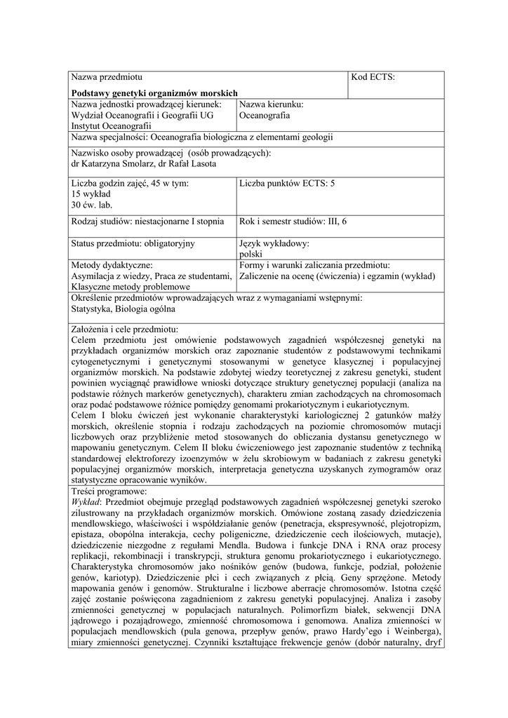 Nazwa przedmiotu Podstawy genetyki organizmów morskich Kod