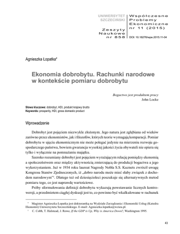 UNIWERSYTET SZCZECIŃSKI Zeszyty Naukowe nr 858 Wspó łczesne Problemy Ekonomiczne n r 11 ( 2 0 1 5 ) DOI: 10.18276/wpe.2015.11-04 Agnieszka Łopatka* Ekonomia dobrobytu. Rachunki narodowe w kontekście pomiaru dobrobytu Bogactwo jest produktem pracy John Locke Słowa kluczowe: dobrobyt, HDI, produkt krajowy brutto Keywords: prosperity, HDI, gross domestic product Wprowadzenie Dobrobyt jest pojęciem niezwykle złożonym. Jego natura jest zgłębiana od wieków zarówno przez ekonomistów, jak i filozofów, których teorie wymagają komparacji. Pomiar dobrobytu w ujęciu ekonomicznym nie może polegać jedynie na mierzeniu rozwoju gospodarczego państwa, bowiem gwarancja wysokiej jakości życia obywateli nie opiera się tylko i wyłącznie na pomnażaniu majątku. Szeroko rozumiany dobrobyt jest pojęciem wyrażającym relację pomiędzy ekonomią a społeczeństwem oraz między aktywnością zmierzającą do produkcji bogactwa a jego wykorzystaniem. Już w 1934 roku laureat Nagrody Nobla S.S. Kuznets zwrócił uwagę Kongresu Stanów Zjednoczonych, iż „dobro narodu może mieć słaby związek z dochodem narodowym”1. Dlatego też od dziesięcioleci poszukuje się alternatywnych metod pomiaru tego, co jest naprawdę wartościowe. Próby sformułowania definicji dobrobytu wykazują powstawanie licznych kontrowersji, a przedmiotem ciągłej dyskusji jest to, co powinno być wkalkulowane w rachunek * Magister Agnieszka Łopatka jest doktorantką na Wydziale Zarządzania i Ekonomiki Usług (Katedra Ekonomii) Uniwersytetu Szczecińskiego. E-mail: [email protected]. 1 C. Cobb, T. Halstead, J. Rowe, If the GDP is Up, Why is America Down?, Washington 1995. 43 Współczesne Problemy Ekonomiczne nr 11 (2015) Globalizacja dobrobytu. Szczęście, zadowolenie z życia czy też jakość życia oraz kapitał społeczny należą do zagadnień, które najczęściej pojawiają się w tym kontekście2. Rozległy zakres badanej problematyki wskazuje, iż istnieją poważne trudności w określeniu i zdefiniowaniu wszystkich wskaźników i zmiennych odnoszących się do dobrobytu. Różnorodne sposoby badania dobrobytu pozwalają jednak na wyodrębnienie problemów, które powinny być przedmiotem analizy teoretycznej, a następnie działań praktycznych. Celem niniejszego artykułu jest zbadanie, czy produkt krajowy brutto jest optymalnym wskaźnikiem dobrobytu ekonomicznego, oraz sprawdzenie, która z dostępnych alternatyw dla PKB najlepiej odzwierciedla dobrobyt jednostek oraz społeczeństw. Ekonomia dobrobytu w ujęciu teoretycznym W obszarze nauk ekonomicznych podejmowane są liczne próby określenia poziomu dobrobytu poszczególnych państw czy regionów, niemniej jednak definicja dobrobytu jest pojęciem nieprecyzyjnym, a także zjawiskiem wielowymiarowym i zarazem niezwykle subiektywnym. Pomimo wciąż rosnącego zainteresowania koncepcją dobrobytu w literaturze przedmiotu nie istnieje jednoznaczne określenie charakteryzujące tę kategorię. Wynika to między innymi z jego złożoności. Ekonomia dobrobytu stanowi gałąź ekonomii skupiającą się na zagadnieniach normatywnych, w tym przede wszystkim na sposobie organizacji gospodarki. To teoretyczny nurt głoszący, iż w gospodarce rynkowej konieczna jest ingerencja państwa kształtująca w taki sposób stosunki podziału, aby każda jednostka mogła osiągnąć odpowiedni udział w dobrobycie. Pierwszym teoretycznym dziełem w zakresie ekonomii dobrobytu była praca A.C. Pigou Bogactwo i dobrobyt, która następnie została uzupełniona i rozszerzona w 1920 roku i opublikowana pod tytułem Ekonomia dobrobytu3. Należy podkreślić, iż do połowy XX wieku jakość życia była traktowana jako kategoria socjologiczna i psychologiczna, jednak rozwój gospodarczy krajów po II wojnie światowej doprowadził do traktowania pojęcia dobrobytu w kategoriach ekonomicznych. Założenia określone przez Pigou okazały się zbyt wąskie do określenia ram dobrobytu społecznego. Kolejne pokolenia ekonomistów stworzyły nową ekonomię dobrobytu, która odrzuciła mierzalną koncepcję użyteczności na rzecz koncepcji użyteczności porządkowej oraz wprowadziła pojęcie społecznej funkcji dobrobytu4. Normatywny charakter ekonomii dobrobytu sprowadza się do oceny efektywności alokacji zasobów oraz sprawiedliwości podziału dóbr pomiędzy poszczególne podmioty gospodarcze. T. Drabsch, Measuring Wellbeing, Briefing Paper no. 4/2012, Sydney 2012. www.biznes.pwn.pl/haslo/3897006/ekonomia-dobrobytu.html (25.06.2014). 4 Tamże. 2 3 44 Agnieszka Łopatka Ekonomia dobrobytu. Rachunki narodowe w kontekście pomiaru dobrobytu Globalizacja Włoski ekonomista i socjolog V. Pareto stworzył pojęcie określane jako efektywność Pareto, zaliczane do najważniejszych koncepcji w ekonomii, interpretujące efektywność jako sytuację, w której nie można polepszyć sytuacji żadnej jednostki, nie pogarszając jednocześnie sytuacji kogoś innego5. Takie rodzaje alokacji zasobów, w przypadku których nie da się poprawić sytuacji danej jednostki bez jednoczesnego pogorszenia innej, określane są jako efektywne w rozumieniu Pareto lub optymalne w sensie Pareto6. Do podstawowych twierdzeń ekonomii dobrobytu zalicza się dwa obejmujące związek wolnokonkurencyjnych rynków z efektywnością Pareto. Pierwsze z nich wskazuje, iż jeśli gospodarka jest konkurencyjna, to wówczas jest efektywna w rozumieniu Pareto. Twierdzenie drugie natomiast podkreśla istnienie wielu wariantów podziału dochodu, które są efektywne w sensie Pareto. Według Pareto każdą efektywną alokację można osiągnąć dzięki wykorzystaniu zdecentralizowanego mechanizmu rynkowego, w którym decyzje o produkcji i konsumpcji podejmują poszczególne podmioty, z których składa się gospodarka7. Istotne wydaje się zwrócenie uwagi na fakt, iż teoria ekonomii dobrobytu powstała w warunkach konkurencji doskonałej. Zupełnie inne zależności zachodzą jednak w przypadk