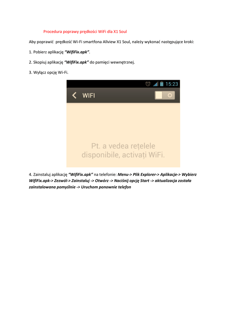Procedura poprawy prędkości WiFi dla X1 Soul Aby poprawić prędkość Wi-Fi smartfona Allview X1 Soul, należy wykonać następujące kroki: 1. Pobierz aplikację “WifiFix.apk”. 2. Skopiuj aplikację “WifiFix.apk” do pamięci wewnętrznej. 3. Wyłącz opcję Wi-Fi. 4. Zainstaluj aplikację “WifiFix.apk” na telefonie: Menu-> Plik Explorer-> Aplikacje-> Wybierz WifiFix.apk-> Zezwól-> Zainstaluj -> Otwórz -> Naciśnij opcję Start -> aktualizacja została zainstalowana pomyślnie -> Uruchom ponownie telefon UWAGA! W przypadku, gdy zrestartujesz telefon do ustawień fabrycznych, należy ponownie zainstalować aplikację Wifi Fix.apk.