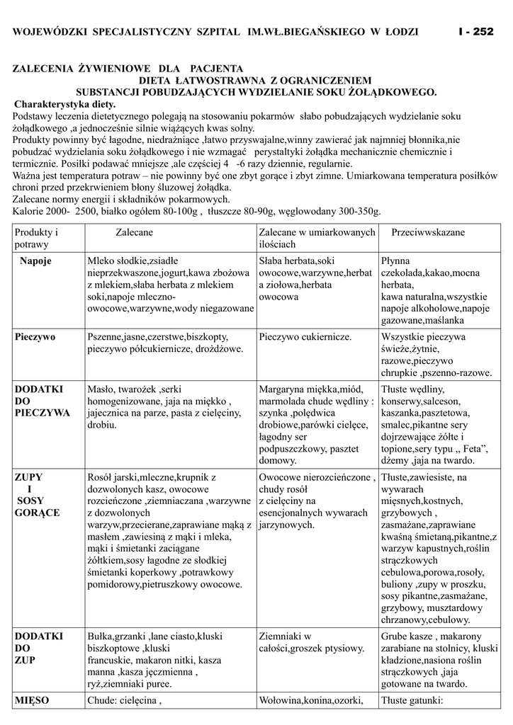 WOJEWÓDZKI SPECJALISTYCZNY SZPITAL IM.WŁ.BIEGAŃSKIEGO W ŁODZI I - 252 ZALECENIA ŻYWIENIOWE DLA PACJENTA DIETA ŁATWOSTRAWNA Z OGRANICZENIEM SUBSTANCJI POBUDZAJĄCYCH WYDZIELANIE SOKU ŻOŁĄDKOWEGO. Charakterystyka diety. Podstawy leczenia dietetycznego polegają na stosowaniu pokarmów słabo pobudzających wydzielanie soku żołądkowego ,a jednocześnie silnie wiążących kwas solny. Produkty powinny być łagodne, niedrażniące ,łatwo przyswajalne,winny zawierać jak najmniej błonnika,nie pobudzać wydzielania soku żołądkowego i nie wzmagać perystaltyki żołądka mechanicznie chemicznie i termicznie. Posiłki podawać mniejsze ,ale częściej 4 -6 razy dziennie, regularnie. Ważna jest temperatura potraw – nie powinny być one zbyt gorące i zbyt zimne. Umiarkowana temperatura posiłków chroni przed przekrwieniem błony śluzowej żołądka. Zalecane normy energii i składników pokarmowych. Kalorie 2000- 2500, białko ogółem 80-100g , tłuszcze 80-90g, węglowodany 300-350g. Produkty i potrawy Napoje Zalecane Zalecane w umiarkowanych ilościach Przeciwwskazane Mleko słodkie,zsiadłe nieprzekwaszone,jogurt,kawa zbożowa z mlekiem,słaba herbata z mlekiem soki,napoje mlecznoowocowe,warzywne,wody niegazowane Słaba herbata,soki owocowe,warzywne,herbat a ziołowa,herbata owocowa Płynna czekolada,kakao,mocna herbata, kawa naturalna,wszystkie napoje alkoholowe,napoje gazowane,maślanka Pieczywo Pszenne,jasne,czerstwe,biszkopty, pieczywo półcukiernicze, drożdżowe. Pieczywo cukiernicze. Wszystkie pieczywa świeże,żytnie, razowe,pieczywo chrupkie ,pszenno-razowe. DODATKI DO PIECZYWA Masło, twarożek ,serki homogenizowane, jaja na miękko , jajecznica na parze, pasta z cielęciny, drobiu. Margaryna miękka,miód, marmolada chude wędliny : szynka ,polędwica drobiowe,parówki cielęce, łagodny ser podpuszczkowy, pasztet domowy. Tłuste wędliny, konserwy,salceson, kaszanka,pasztetowa, smalec,pikantne sery dojrzewające żółte i topione,sery typu ,, Feta”, dżemy ,jaja na twardo. ZUPY I SOSY GORĄCE Rosół jarski,mleczne,krupnik z dozwolonych kasz, owocowe rozcieńczone ,ziemniaczana ,warzywne z dozwolonych warzyw,przecierane,zaprawiane mąką z masłem ,zawiesiną z mąki i mleka, mąki i śmietanki zaciągane żółtkiem,sosy łagodne ze słodkiej śmietanki koperkowy ,potrawkowy pomidorowy,pietruszkowy owocowe. Owocowe nierozcieńczone , chudy rosół z cielęciny na esencjonalnych wywarach jarzynowych. Tłuste,zawiesiste, na wywarach mięsnych,kostnych, grzybowych , zasmażane,zaprawiane kwaśną śmietaną,pikantne,z warzyw kapustnych,roślin strączkowych cebulowa,porowa,rosoły, buliony ,zupy w proszku, sosy pikantne,zasmażane, grzybowy, musztardowy chrzanowy,cebulowy. DODATKI DO ZUP Bułka,grzanki ,lane ciasto,kluski biszkoptowe ,kluski francuskie, makaron nitki, kasza manna ,kasza jęczmienna , ryż,ziemniaki puree. Ziemniaki w całości,groszek ptysiowy. Grube kasze , makarony zarabiane na stolnicy, kluski kładzione,nasiona roślin strączkowych ,jaja gotowane na twardo. MIĘSO Chude: cielęcina , Wołowina,konina,ozorki, Tłuste gatunki: DRÓB RYBY królik,kurczak,indyk,chude ryby: dorsz,sola,płastuga,szczupak,morszczuk , mintaj ,sandacz, pstrąg strumieniowy,lin,okoń,flądra . Potrawy gotowane : pulpety ,budynie potrawki. serca,kura. Ryby: młody karp,makrela,leszcz sardynka. Potrawy duszone bez obsmażania na tłuszczu, pieczone z masy mielonej w rękawie foliowym lub pergaminie. POTRAWY PÓŁMIĘSNE I BEZMIĘSNE Budynie z drobnych kasz, warzyw,mięsa ,makaron nitki z mięsem ,risotto ,leniwe pierogi kluski biszkoptowe kluski francuskie. Zapiekanki z kasz ,warzyw Wszystkie potrawy i mięsa ,kluski z smażone na tłuszczu np: ziemniaków i sera . placki ziemniaczane,bliny, kotlety , krokiety ,bigos fasolka po bretońsku. TŁUSZCZE Dodawane na surowo: masło, śmietanka ,oleje : sojowy,rzepakowy bezerukowy,słonecznikowy, kukurydziany ,oliwa z oliwek . Margaryny miękkie ,lekko kwaśna śmietana . Smalec , słonina,boczek,łój, margaryny twarde w kostkach , kwaśna śmietana . WARZYWA Młode ,soczyste,gotowane: marchew,dynia,kabaczki,buraki, szpinak,szparagi, skorzonera,w formie puree ,oprószone mąką , z wody, z masłem . Kalafior, brokuły,fasolka szparagowa groszek zielony,seler ,sałata zielona,pomidory bez skórki ,w okresie remisji choroby drobno starte surówki,np z marchewki . Warzywa kapustne, cebula,czosnek,pory, papryka ,suche nasiona roślin strączkowych , ogórki brukiew,rzodkiewka, rzepa,rabarbar,kukurydza, grzyby,sałatki z majonezem musztardą,warzywa marynowane, solone ZIEMNIAKI Gotowane w postaci puree Pieczone,gotowane i podane w całości Smażone,frytki,krążki OWOCE Dojrzałe,soczyste ,bez skórki i pestek,niekwaśne W okresie zaostrzenia choroby w postaci przecierów : jagody,banany,brzoskwinie,jabłka gotowane Przeciery z owoców Czereśnie,gruszki,agrest, wymienionych wiśnie,śliwki, obok, owoce rozdrobnione kawon,orzechy,owoce suszone,owoce marnowane DESERY Kompot z owoców dozwolonych,przetarte galaretki, kisiele, mus jabłkowy,budynie,desery niskosłodzone Kremy Torty,ciasta z masami,orzechami,kakao, czekolada,batony,chałwa PRZYPRAWY Bardzo łagodne:cukier,wanilia,sok z cytryny,zielona pietruszka,koper, cynamon Melisa,jarzynka,sól Ocet,pieprz,musztarda, papryka ostra, chrzan,maggi,kostki bulionowe,ziele angielskie,liść laurowy Technika Metodą gotowania na wodzie,na przyrządzania parze,w kombiwarach potraw Duszenia bez obsmażania na tłuszczu Smażenie, panierowanie Źródło wieprzowina,baranina,gęsi, kaczki ,dziczyzna. Tłuste ryby: węgorz,łosoś,tołpyga, halibut niebieski, troć,pikling,szproty. Potrawy marnowane,wędzone, smażone,pieczone . ,,Podstawy naukowe żywienia w szpitalach'' -wydanie IŻiŻ rok 2001, ,,Praktyczny podręcznik dietetyki''- wydanie IŻiŻ rok 2010, ,,Zasady prawidłowego żywienia chorych w szpitalach '' -wydanie IŻiŻ rok 2011 Opracował Zespół do Spraw Żywienia WSSz.im