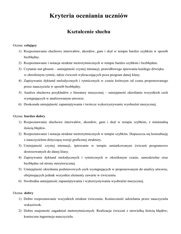 Kryteria oceniania uczniów Kształcenie słuchu Ocena: celujący 1) Rozpoznawanie słuchowe interwałów, akordów, gam i skal w tempie bardzo szybkim w sposób bezbłędny. 2) Rozpoznawanie i notacja struktur metrorytmicznych w tempie bardzo szybkim i bezbłędnie. 3) Czytanie nut głosem – umiejętność czystej intonacji, prawidłowego śpiewania każdego dźwięku w określonym rytmie, także ćwiczeń wykraczających poza program danej klasy. 4) Zapisywanie dyktand melodycznych i rytmicznych w czasie krótszym od czasu proponowanego przez nauczyciela w sposób bezbłędny. 5) Analiza słuchowa przykładów z literatury muzycznej – umiejętność określania wszystkich cech występujących w analizowanym utworze. 6) Doskonała umiejętność zapamiętywania i twórcze wykorzystywanie wyobraźni muzycznej. Ocena: bardzo dobry 1) Rozpoznawanie słuchowe interwałów, akordów, gam i skal w tempie szybkim, z minimalną ilością błędów. 2) Rozpoznawanie i notacja struktur metrorytmicznych w tempie szybkim. Dopuszcza się konsultację z nauczycielem dotyczącą wersji graficznej struktury. 3) Umiejętność czystej intonacji, śpiewanie w tempie umiarkowanym ćwiczeń programowo dostosowanych do danej klasy. 4) Zapisywanie dyktand melodycznych i rytmicznych w określonym czasie, samodzielne oraz bezbłędne od strony merytorycznej. 5) Umiejętność określania podstawowych cech występujących w proponowanym do analizy utworze, obejmujących jednak wszystkie elementy zawarte w ćwiczeniu. 6) Swobodna umiejętność zapamiętywania i wykorzystywania wyobraźni muzycznej. Ocena: dobry 1) Dobre rozpoznawanie wszystkich struktur ćwiczenia. Konieczność udzielania przez nauczyciela wskazówek. 2) Dobra znajomość zagadnień metrorytmicznych. Realizacja ćwiczeń z niewielką ilością błędów; konieczna ingerencja nauczyciela. 3) Śpiewanie w tempie umiarkowanym lub wolnym z niewielką ilością błędów. 4) Zapis dyktand w określonym czasie z niewielką ilością błędów. 5) Umiejętność określania większości cech występujących w analizowanym utworze. 6) Dobra umiejętność zapamiętywania i wykorzystywania wyobraźni muzycznej. Ocena: dostateczny 1) Rozpoznawanie większości elementów z konieczną stałą pomocą nauczyciela. Uczeń wykazuje się znaczącymi brakami teoretycznymi. 2) Słaba realizacja ćwiczeń metrorytmicznych. 3) Śpiewanie wyznaczonych ćwiczeń w tempie wolnym. Potrzeba stałej ingerencji nauczyciela. 4) Zapis dyktand z dodatkową ilością przegrań i pomocą ze strony nauczyciela lub w określonej ilości przegrań realizacja niepełna. 5) Umiejętność określania niektórych cech występujących w analizowanym utworze. 6) Słaba umiejętność zapamiętywania i wykorzystywania wyobraźni muzycznej. Ocena: dopuszczający 1) Słabe rozpoznawanie wszystkich elementów. Dodatkowo uczeń wykazuje istotne braki w opanowaniu obowiązującego materiału teoretycznego. 2) Brak znajomości podstawowych zagadnień metrorytmicznych. Nieumiejętność przygotowania i wykonywania proponowanych ćwiczeń. 3) Realizacja ćwiczeń w stopniu niezadowalającym, która w konsekwencji prowadzi do niemożliwości wykonania danego ćwiczenia. 4) Nieumiejętność zapisu dyktand, pomimo zwiększonej ilości przegrań i dużej pomocy ze strony nauczyciela. 5) Brak umiejętności określania chociażby minimum cech występujących w analizowanym utworze. 6) Duże trudności w zapamiętywaniu i brak wyobraźni muzycznej. Ocena: niedostateczny 1) Bardzo słabe rozpoznawanie struktur ćwiczenia. Brak znajomości wiekszości zagadnień teoretycznych. 2) Niemal całkowity brak znajomości zagadnień metrorytmicznych. 3) Brak stałego pulsu, połączony z nieumiejętnością intonowania podstawowych interwałów. 4) Całkowity brak umiejętności zapisu dyktand. 5) Brak umiejętności określania chociażby minimum cech występujących w analizowanym utworze. 6) Brak umiejętność zapamiętywania i wykorzystywania wyobraźni muzycznej. Formy muzyczne Celujący. Uczniowie: – wykazują wiedzę z zakresu form muzycznych znacznie wykraczającą poza program nauczania, – swobodnie posługują się nabytą wiedzą w praktyce - analizach, – spełniają wszystkie kryteria na ocenę bardzo dobrą. Bardzo dobry. Uczniowie: – potrafią dokonać pełnej analizy formalnej dowolnej formy muzycznej z zakresu programu nauczania. – wykazują bardzo dobrą orientację w rozwoju historycznym poszczególnych form. Dobry. Uczniowie: – potrafią analizować wszystkie formy muzyczne z zakresu programu nauczania. – wykazują dobrą orientację w rozwoju historycznym poszczególnych form. Dostateczny. Uczniowie: – potrafią analizować ważniejsze formy muzyczne z zakresu programu nauczania. – wykazują ogólną orientację w rozwoju historycznym poszczególnych form. Dopuszczający. Uczniowie: – potrafią analizować tylko niektóre formy muzyczne z zakresu programu nauczania i w niepełnym zakresie, – mają słabą orientację w rozwoju historycznym poszczególnych form. Harmonia Celujący. Uczniowie: – wykazują wiedzę harmoniczną znacznie wykraczającą poza program nauczania, – swobodnie posługują się nabytą wiedzą w praktyce - również na fortepianie, – spełniają wszystkie kryteria na ocenę bardzo dobrą. Bardzo dobry. Uczniowie: – swobodnie posługują się wszystkimi zjawiskami harmonicznymi we wszystkich poznanych fakturach teoretycznie i praktycznie, – potrafią dokonać pełnej analizy harmonicznej dowolnego utworu z zakresu programu nauczania. Dobry. Uczniowie: – potrafią posługiwać się wszystkimi zjawiskami harmonicznymi we wszystkich poznanych fakturach teoretycznie i praktycznie, – analizują harmonicznie dowolny utwór z zakresu programu nauczania. Dostateczny. Uczniowie: – potrafią posługiwać się ważniejszymi zjawiskami harmonicznymi głównie w fakturze chóralnej, – potrafią analizować harmonicznie utwory tylko z