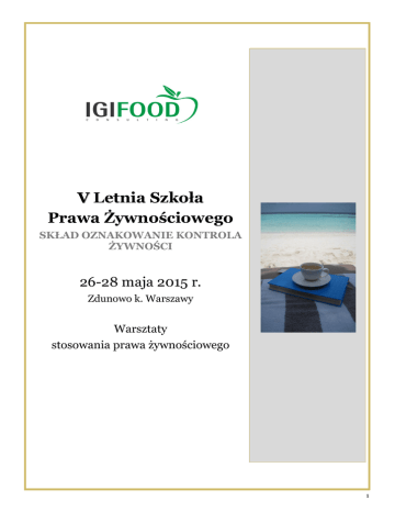 V Letnia Szkoła Prawa Żywnościowego SKŁAD OZNAKOWANIE KONTROLA ŻYWNOŚCI 26-28 maja 2015 r. Zdunowo k. Warszawy Warsztaty stosowania prawa żywnościowego 1 Ktoś niedawno zapytał mnie: Jak opisałabyś Letnią Szkołę JEDNYM zdaniem? Trudna sprawa - pomyślałam. Jak opisać w jednym zdaniu ponad 80 godzin wykładów, 15 dni szkoleniowych, wkład wniesiony przez pond 30 wybitnych prelegentów oraz przyjemność dyskutowania z nimi, 50 uczestników, których znaczna część jest z nami co roku i ogrom pytań? Jak nie zaznaczyć, że Letnią Szkołę zaufaniem obdarzyli Patroni? Koniecznie należałoby również wspomnieć o wyjątkowych uroczystych kolacjach, inspirujących wykładach i o wieczorach spędzanych w Pałacu Zdunowo po zakończeniu wykładów i o pałacowej kuchni jeszcze... Podczas ostatniego dnia I edycji (2011 r.) został uzgodniony ostateczny tekst rozporządzenia 1169/2011 w sprawie przekazywania konsumentom informacji na temat żywności. Przez kolejne lata pracujemy na LSPŻ z tym tekstem, aby dostarczyć Uczestnikom praktycznych rozwiązań. Prezentujemy mnóstwo przykładów, analizujemy etykiety trzymając w ręku opakowania produktów. Mamy ten przywilej, że odległość pomiędzy Warszawą i Brukselą, czy też Parmą, dla nas nie istnieje. Ogromnie cieszymy się, kiedy możemy przedstawić projekty zmian przepisów, omówić wyroki, interpretacje Komisji czy przeanalizować pytania parlamentarne. Informujemy też o doświadczeniach producentów na innych rynkach. Umożliwiamy dyskusję z przedstawicielami 3 inspekcji kontrolujących żywność. Znakowanie to z pewnością jedno z czołowych zagadnień prawa żywnościowego. Ale nie jedyne. Pamiętamy o tym opracowując każdą LSPŻ. Programy odzwierciedlają zapytania i problemy producentów żywności, które rozwiązujemy w ramach projektów doradczych. Ponadto, szykujemy Uczestników na legislacyjne zmiany i pomagamy budować przewagę na rynku. Tak też będzie podczas V Letniej Szkoły Prawa Żywnościowego – SKŁAD OZNAKOWANIE KONTROLA ŻYWNOŚCI. Zachęcam do lektury PROGRAMU. A zatem nazwa Szkoły, z pewnością nie wprowadzi nikogo w błąd, ponieważ Letnia Szkoła JEDNYM zdaniem to Esencja praktyki prawa żywnościowego. Serdecznie Państwa zapraszam do udziału w JUBILEUSZOWEJ V Letniej Szkole. Do zobaczenia w Zdunowie! Food Law Adviser Współwłaściciel IGIFC Pomysłodawca LSPŻ 2 KTO NAJBARDZIEJ SKORZYSTA Z UCZESTNICTWA? Warsztaty przeznaczone są zarówno dla osób posiadających już wiedzę i doświadczenie w stosowaniu przepisów prawa żywnościowego jak również dla osób, które taką wiedzę chcą dopiero zdobyć. Zapraszamy: Wszystkich odpowiedzialnych za zgodność z przepisami prawa żywnościowego Osoby, które odpowiadają za rozwój produktów Członków zarządów, którzy będą mieli okazję w 3 dni zebrać najważniejsze informacje dot. wymagań prawnych Przedstawicieli działów R&D Osoby odpowiedzialne za komunikację z konsumentem Osoby z działów zapewniania jakości Doradztwo Reprezentacja Szkolenia UDZIAŁ W LSPŻ TO: Informacja o planowanych zmianach legislacyjnych Uzyskanie odpowiedzi na konkretne pytania od wybitnych praktyków prawa żywnościowego Wymiana doświadczeń z przedstawicielami innych firm Możliwość dyskusji z przedstawicielami inspekcji oraz innych ważnych dla branży instytucji Usystematyzowanie spożywczej wiedzy na temat obowiązków podmiotów branży Formularz zgłoszeniowy znajduje się na www.igifc.pl 3 Szczegółowy PROGRAM V Letniej Szkoły znajduje się na: www.igifc.pl TEMATY WYKŁADÓW*: 1. Skład – Oznakowanie – Kontrola Żywności –Wiążące interpretacje i przykładowe kary 2. Składniki roślinne – listy pozytywne, negatywne, BELFRIT, poziomy, ekstrakty 3. Substancje dodatkowe – praktyczne wytyczne, aktualny stan prawny 4. Nowe składniki żywności – konsekwencje zmian przepisów 5. Witaminy i składniki mineralne – max poziomy, formy, poprawne nazewnictwo 6. Składniki roślinne, probiotyki w różnych kategoriach produktów 7. Q&A – SESJA pytań i odpowiedzi – Odpowiedzi na pytanie przesłane przez uczestników V LSPŻ 8. FIC (1169/2011) - problemy, rozwiązania, interpretacje, przewodniki. Doświadczenia po 6 miesiącach stosowania 9. Znakowanie wartością odżywczą-interpretacje wymagań wprowadzonych 1169/2011 10. Znakowanie substancji dodatkowych WARSZTAT 11. COOL - wskazanie miejsca pochodzenia - kiedy obowiązkowe, przykłady. 12. Jak prawidłowo rozmieścić tekst na etykiecie? – wytyczne. WARSZTAT 13. Rysunki na etykiecie (smak, o smaku itp.) – wyrok Trybunału Sprawiedliwości UE i konsekwencje dla znakowania 14. Oświadczenia zdrowotne i żywieniowe – aktualne informacje i wskazówki dot. stosowania 15. (Ekologiczny, HALAL, KOSZERNY) LUB (znakowanie marek własnych) 16. Odpowiedzialność i sankcje w zakresie znakowania i bezpieczeństwa środków spożywczych 17. Urzędowa kontrola znakowania prowadzona przez IJHARS 18. Urzędowa kontrola składu i znakowania prowadzona przez Państwową Inspekcję Sanitarną 19. Urzędowa kontrola znakowania prowadzona przez - Inspekcję Handlową /UOKIK 20. Graniczna kontrola żywności prowadzona przez PIS 21. Panel dyskusyjny z udziałem przedstawicieli Inspekcji i prawników reprezentujących firmy w postępowaniach *liczba wykładów, ich zakres tematyczny oraz nazwiska prelegentów mogą ulec zmianie 4 Informacje organizacyjne: Organizator: IGI Food Consulting Sp. z o.o. Data: 26—28 maja 2015 r. Miejsce: Pałac Zdunowo, k. Warszawy www.palaczdunowo.pl Koszt uczestnictwa: 5480 PLN + VAT (udział w warsztatach, materiały szkoleniowe, dostęp do prezentacji on-line, 2 noclegi, przerwy kawowe, lunch, kolacje) 3860 PLN + VAT BEZ NOCLEGU (udział w warsztatach, materiały szkoleniowe, przerwy kawowe, lunch, uroczysta kolacja 28.V) 1880 PLN + VAT (udział w 1 wybranym dniu warsztatów, materiały szkoleniowe, przerwy kawowe, lunch, uroczysta kola