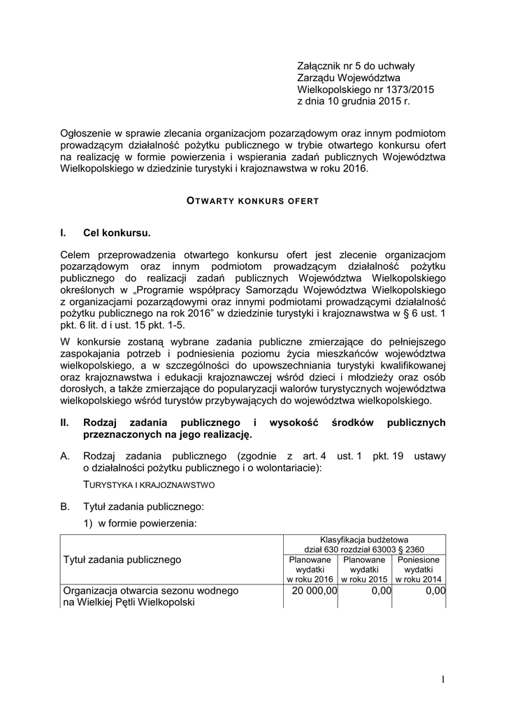 Załącznik nr 5 do uchwały Zarządu Województwa Wielkopolskiego nr 1373/2015 z dnia 10 grudnia 2015 r. Ogłoszenie w sprawie zlecania organizacjom pozarządowym oraz innym podmiotom prowadzącym działalność poŜytku publicznego w trybie otwartego konkursu ofert na realizację w formie powierzenia i wspierania zadań publicznych Województwa Wielkopolskiego w dziedzinie turystyki i krajoznawstwa w roku 2016. O T W AR T Y I. K O N K U R S O FE R T Cel konkursu. Celem przeprowadzenia otwartego konkursu ofert jest zlecenie organizacjom pozarządowym oraz innym podmiotom prowadzącym działalność poŜytku publicznego do realizacji zadań publicznych Województwa Wielkopolskiego określonych w „Programie współpracy Samorządu Województwa Wielkopolskiego z organizacjami pozarządowymi oraz innymi podmiotami prowadzącymi działalność poŜytku publicznego na rok 2016” w dziedzinie turystyki i krajoznawstwa w § 6 ust. 1 pkt. 6 lit. d i ust. 15 pkt. 1-5. W konkursie zostaną wybrane zadania publiczne zmierzające do pełniejszego zaspokajania potrzeb i podniesienia poziomu Ŝycia mieszkańców województwa wielkopolskiego, a w szczególności do upowszechniania turystyki kwalifikowanej oraz krajoznawstwa i edukacji krajoznawczej wśród dzieci i młodzieŜy oraz osób dorosłych, a takŜe zmierzające do popularyzacji walorów turystycznych województwa wielkopolskiego wśród turystów przybywających do województwa wielkopolskiego. II. Rodzaj zadania publicznego i przeznaczonych na jego realizację. wysokość A. Rodzaj zadania publicznego (zgodnie z art. 4 o działalności poŜytku publicznego i o wolontariacie): środków ust. 1 publicznych pkt. 19 ustawy TURYSTYKA I KRAJOZNAWSTWO B. Tytuł zadania publicznego: 1) w formie powierzenia: Tytuł zadania publicznego Organizacja otwarcia sezonu wodnego na Wielkiej Pętli Wielkopolski Klasyfikacja budŜetowa dział 630 rozdział 63003 § 2360 Planowane Planowane Poniesione wydatki wydatki wydatki w roku 2016 w roku 2015 w roku 2014 20 000,00 0,00 0,00 1 Szczegółowy opis zadania: Organizacja na terenie województwa wielkopolskiego jednodniowego (w sobotę lub niedzielę, w okresie od 16.04.2016 roku do 29.05.2016 roku) wydarzenia plenerowego: 1. będącego oficjalnym otwarciem sezonu wodnego na Wielkiej Pętli Wielkopolski (WPW), 2. integrującego miłośników turystyki wodnej (w szczególności: dzieci i młodzieŜ, osoby starsze i osoby z niepełnosprawnościami) oraz podmioty działające na rzecz rozwoju turystyki wodnej, 3. promującego walory turystyczne województwa wielkopolskiego, 4. promującego bezpieczne zachowania nad wodą, 5. zwracającego uwagę uczestników na potrzebę ochrony środowiska w obrębie rzek i znaczenia rzek w ekosystemie. Zadanie powinno składać się z części obejmujących atrakcje: 1. na lądzie (stoiska promocyjne / stoiska kulinarne / występy artystyczne / konkursy etc.), 2. na wodzie (spływy / pokazy ratownictwa wodnego etc.). Miejsce realizacji zadania: miejscowość połoŜona przy WPW (na terenie województwa wielkopolskiego). Razem: 20 000,00 0,00 0,00 2) w formie wspierania: Tytuł zadania publicznego Popularyzacja turystyki i krajoznawstwa oraz upowszechnianie wiedzy o walorach turystycznych województwa wielkopolskiego Zadanie moŜe być realizowane przez: I. Organizację imprez lub jednolitych tematycznie cykli imprez turystycznych i krajoznawczych o znaczeniu minimum ponadlokalnym, subregionalnym, wojewódzkim, ogólnopolskim i międzynarodowym promujących walory turystyczne województwa wielkopolskiego. Niniejszym zadaniem są objęte imprezy lub jednolite tematycznie cykle imprez turystycznych i krajoznawczych realizowane w całości na terenie województwa wielkopolskiego promujące: a) Wielkopolski System Szlaków Rowerowych, to jest imprezy realizowane na szlakach wchodzących w skład WSSR [wykaz szlaków wchodzących w skład WSSR oraz ich przebieg dostępny jest na stronie: www.gpswielkopolska.pl/na-rower], 2 Klasyfikacja budŜetowa dział 630 rozdział 63003 § 2360 Planowane Planowane Poniesione wydatki wydatki wydatki w roku 2016 w roku 2015 w roku 2014 135 000,00 110 000,00 113 531,76 b) Wielkopolski System Szlaków Pieszych, to jest imprezy realizowane na szlakach wchodzących w skład WSSP [wykaz szlaków wchodzących w skład WSSP oraz ich przebieg dostępny jest na stronie: www.umww.pl – ścieŜka dostępu: Urząd/Departamenty/Departament Sportu i Turystyki/ Wielkopolski System Szlaków Pieszych/Pliki do pobrania: „Znakowane szlaki Województwa Wielkopolskiego – ocena stanu istniejącego”], c) Wielką Pętlę Wielkopolski, to jest imprezy realizowane na szlaku wodnym WPW oraz jej dopływach, w granicach administracyjnych województwa wielkopolskiego [informacje o Wielkiej Pętli Wielkopolski dostępne są na stronie: www.wielka-petla.pl], d) Szlak Piastowski, to jest imprezy realizowane na Szlaku Piastowskim w jego nowym przebiegu, w granicach administracyjnych województwa wielkopolskiego, w szczególności nawiązujące do rocznicy Chrztu Polski [obowiązujący przebieg Szlaku Piastowskiego, przyjęty przez Radę Programowo-Naukową ds. Szlaku Piastowskiego, dostępny jest na stronie: http://tupowstalapolska.pl], e) miejsca pamięci Powstania Wielkopolskiego [wykaz miejsc dostępny jest w aplikacji „27 GRUDNIA”, którą moŜna bezpłatnie pobrać z oficjalnych sklepów: Google Play /Android/, App Store /iOS/], f) wykorzystanie dla turystyki linii wąskotorowych, drezyn oraz wolsztyńskich parowozów. Dodatkowe informacje: 1. W części III pkt. 7 oferty: „Miejsce realizacji zadania publicznego” naleŜy wskazać dokładne miejsce realizacji zadania, w tym szlak/trasę, na której realizowane będzie zadanie. Niewskazanie w ofercie dokładnego miejsca realizacji zadania będzie traktowane jako brak formalny. 2. W przypadku imprez turystycznych i krajoznawczych: pieszych, nordic walking, rowerowych, imprez na orientację oraz autokarowych naleŜy 