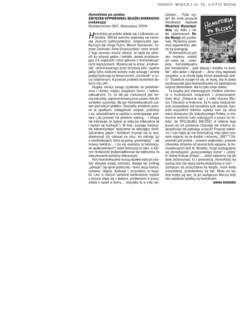 NIGDY WIĘCEJ nr 15, LATO 2006 Homofobia po polsku ZBYSZEK SYPNIEWSKI, BŁAŻEJ WARKOCKI (redakcja) Wydawnictwo SIC!, Warszawa 2004 omofobia po polsku składa się z kilkunastu arH tykułów. Wśród autorów pojawiają się nazwiska znanych publicystek(ów), działaczy(ek) spo- łecznych jak: Kinga Dunin, Marcin Starnawski, Tomasz Żukowski, Anna Gruszczyńska i wielu innych. Z tego powodu można założyć, że będą się odnosili do sytuacji gejów i lesbijek, jednak przytłaczająca ich większość mówi głównie o homoseksualnych mężczyznach. Wyłania się tu obraz „środowiska” zdominowanego przez brzydszą płeć, zupełne jakby tylko nieliczne kobiety mały odwagę i ochotę podjąć dyskusję na temat swoich „utrudnień” w życiu codziennym. A przecież problem homofobii dotyczy obu płci… Książka zwraca uwagę czytelnika na podobieństwa i różnice między związkami homo- i heteroseksualnymi. To, co dla par mieszanych jest rzeczą naturalną, zagwarantowaną przez prawo i tak absurdalnie oczywistą, dla par homoseksualnych czasem jest istnym piekłem. Chociażby problemy prawne ze spadkami, nielegalność związku, problemy z np. odwiedzinami w szpitalu u umierającego partnera („bo przecież nie jesteście rodziną… i nikogo nie interesuje, że żyjecie ze sobą już kilkanaście lat i bardzo się kochacie”). W imię „naszego tradycyjnie tolerancyjnego” spojrzenia na otaczający świat, zabraniamy gejom i lesbijkom trzymać się za ręce, obejmować czy całować na ulicy, nie mówiąc już o manifestacjach, które są jawną „prowokacją” – jak mówią niektórzy... I my się uważamy za tolerancyjne społeczeństwo?! Jeżeli tolerancja to stan, w którym mniejszość podporządkowuje się większości, to zdecydowanie jesteśmy tolerancyjni. Pary homoseksualne muszą zaciekle walczyć o każdy skrawek swojej wolności, dlatego też próbują „pokazać” się opinii publicznej – temu służą marsze, wystawy, zdjęcia, dyskusje i, oczywiście, ta książka. Lecz w naszym państwie każdorazowe wyjście z ukrycia wiąże się z atakami, problemami w pracy, szkole a nawet w domu… wszystko to w imię mo- ralności… Tylko czyjej? Bo mnie poczucie moralności bojówek Młodzieży Wszechpolskiej czy babć z kółek różańcowych Radia Maryja nie przekonuje. Wystarczy posłuchać argumentów, jakimi się posługują. W Homofobii po polsku możemy znaleźć ich wiele, np.: „orientacja homoseksualna jest nienaturalna”, „geje skaczą z kwiatka na kwiatek”, albo jeden z lepszych – „teraz chcą legalizacji związków, a za chwilę będą chcieli adoptować dzieci”. Osobiście wydaje mi się, że lepiej, aby te dzieci wychowywała para homoseksualna niż patologiczna rodzina alkoholików. Ale to tylko moje zdanie. Ta książka jest interesującym źródłem informacji o trudnościach związanych z przeprowadzeniem akcji „Zobaczcie nas”, o całej otoczce Marszu Tolerancji w Krakowie. Są to opisy bezpośrednich uczestników lub świadków tych zdarzeń. Spośród wszystkich tekstów wyłania nam się obraz nieco dziwaczny dla statystycznego Polaka, a mianowicie widzimy ludzi walczących o prawo do miłości, do OFICJALNEJ MIŁOŚCI. A właśnie tego prawa się ich pozbawia. Dlaczego nie chcemy zaakceptować tak pięknego uczucia? Przecież niektórzy z nas nigdy go nie doświadczą, więc jakim prawem stajemy im na drodze i mówimy: „NIE!”? Odpowiedź jest prosta – prawem większości, prawem człowieka, któremu od zawsze było wpajane, że homoseksualizm jest fe. Niestety, wciąż posługujemy się stereotypami „puszczalskiego homo” i „lesbijki, której brakuje chłopa”… Jeżeli będziemy się tak dalej zachowywać, to z pewnością „Homofobia ma szansę stać się naszą marką eksportową w Unii...”. Zachęcam do przeczytania tej książki, może kiedy zrozumiemy, przestaniemy się bać. Może nie będzie trzeba się bać, że po następnym Marszu ktoś nas zaatakuje butelką czy kamieniem. ANNA KONSEK