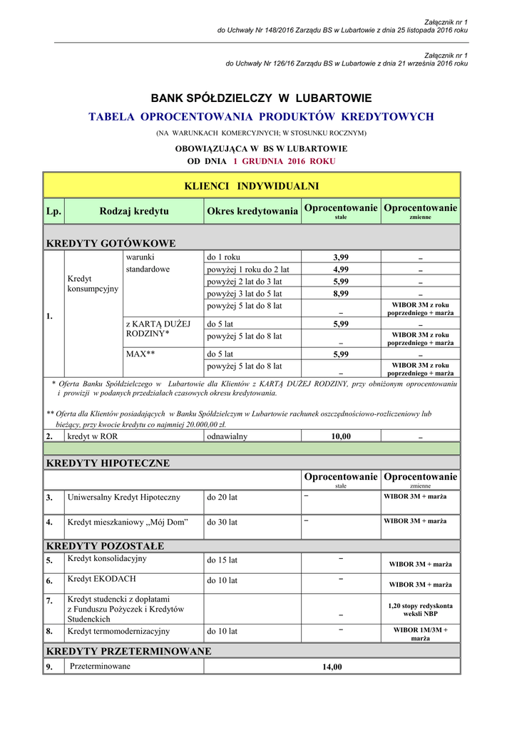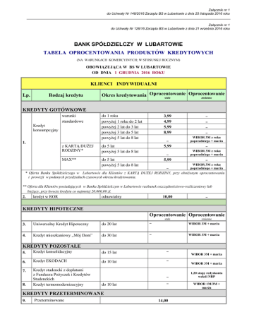 Załącznik nr 1 do Uchwały Nr 148/2016 Zarządu BS w Lubartowie z dnia 25 listopada 2016 roku Załącznik nr 1 do Uchwały Nr 126/16 Zarządu BS w Lubartowie z dnia 21 września 2016 roku BANK SPÓŁDZIELCZY W LUBARTOWIE TABELA OPROCENTOWANIA PRODUKTÓW KREDYTOWYCH (NA WARUNKACH KOMERCYJNYCH; W STOSUNKU ROCZNYM) OBOWIĄZUJĄCA W BS W LUBARTOWIE OD DNIA 1 GRUDNIA 2016 ROKU KLIENCI INDYWIDUALNI Lp. Rodzaj kredytu Oprocentowanie Okres kredytowania Oprocentowanie stałe zmienne KREDYTY GOTÓWKOWE warunki standardowe do 1 roku powyżej 1 roku do 2 lat powyżej 2 lat do 3 lat powyżej 3 lat do 5 lat powyżej 5 lat do 8 lat 3,99 4,99 5,99 8,99 z KARTĄ DUŻEJ RODZINY* do 5 lat powyżej 5 lat do 8 lat 5,99 MAX** do 5 lat powyżej 5 lat do 8 lat 5,99 Kredyt konsumpcyjny 1. WIBOR 3M z roku poprzedniego + marża WIBOR 3M z roku poprzedniego + marża WIBOR 3M z roku poprzedniego + marża * Oferta Banku Spółdzielczego w Lubartowie dla Klientów z KARTĄ DUŻEJ RODZINY, przy obniżonym oprocentowaniu i prowizji w podanych przedziałach czasowych okresu kredytowania. ** Oferta dla Klientów posiadających w Banku Spółdzielczym w Lubartowie rachunek oszczędnościowo-rozliczeniowy lub bieżący, przy kwocie kredytu co najmniej 20.000,00 zł. 2. kredyt w ROR odnawialny 10,00 KREDYTY HIPOTECZNE Oprocentowanie Oprocentowanie stałe 3. Uniwersalny Kredyt Hipoteczny do 20 lat 4. Kredyt mieszkaniowy ,,Mój Dom” do 30 lat zmienne WIBOR 3M + marża WIBOR 3M + marża KREDYTY POZOSTAŁE 5. Kredyt konsolidacyjny do 15 lat 6. Kredyt EKODACH do 10 lat 7. Kredyt studencki z dopłatami z Funduszu Pożyczek i Kredytów Studenckich Kredyt termomodernizacyjny 8. do 10 lat KREDYTY PRZETERMINOWANE 9. Przeterminowane 14,00 WIBOR 3M + marża WIBOR 3M + marża 1,20 stopy redyskonta weksli NBP WIBOR 1M/3M + marża Załącznik nr 1 do Uchwały Nr 148/2016 Zarządu BS w Lubartowie z dnia 25 listopada 2016 roku Załącznik nr 1 do Uchwały Nr 126/16 Zarządu BS w Lubartowie z dnia 21 września 2016 roku KLIENCI INSTYTUCJONALNI Lp. Rodzaj kredytu Działalność 1. 2. 3. 4. obrotowy w rachunku bieżącym obrotowy w rachunku kredytowym płatniczy rewolwingowy 5. inwestycyjny Okres kredytowania Oprocentowanie (zmienne) pozarolnicza do 1 roku do 1 roku do 30 dni do 3 lat 8,50 8,50 8,50 8,50 WIBOR 1M + marża WIBOR 1M + marża WIBOR 1M + marża WIBOR 1M + marża do 2 lat powyżej 2 lat 7,90 WIBOR 1M + marża 8,90 WIBOR 1M + marża 7,90 WIBOR 1M + marża 8,50 WIBOR 1M + marża WIBOR 1M + marża 6. kredytowa linia hipoteczna 7. pożyczka do 10 lat do 1 roku 8. inwestycyjny Unia Biznes do 15 lat 7,90 9. termomodernizacyjny do 10 lat 7,90 10. inwestycyjny ,,Wspólny remont” kredyt z dotacją na zakup kolektorów słonecznych do 10 lat 7,90 11. 12. technologiczny z premią technologiczną BGK 13. przeterminowane WIBOR 3M + marża do 10 lat do 2 lat powyżej 2 lat WIBOR 1M/3M + marża WIBOR 1M + marża 7,90 WIBOR 1M + marża 8,90 WIBOR 1M + marża 14,00 Działalność rolnicza 1. 2. obrotowy w rachunku bieżącym debet w rachunku ROL-Konto 3. obrotowy w rachunku kredytowym 4. 5. płatniczy rewolwingowy 6. inwestycyjny 7. kredytowa linia hipoteczna 8. do 1 roku 8,50 do 1 roku do 2 lat do 30 dni do 3 lat do 5 lat powyżej 5 lat 8,50 9,50 8,50 8,50 9,00 9,50 WIBOR 1M + marża 10,00 WIBOR 1M + marża WIBOR 1M + marża WIBOR 1M + marża WIBOR 1M + marża WIBOR 1M + marża WIBOR 1M + marża 7,90 WIBOR 1M + marża pożyczka do 10 lat do 1 roku 8,50 WIBOR 1M + marża 9. inwestycyjny Unia Biznes do 15 lat 7,90 WIBOR 1M + marża 10. na zakup rzeczowych środków i usług do produkcji rolniczej do 1 roku 11. przeterminowane 8,90 14,00