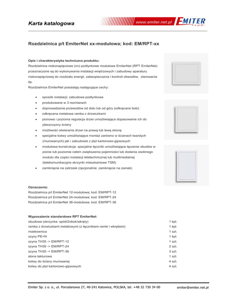 Karta katalogowa ___________________________________________________________________________ Rozdzielnica p/t EmiterNet xx-modułowa; kod: EM/RPT-xx Opis i charakterystyka techniczna produktu: Rozdzielnice niskonapięciowe (nn) podtynkowe modułowe EmiterNet (RPT EmiterNet) przeznaczone są do wykonywania instalacji wnętrzowych i zabudowy aparatury niskonapięciowej do rozdziału energii, zabezpieczania i kontroli obwodów, sterowania itp. Rozdzielnice EmiterNet posiadają następujące cechy: sposób instalacji: zabudowa podtynkowa produkowane w 3 rozmiarach doprowadzenie przewodów od dołu lub od góry (odkręcane boki) odkręcana metalowa ramka z drzwiczkami pionowa i pozioma regulacja drzwi umożliwiająca dopasowanie ich do płaszczyzny ściany możliwość otwierania drzwi na prawą lub lewą stronę specjalne kotwy umożliwiające montaż zarówno w ścianach twardych (murowanych) jak i zabudowie z płyt kartonowo-gipsowych modułowa konstrukcja: specjalne łączniki umożliwiające łączenie obudów w pionie lub poziomie celem zwiększenia pojemności lub dodania osobnego modułu dla części instalacji teletechnicznej lub multimedialnej (telekomunikacyjne skrzynki mieszkaniowe TSM) zamknięcie na zatrzask (opcjonalnie: zamknięcie na zamek) Oznaczenia: Rozdzielnica p/t EmiterNet 12-modułowa; kod: EM/RPT-12 Rozdzielnica p/t EmiterNet 24-modułowa; kod: EM/RPT-24 Rozdzielnica p/t EmiterNet 36-modułowa; kod: EM/RPT-36 Wyposażenie standardowe RPT EmiterNet: obudowa (skrzynka: spód/2xbok/wkręty) 1 kpl. ramka z drzwiczkami metalowymi (z łącznikiem ramki i wkrętami) 1 kpl. maskownica 1 szt. szyny PE+N 1 kpl. szyna TH35 -> EM/RPT-12 1 szt. szyna TH35 -> EM/RPT-24 2 szt. szyna TH35 -> EM/RPT-36 3 szt. słona tekturowa 1 szt. kotwy do ściany murowanej 4 szt. kotwy do płyt kartonowo-gipsowych 4 szt. Emiter Sp. z o. o., ul. Porcelanowa 27, 40-241 Katowice, POLSKA, tel. +48 32 730 34 00 [email protected] Karta katalogowa Osprzęt dodatkowy: EM/TSM-ZAM Zamek do TSM Opcjonalne moduły telekomunikacyjnych skrzynek mieszkaniowych: EM/TSM-1 Telekomunikacyjna skrzynka mieszkaniowa EmiterNet typ I EM/TSM-2 Telekomunikacyjna skrzynka mieszkaniowa EmiterNet typ II EM/TSM-3 Telekomunikacyjna skrzynka mieszkaniowa EmiterNet typ III Parametry elektryczne: Rodzaj prądu: AC, 50 Hz Znamionowy prąd ciągły: In < 100A Znamionowe napięcie izolacji - 500V Znamionowe napięcie łączeniowe - 400V Znamionowe napięcie udarowe Uimp - 4000V Klasa ochronności – II Stopień ochrony: IP30 Parametry techniczne: kolor: biały RAL 9003 wykonanie: obudowa (skrzynka) z uniepalnionego tworzywa sztucznego, odkręcana metalowa ramka z drzwiczkami montaż: p/t w ścianach twardych lub płytach k-g temperatura otoczenia: 0oC do +40Oc warunki eksploatacji: wilgotność: do 50% wymiary (szer x wys x gł): wymiary zewnętrzne typ szer. [mm] wys. [mm] gł. [mm] EM/RPT-12 355 317 90+5 (*) EM/RPT-24 355 442 90+5 (*) EM/RPT-36 355 592 90+5 (*) Certyfikaty: deklaracja zgodności Dołożyliśmy wszelkich starań, aby przedstawione informacje były rzetelne i kompletne. Jednak nie ponosimy odpowiedzialności za dokładność i kompletność danych oraz w szczególności nie możemy zagwarantować, że niniejsza specyfikacja nie zawiera błędów lub pomyłek. Informacje zawarte w niniejszej specyfikacji mogą zostać zmienione w każdej chwili bez powiadomienia. Emiter Sp. z o. o., ul. Porcelanowa 27, 40-241 Katowice, POLSKA, tel. +48 32 730 34 00 [email protected]