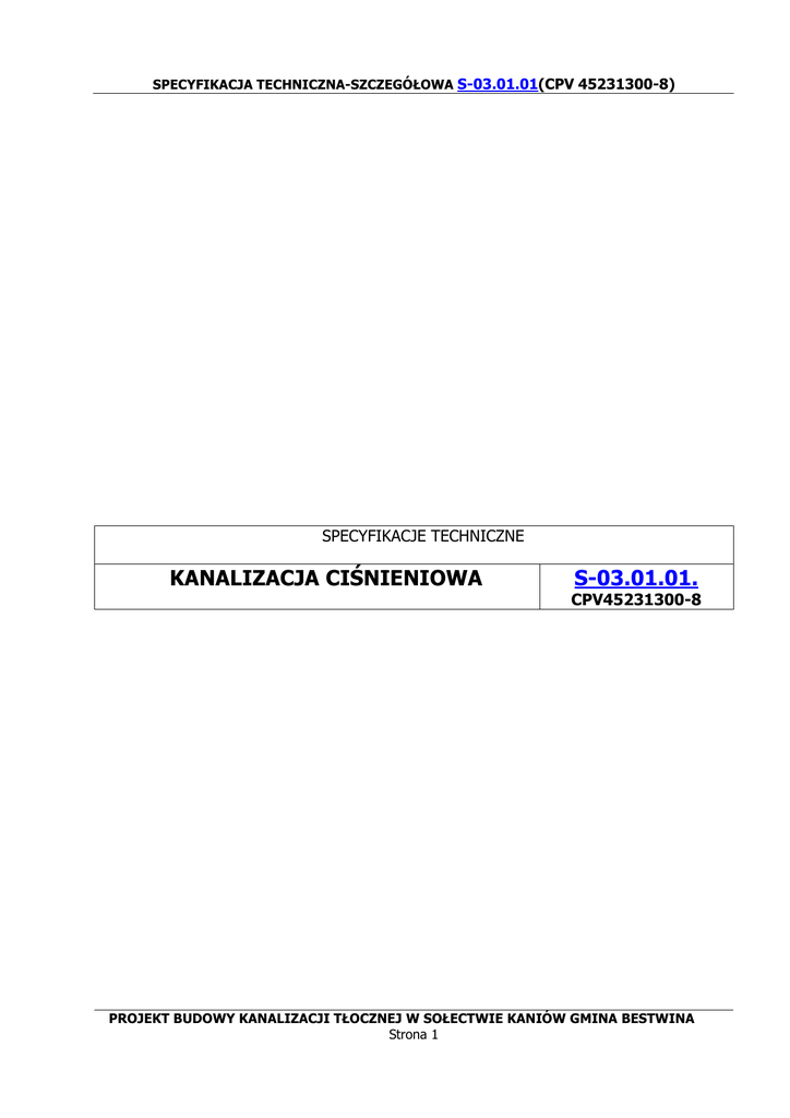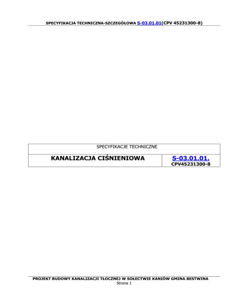 SPECYFIKACJA TECHNICZNA-SZCZEGÓŁOWA S-03.01.01(CPV 45231300-8) SPECYFIKACJE TECHNICZNE KANALIZACJA CIŚNIENIOWA S-03.01.01. CPV45231300-8 PROJEKT BUDOWY KANALIZACJI TŁOCZNEJ W SOŁECTWIE KANIÓW GMINA BESTWINA Strona 1 SPECYFIKACJA TECHNICZNA-SZCZEGÓŁOWA S-03.01.01(CPV 45231300-8) SPIS TREŚCI 1. Część ogólna .......................................................................................................... 4 1.1. Nazwa nadana zamówieniu przez Zamawiającego oraz nazwa specyfikacji.................................................................4 1.2. Przedmiot i zakres robót objętych szczegółową Specyfikacją Techniczną ...................................................................4 1.3. Zakres stosowania SST ..............................................................................................................................4 1.4. Ogólne wymagania dotyczące robót ...............................................................................................................4 2. Wymagania szczegółowe dotyczące właściwości wyrobów budowlanych .................................. 5 2.1. Ogólne wymagania dotyczące materiałów........................................................................................................5 Rozwiązania techniczne, materiał, długości sieci.......................................................................................... 5 2.1.1. Rury ochronne (osłonowe)............................................................................................................ 6 2.1.2. Węzły funkcyjne na kolektorze ciśnieniowym...................................................................................... 6 2.1.3. Beton ..................................................................................................................................... 7 2.2. Zaprawa cementowa .................................................................................................................................7 2.3. Piasek na podsypki i obsypki rur ...................................................................................................................7 2.4. Materiały izolacyjne ..................................................................................................................................7 2.5. Składowanie materiałów.............................................................................................................................7 2.5.1. Rury kanałowe .......................................................................................................................... 7 2.5.2. Kruszywo................................................................................................................................. 8 2.6. Odbiór materiałów na budowie .....................................................................................................................8 2.7. Jakość materiałów ....................................................................................................................................8 3. Wymagania szczegółowe dotyczące sprzętu i maszyn do wykonania robót budowlanych ............... 8 4. Wymagania dotyczące środków transportu...................................................................... 9 4.1. Rury kanałowe ........................................................................................................................................9 4.2. Płyty pokrywowe......................................................................................................................................9 4.3. Kruszywo ...............................................................................................................................................9 5. Wymagania szczegółowe dotyczące właściwości wykonania robót budowlanych ......................... 9 5.1. Ogólne zasady wykonania robót ...................................................................................................................9 5.2. Roboty przygotowawcze ...........................................................................................................................10 5.2.1. Wytyczenie trasy i punktów wysokościowych.................................................................................... 10 5.2.2. Wycinka drzew i krzewów........................................................................................................... 10 5.2.3. Usunięcie warstwy humusu ......................................................................................................... 10 5.2.4. Usunięcie i odbudowa elementów dróg, ogrodzeń.............................................................................. 10 5.2.5. Lokalizacja istniejącego uzbrojenia ................................................................................................ 10 5.2.6. Ocena stanu technicznego budynków............................................................................................. 10 5.3. Roboty ziemne ......................................................................................................................................10 5.4. Przygotowanie podłoŜa (podsypki)...............................................................................................................11 5.5. Roboty montaŜowe .................................................................................................................................11 5.5.1. Ogólne warunki układania i montaŜu przewodów............................................................................... 11 5.5.2. Spadki, głębokość posadowienia umieszczenie względem uzbrojenia podziemnego ...................................... 12 5.5.3. Układanie przewodu na dnie wykopu ............................................................................................. 13 5.5.4. Ocieplenie rurociągów ...................................