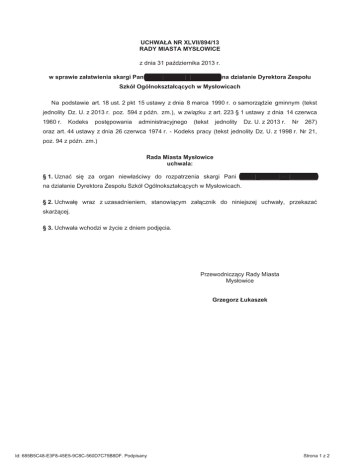 UCHWAŁA NR XLVII/894/13 RADY MIASTA MYSŁOWICE z dnia 31 października 2013 r. w sprawie załatwienia skargi Pani Marty Wojnar - Wysockiej na działanie Dyrektora Zespołu Szkół Ogólnokształcących w Mysłowicach Na podstawie art. 18 ust. 2 pkt 15 ustawy z dnia 8 marca 1990 r. o samorządzie gminnym (tekst jednolity Dz. U. z 2013 r. poz. 594 z późn. zm.), w związku z art. 223 § 1 ustawy z dnia 14 czerwca 1960 r. Kodeks postępowania administracyjnego (tekst jednolity Dz. U. z 2013 r. Nr 267) oraz art. 44 ustawy z dnia 26 czerwca 1974 r. - Kodeks pracy (tekst jednolity Dz. U. z 1998 r. Nr 21, poz. 94 z późn. zm.) Rada Miasta Mysłowice uchwala: § 1. Uznać się za organ niewłaściwy do rozpatrzenia skargi Pani Marty Wojnar - Wysockiej na działanie Dyrektora Zespołu Szkół Ogólnokształcących w Mysłowicach. § 2. Uchwałę wraz z uzasadnieniem, stanowiącym załącznik do niniejszej uchwały, przekazać skarżącej. § 3. Uchwała wchodzi w życie z dniem podjęcia. Przewodniczący Rady Miasta Mysłowice Grzegorz Łukaszek Id: 685B5C48-E3F8-45E5-9C8C-560D7C75B8DF. Podpisany Strona 1 z 2 Id: 685B5C48-E3F8-45E5-9C8C-560D7C75B8DF. Podpisany 8FKZDáD ]RVWDáD SRGMĊWD MHGQRJáRĞQLH Strona 2 z 2 L3U]HVWU]HJDQLD 3UDZD 5DGD 0LDVWD 0\VáRZLFH X]QDáD VLĊ ]D RUJDQ QLHZáDĞFLZ\ GR UR]SDWU]HQLD VNDUJL 1D VHVML ZGQLX SDĨG]LHUQLND U SR SU]HGVWDZLHQLX UHNRPHQGDFML .RPLVML 6DPRU]ąGQRĞFL QLHZáDĞFLZ\ GR UR]SDWU]HQLD VNDUJL JáRVDPL ]D MHGQRJáRĞQLH SRVWDQRZLáD UHNRPHQGRZDü 5DG]LH 0LDVWD X]QDQLH VLĊ ]D RUJDQ SDĨG]LHUQLND U .RPLVMD SR ]DSR]QDQLX VLĊ ]SU]HGPLRWHP L]DNUHVHP VNDUJL ZJáRVRZDQLX 6NDUJD ]RVWDáD SU]HGVWDZLRQD QD SRVLHG]HQLX .RPLVML 6DPRU]ąGQRĞFL L3U]HVWU]HJDQLD 3UDZD ZGQLX ZVND]DQR ĪH SUDFRZQLN PRĪH ZQLHĞü RGZRáDQLH RG Z\SRZLHG]HQLD XPRZ\ RSUDFĊ GR VąGX SUDF\ VSUDZ SU]HGVWDZLRQ\FK Z]áRĪRQHM VNDUG]H ]DVWRVRZDQLH ]QDMGXMH DUWNRGHNVXSUDF\ ZNWyU\P SU]HSLVyZ V]F]HJyOQ\FK ]DZDUWH ZXVWDZLH ]GQLD F]HUZFD U .RGHNV SUDF\ 'R NDWHJRULL Z\NUDF]DMąF\FK SR]D MHM ZáDĞFLZRĞü :RPDZLDQHM VNDUG]H ]DVWRVRZDQLH ]QDMGXMą XUHJXORZDQLD UDGD JPLQ\ 5DGD 0LDVWD 0\VáRZLFH QLHMHVW RUJDQHP XSUDZQLRQ\P GRUR]SDWU\ZDQLD VSUDZ V]F]HJyOQH QLHRNUHVODMą LQQ\FK RUJDQyZ ZáDVFLZ\FK GR UR]SDWU\ZDQLD VNDUJ RUJDQHP ZáDĞFLZ\P MHVW 5HJXODFMH DUWSNW NRGHNVX SRVWĊSRZDQLD DGPLQLVWUDF\MQHJR VWDQRZLą ĪH MH]HOL SU]HSLV\ RUJDQ\ VDPRU]ąGX WHU\WRULDOQHJR UR]SDWUXMą RUD] ]DáDWZLDMą VNDUJL ZUDPDFK VZRMHM ZáDVFLZRĞFL F]HUZFD U .RGHNV SRVWĊSRZDQLD DGPLQLVWUDF\MQHJR WHNVW MHGQROLW\ ']8]U 1U VNDUJL RUD] ZVND]DQR WHUPLQ ZMDNLP VNDUJD ]RVWDQLH ]DáDWZLRQD =JRGQLH ]DUWXVWDZ\ ]GQLD 3LVPHP ]GQLD SDĨG]LHUQLND U VNLHURZDQR GR VNDUĪąFHMLQIRUPDFMĊ RVSRVRELH ]DáDWZLHQLD QDQLHZáDĞFLZLH SU]HSURZDG]RQą SURFHGXUĊ Z\SRZLHG]HQLD XPRZ\ RSUDFĊ áąF]ąFHJR VNDUĪąFą ]=HVSRáHP 6]Nyá 2JyOQRNV]WDáFąF\FK :X]DVDGQLHQLX VNDUĪąFD ZVND]DáD ]DU]XWyZ VNDUJL MHVW QDUXV]HQLH LQWHUHVyZ VNDUĪąFHM Z]DNUHVLH VSUDZ Z\QLNDMąF\FK ]H VWRVXQNX SUDF\ :\VRFNLHMQDG]LDáDQLH '\UHNWRUD =HVSRáX 6]Nyá 2JyOQRNV]WDáFąF\FK Z0\VáRZLFDFK 3U]HGPLRWHP : GQLX SDĨG]LHUQLND U GR 5DG\ 0LDVWD 0\VáRZLFH ZSá\QĊáD VNDUJD 3DQL 0DUW\ :RMQDU 8]DVDGQLHQLH